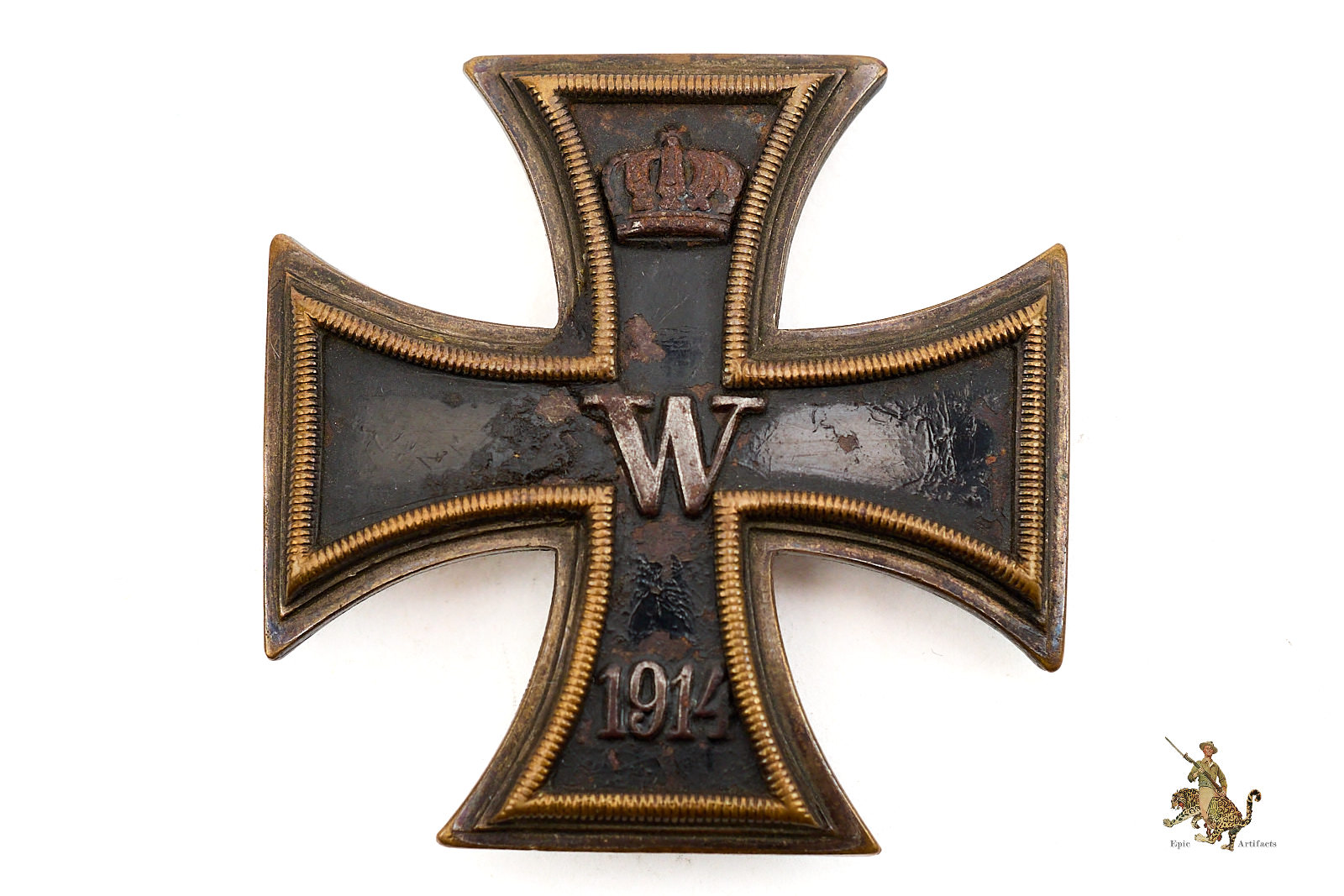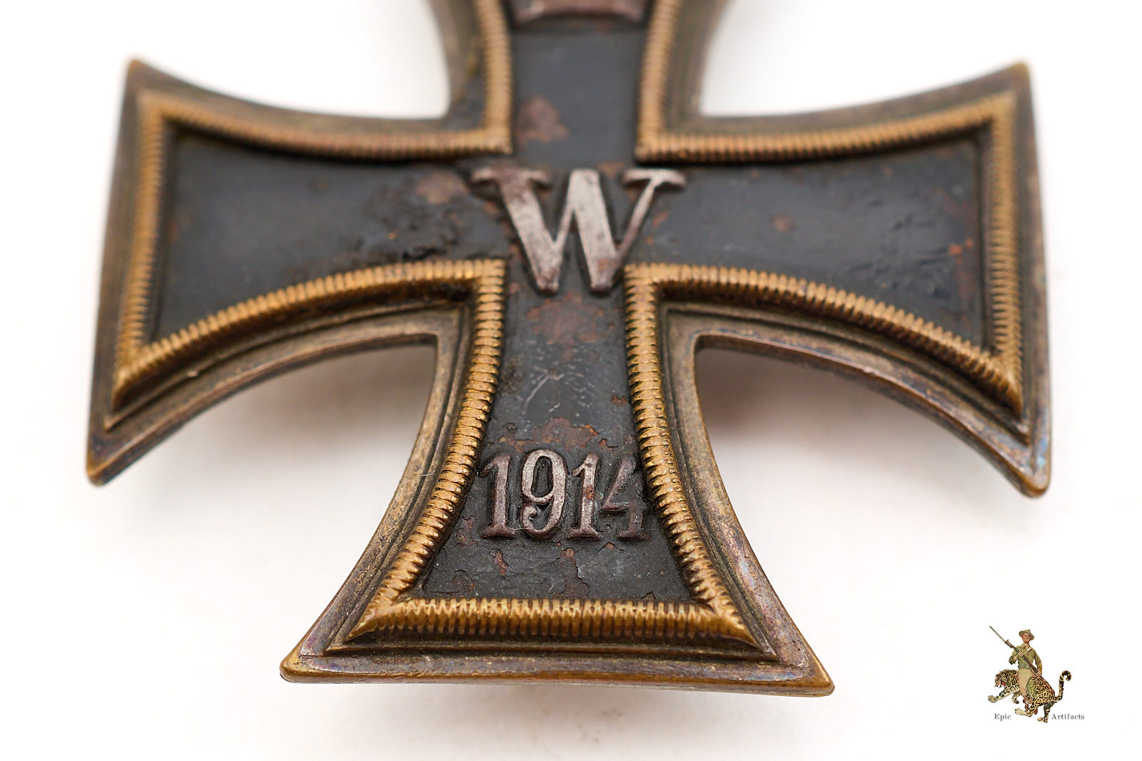 Product Description: A highly desirable and finely preserved 1914 Iron Cross 1st Class in excellent condition. The obverse retains a substantial amount of its original blackened finish, showing paint wear to the high points, entirely consistent with age and careful preservation. This example is of particular note as a wartime WWI manufactured.