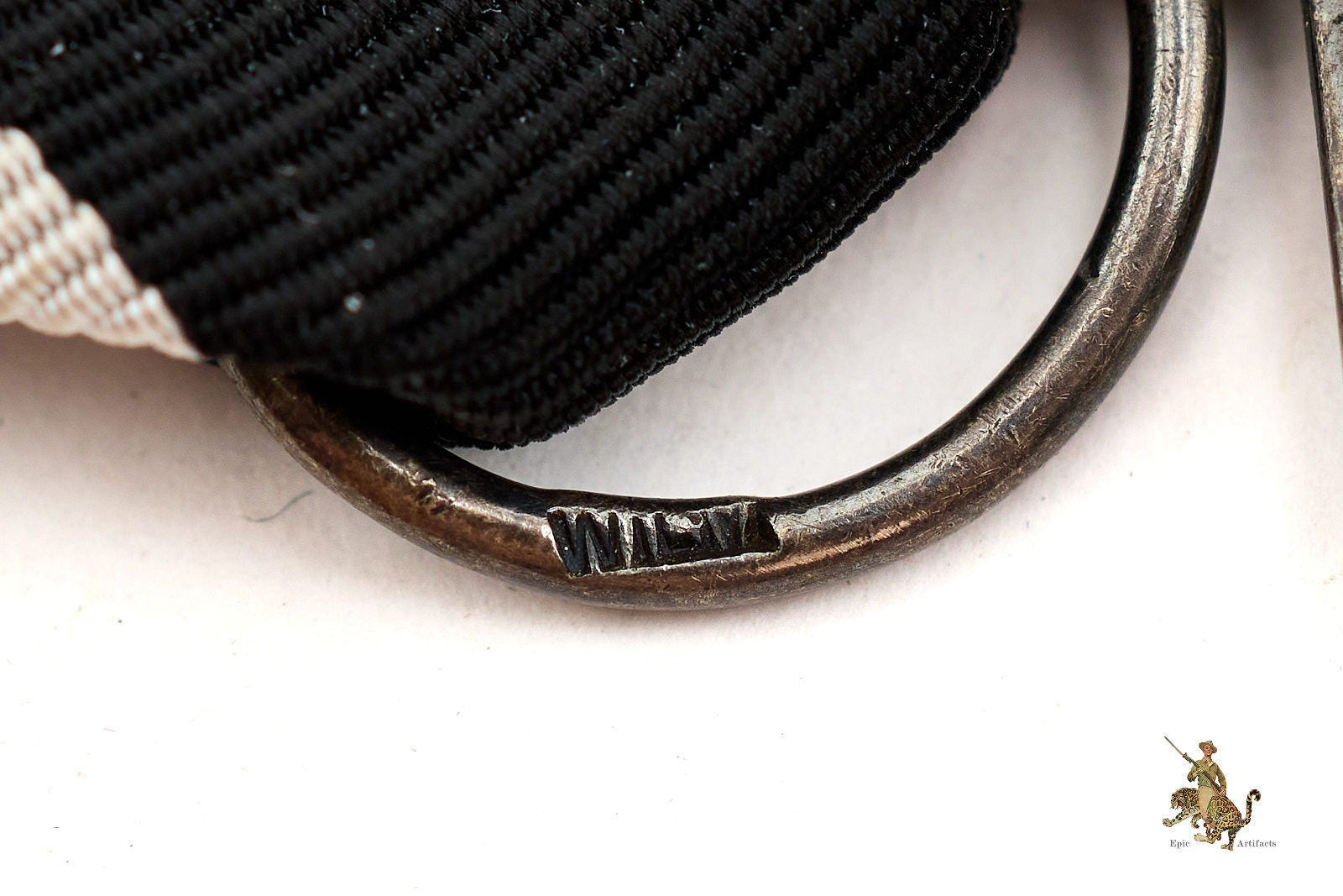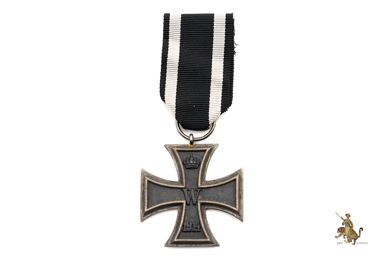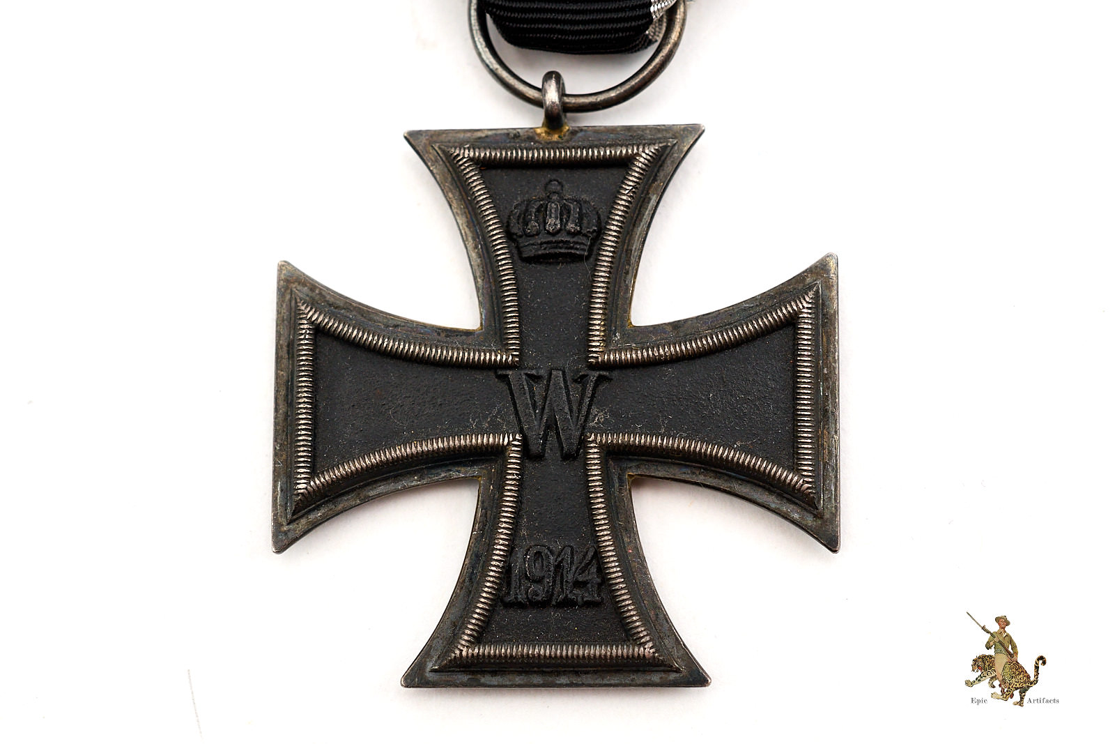 Product Description: An exceptional example of a 1914 Iron Cross 2nd Class – Wilm. This medal is marked “Wilm” for H.R. Wilm, a respected maker. The cross itself presents with a deep, even patina to the silver frame and retains nearly all of its original black paint to the iron core, an increasingly rare feature in awards of this vintage. The original ribbon remains in and shows only minor wear, with strong color and no fraying or tears.