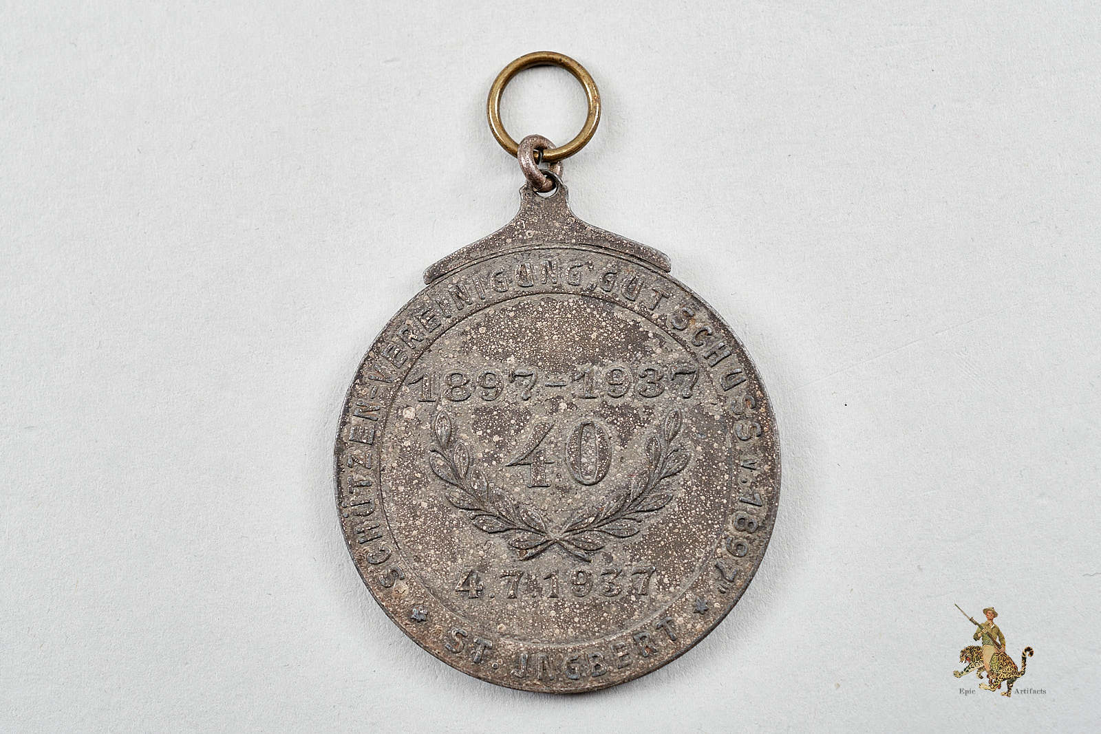 Product Description:  A commemorative 1937 German Shooting Club Medal – St. Ingbert, issued to mark 40 years of marksmen’s association tradition. This medal likely celebrates the longstanding history of a local shooting club in St. Ingbert, reflecting the enduring cultural importance of Schützenvereine in German civic life.