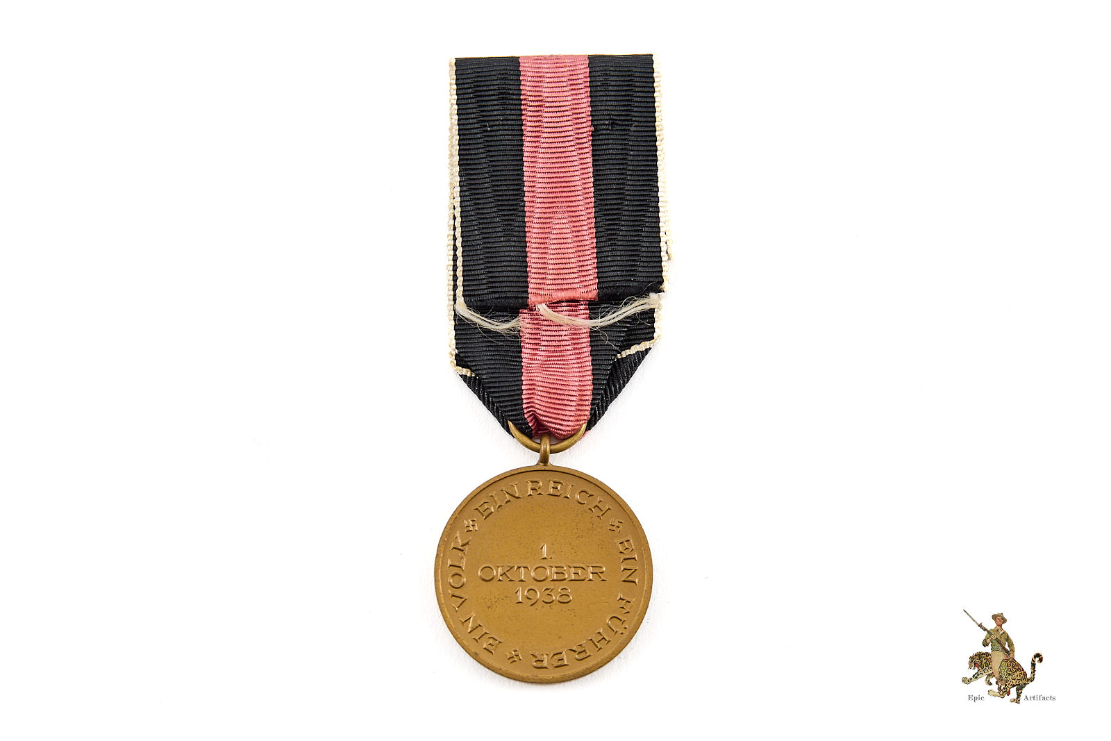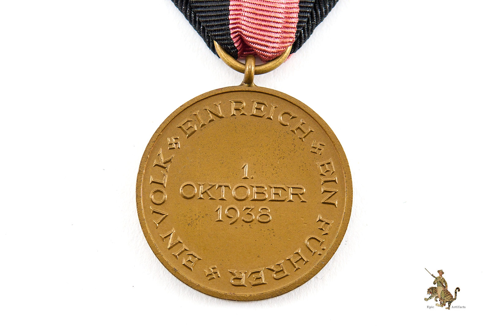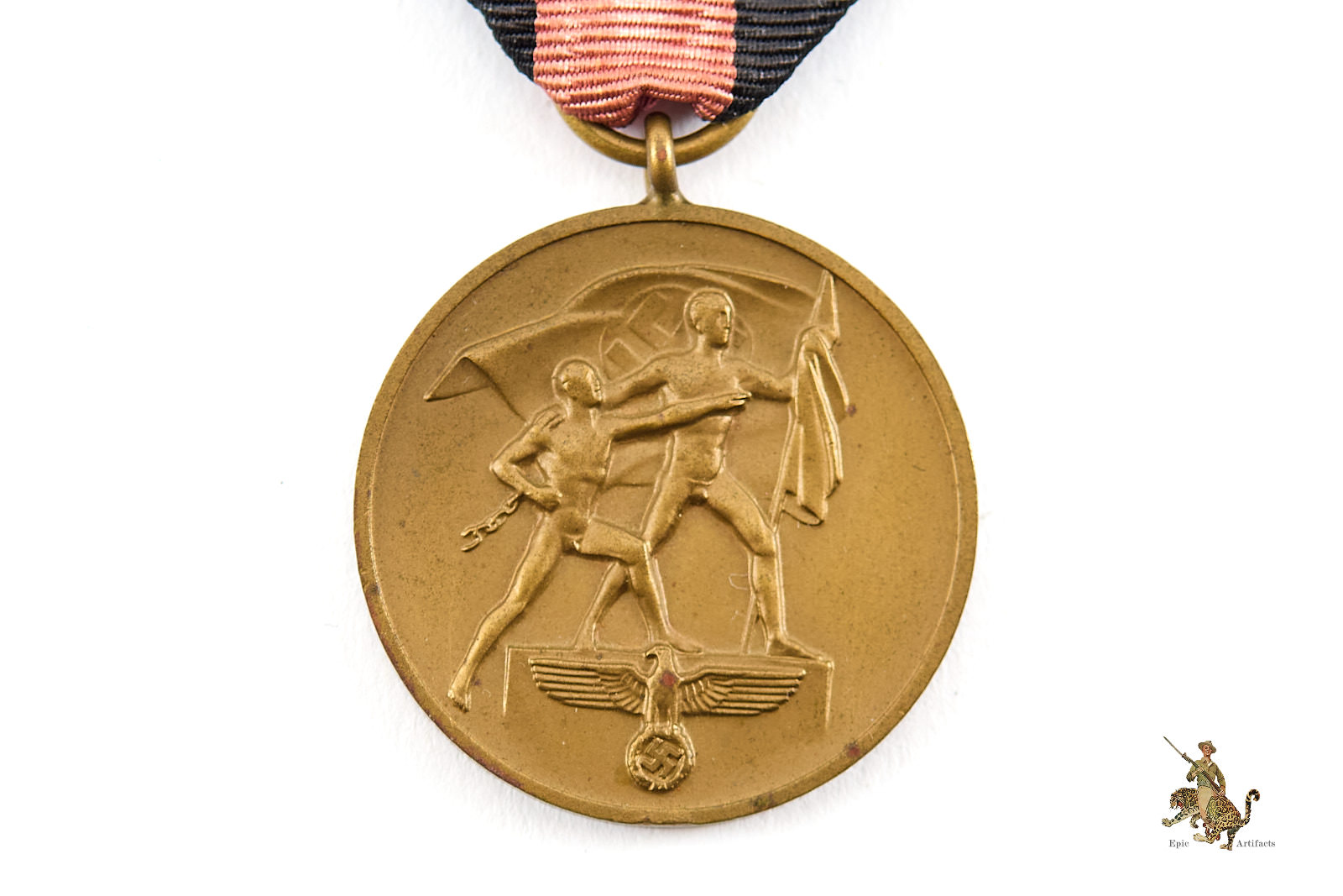Historical Description: In 1938 and 1939, a triumphant, ascendant Germany used a combination of political/diplomatic pressure and military operations/threats to annex and occupy (or re-occupy) areas that were to become part of the Greater German Reich. To recognize these successes, the German government instituted a series of three medals, known as the German Occupation Medals (or “Flower War Medals). There were three of these awards, all with the same obverse design. They were designed by Professor Richard Klein of Munich, and featured two nude men, one bearing a Nazi flag, ascending a podium with the German eagle and swastika emblem. Each of the three different awards had a different date on the reverse (the date of the event each commemorated), and each had a different ribbon. The first of these medals to be instituted was the medal for the Austrian Anschluss, which appeared on May 1, 1938, and bore the date “13. März 1938.” It had a silver finish, and a red ribbon with white-black-white stripes at the edges. The next “Flower War” medal to be instituted, and the one awarded in the greatest numbers, came on October 18, 1938, to commemorate the occupation of the Sudetenland on October 1. It had a bronze finish and a red and black ribbon. The reverse of each of these bore the lettering “Ein Volk, Ein Reich, Ein Führer” (One People, One Nation, One Leader” with German swastika emblems and the date of institution of the award. The last of these medals, the “Memel Medal,” was authorized on May 1, 1939, and commemorated the return of the Memel Territory on March 22, 1939. This medal had a different reverse, a bronze finish, and a ribbon with white, red, and green stripes. This medal was only awarded 31,322 times (compared to 318,689 awards of the Anschluss medal and 1,162,617 awards of the Sudetenland medal). Issue of “Flower Wars” medals ceased at the end of 1940.
