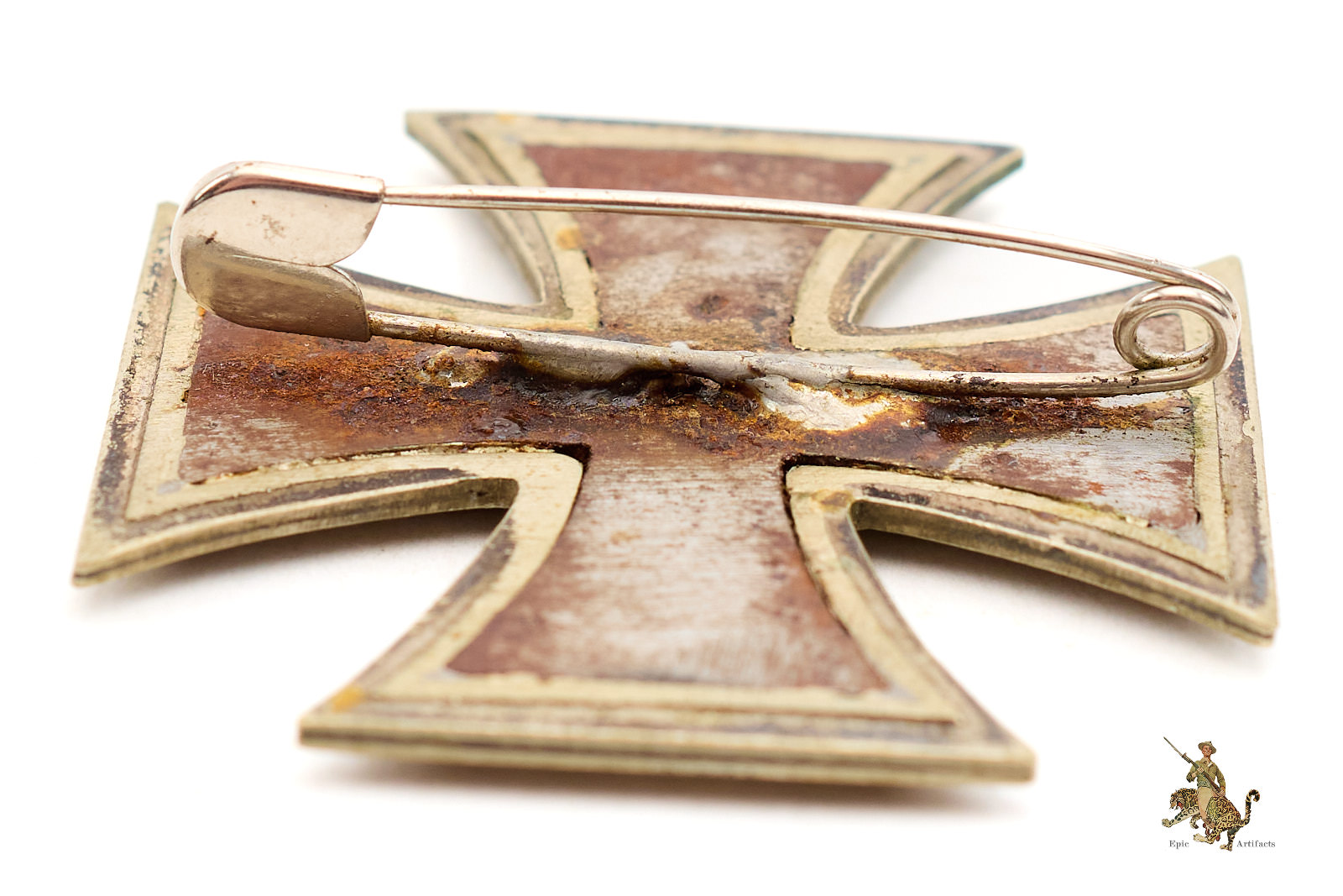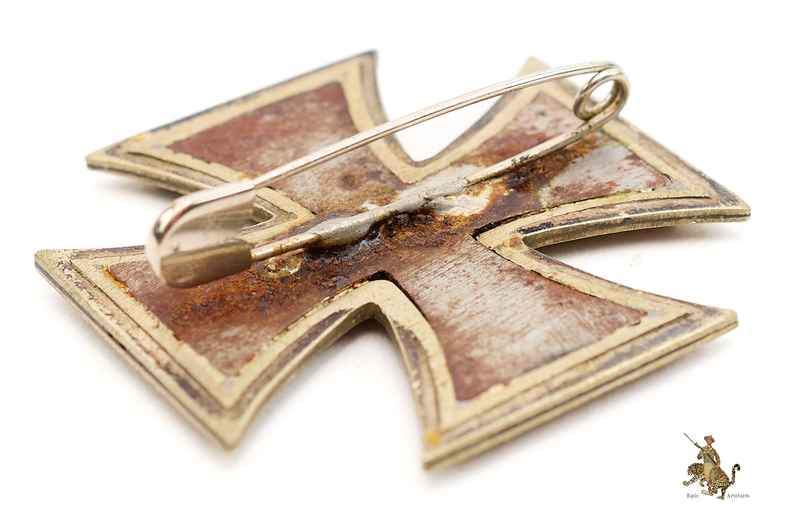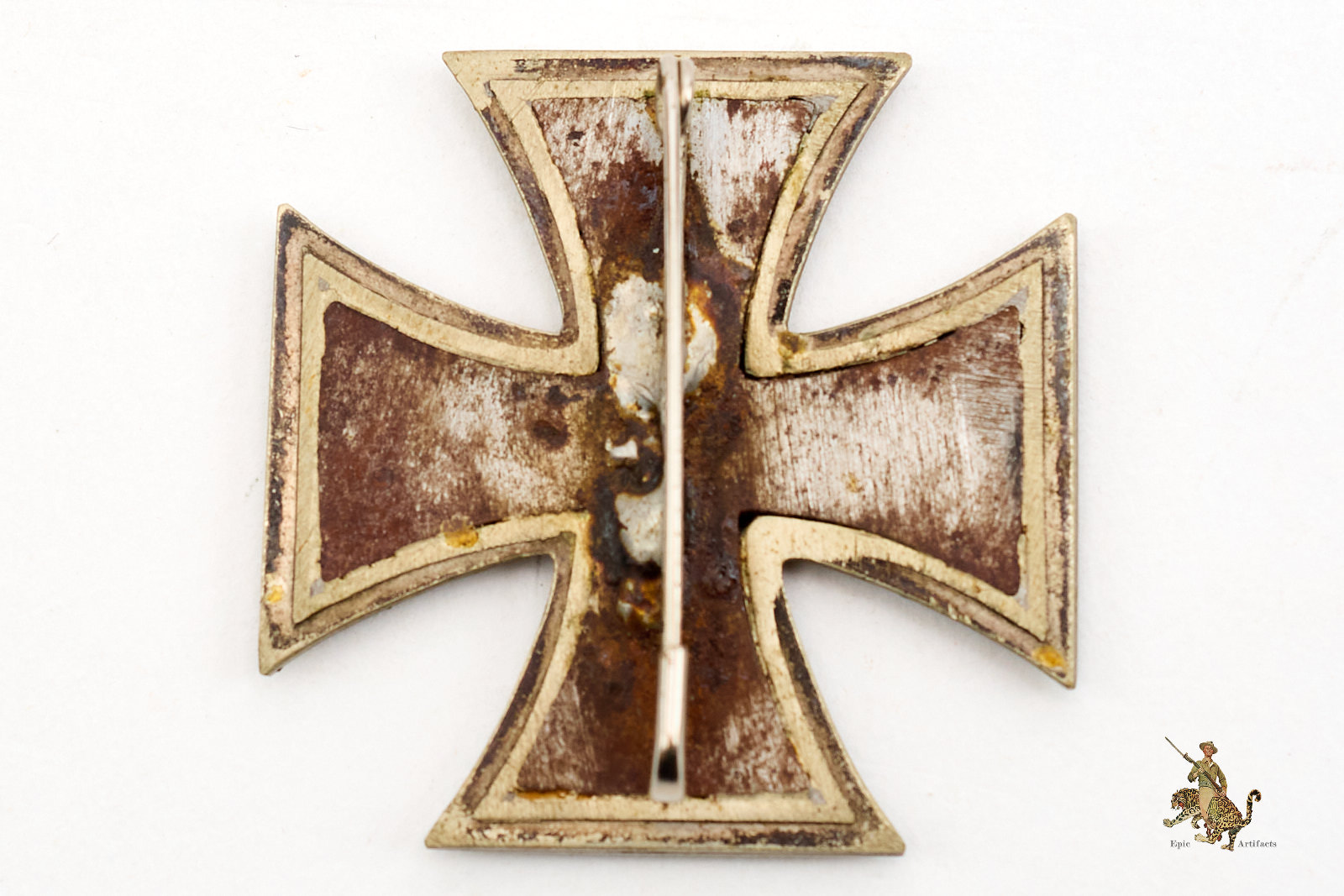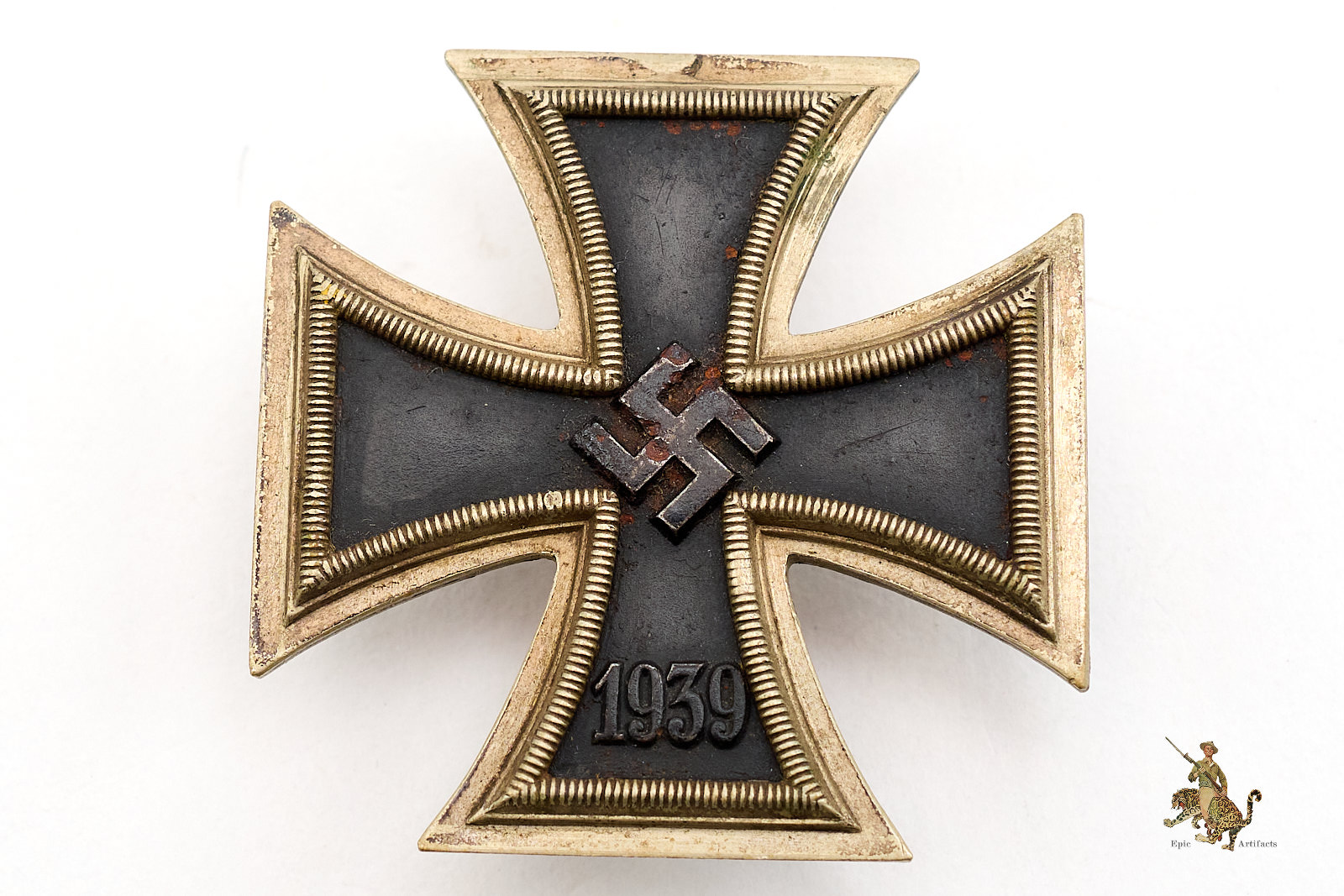 Product Description: An intriguing and well-presented 1939 Iron Cross 1st Class Conversion, representing a period adaptation of a second-class cross for wear as a first-class decoration. The piece appears to have originated as an EK2, the suspension loop having been removed and replaced with a soldered period safety-pin assembly to the reverse, thereby transforming it for direct wear on the tunic.