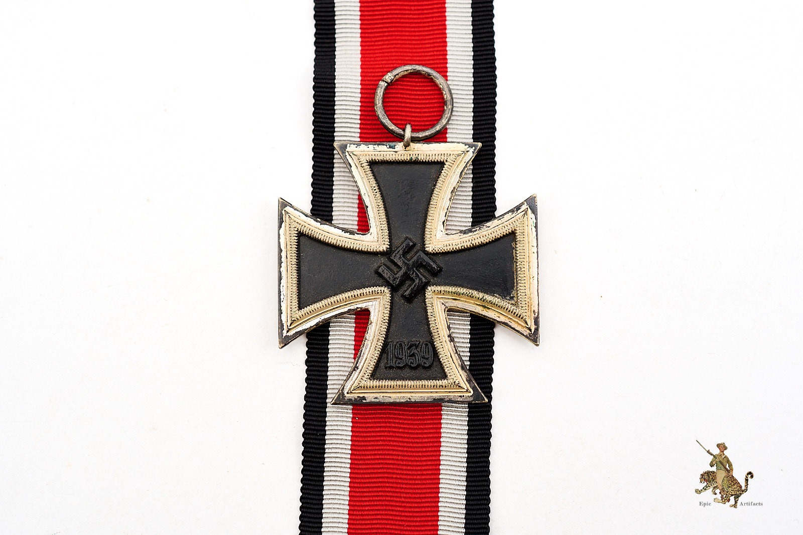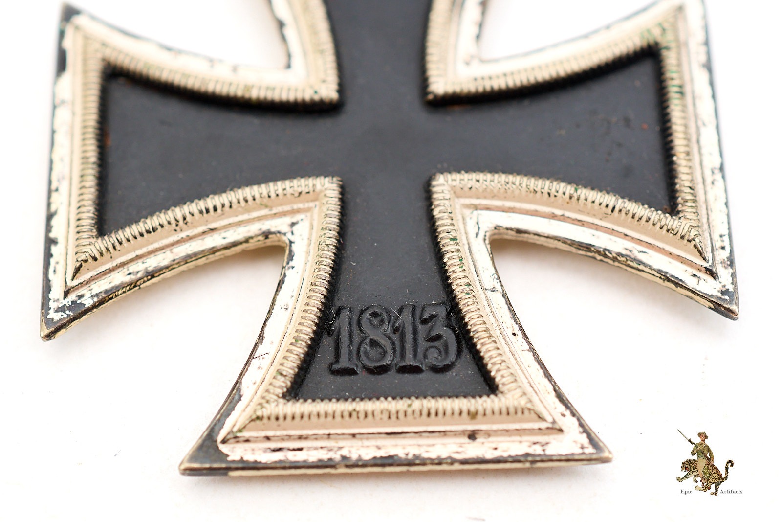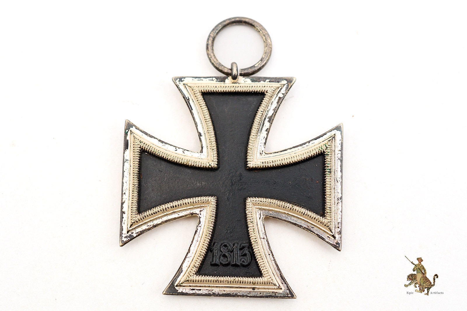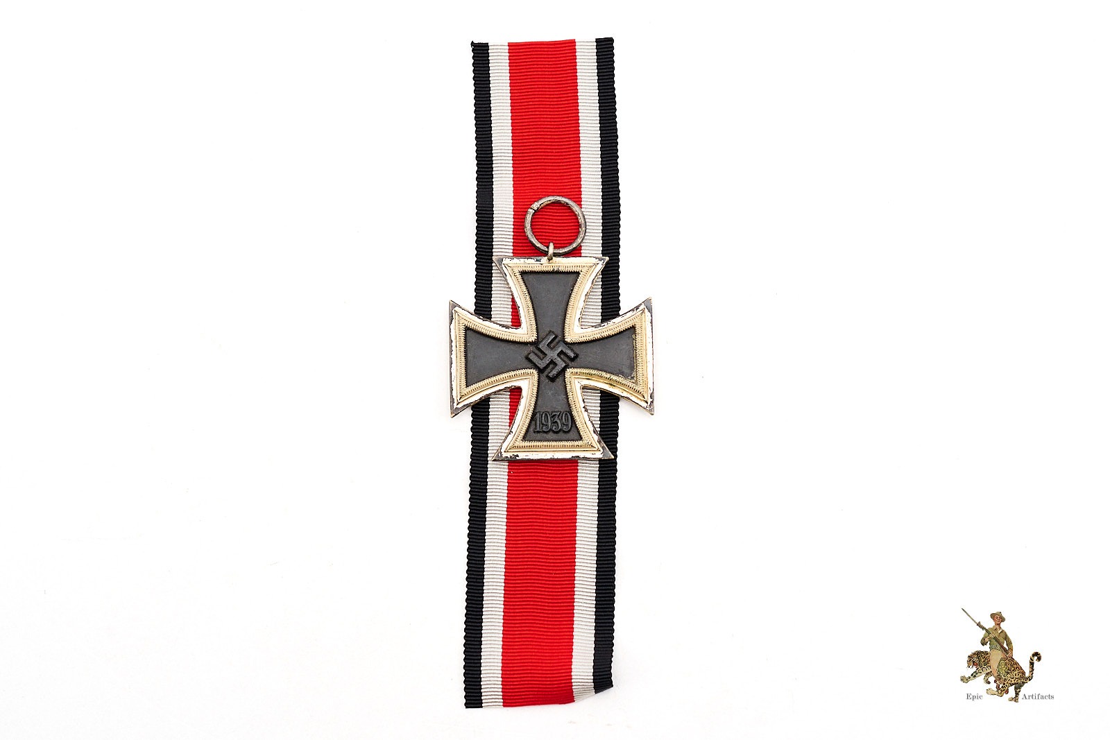 Historical Description: There is no more iconic German military award than the Iron Cross. The long history of this order began during the Napoleonic Wars. King Friedrich Wilhelm III of Prussia instituted the “Eisernes Kreuz” (Iron Cross) in March of 1813. The award criteria changed somewhat with time, but generally speaking, Iron Crosses could be awarded for individual acts of bravery, or for leadership achievements on the battlefield. The design was created by a Karl Friedrich Schinkel, his choice of the black cross with silver outline was derived from the heraldic emblem of the Teutonic Knights. There were a number of different type and grades of Iron Cross awards throughout its long history, but the basic details of the most widely awarded grades: The Iron Cross 1st Class and Iron Cross 2nd Class- remained the same. The first-class award was a breast badge, with fittings on the reverse to allow it to be worn on the uniform. These fittings varied widely over time and from maker to maker, and could be a simple in and catch, a screw post and retaining disc, or more elaborate setups. The second-class award was suspended from a ribbon, originally in the Prussian colors of black and white, later in the Reich colors of black, red and white. On the original versions of these crosses, in 1813, the front of the iron core of each grade was bare, and only the second-class award had ornamentation: a crown over the initials “FW” representing the King, a sprig of oak leaves, and the date 1813. The core was redesigned in 1870, when the cross was re-instituted during the Franco-Prussian War. The reverse ornamentation on the Iron Cross 2nd Class remained the same, but the front of the core on both grades now bore another crown, a “W” representing Kaiser Wilhelm, and the date 1870. This pattern repeated again when the cross was reinstituted for WWI- everything stayed the same, only the date 1870 was replaced with 1914. The final reinstitution of the cross came in 1939. For this version, the front of the core for both grades bore a swastika and the date 1939. The oak leaves, crown and royal initials were removed from the reverse, with only the date 1813 remaining as a reminder of the legacy of this award. In WWII, hundreds of thousands of Iron Cross First Class awards were bestowed, and four and a half million Iron Cross Second Class awards. Iron Crosses were made by a large number of authorized manufacturers Some variants of these awards were mass produced in huge numbers. Others were made in very limited quantities.