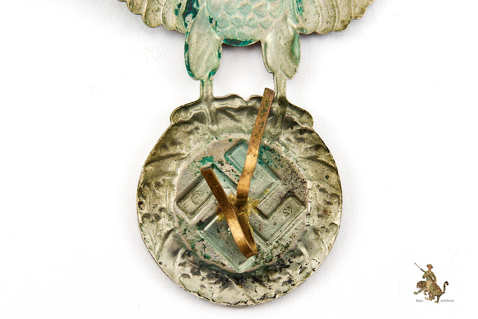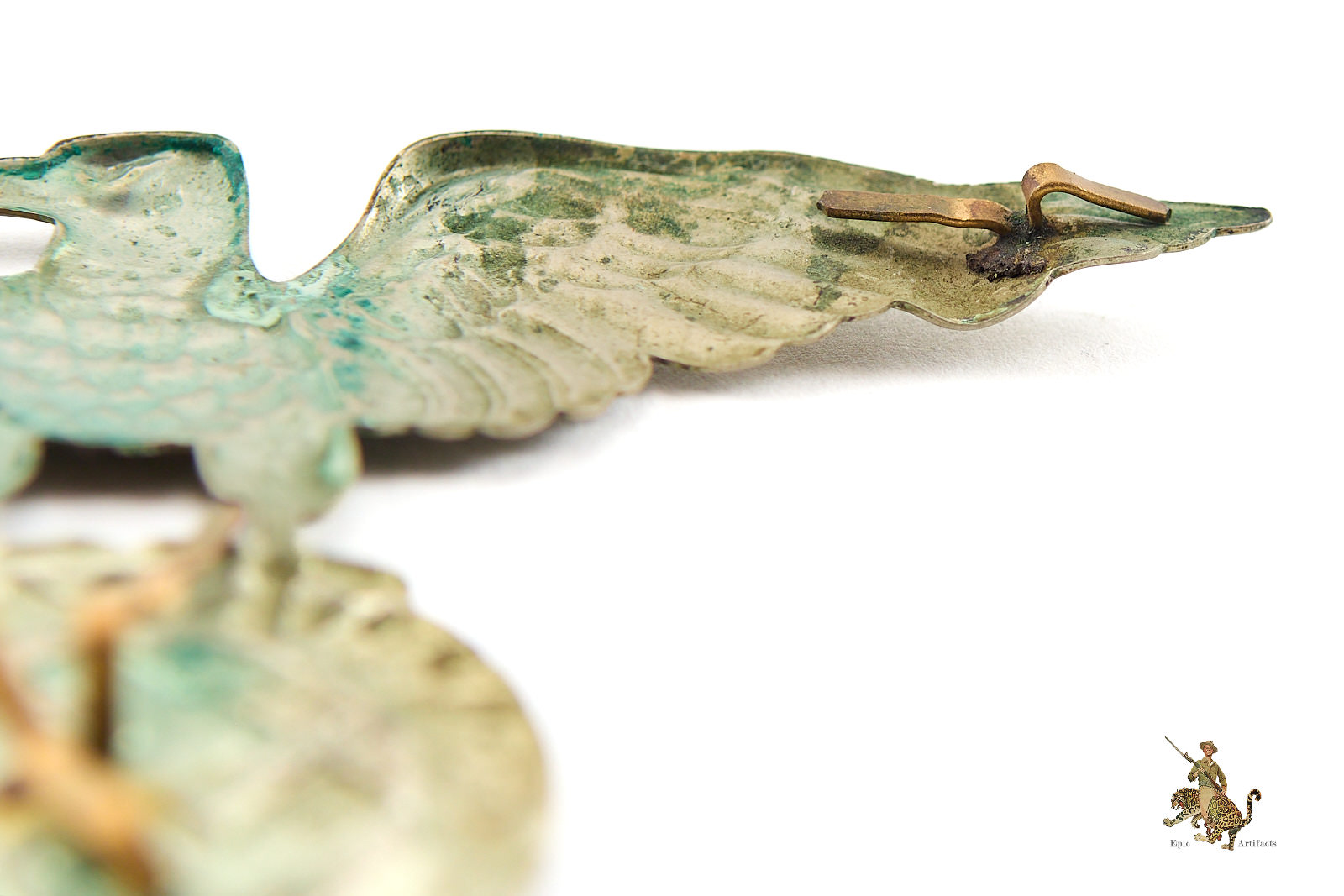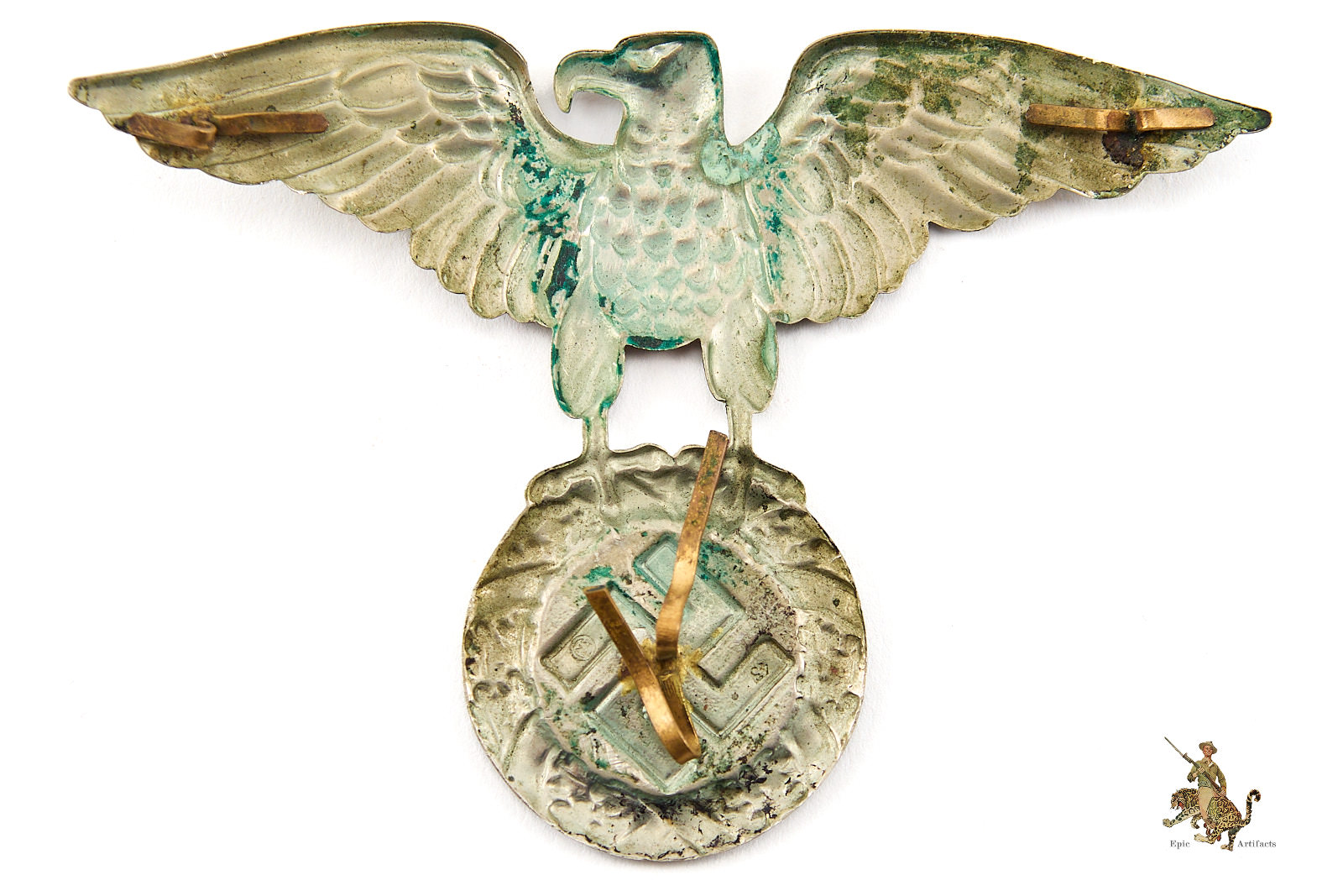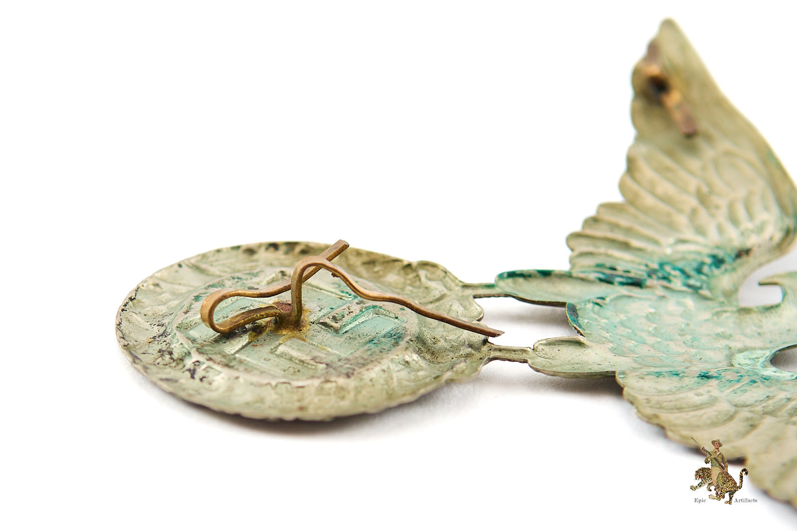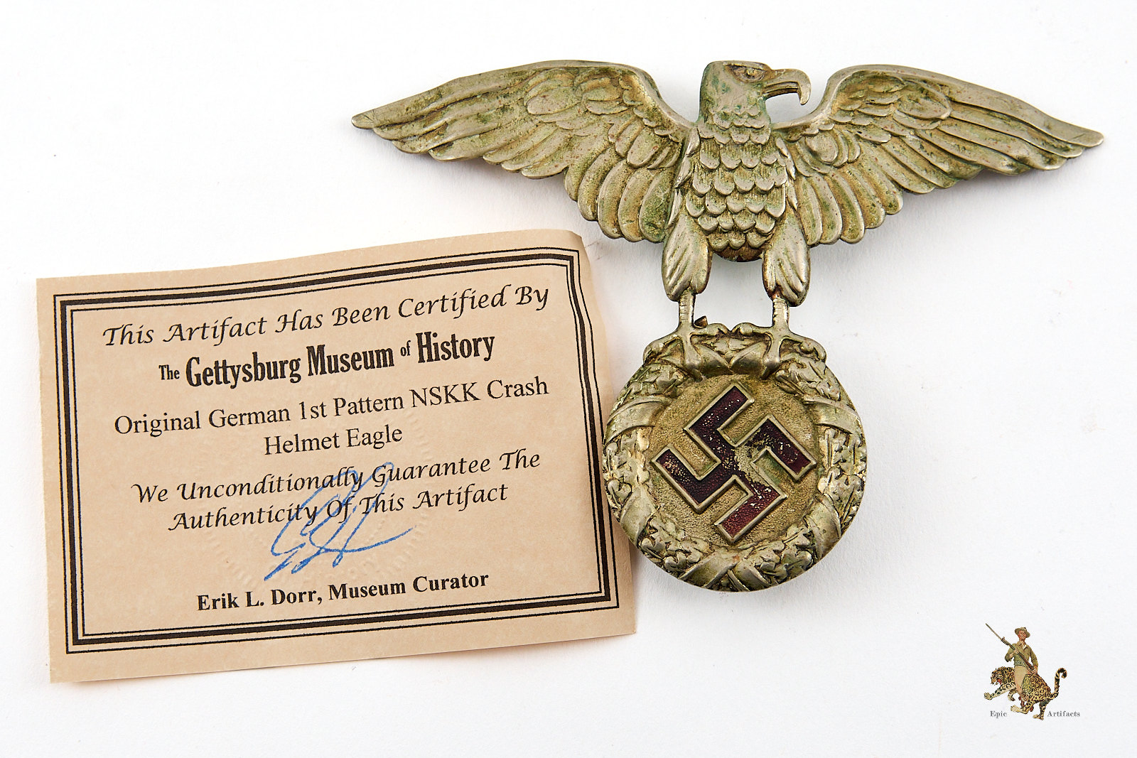 This complete example retains its original wire attachment prongs at both wing tips and the roundel, each secured with the original solder. The prongs show gentle bending from prior mounting, attesting to authentic field use. Presented in excellent condition, the piece exemplifies the refined design and craftsmanship of early NSKK insignia. Accompanied by a certificate of authenticity from The Gettysburg Museum of History, this 1st Pattern NSKK Helmet Cap Eagle represents an outstanding and historically significant specimen of early Motor Corps regalia.