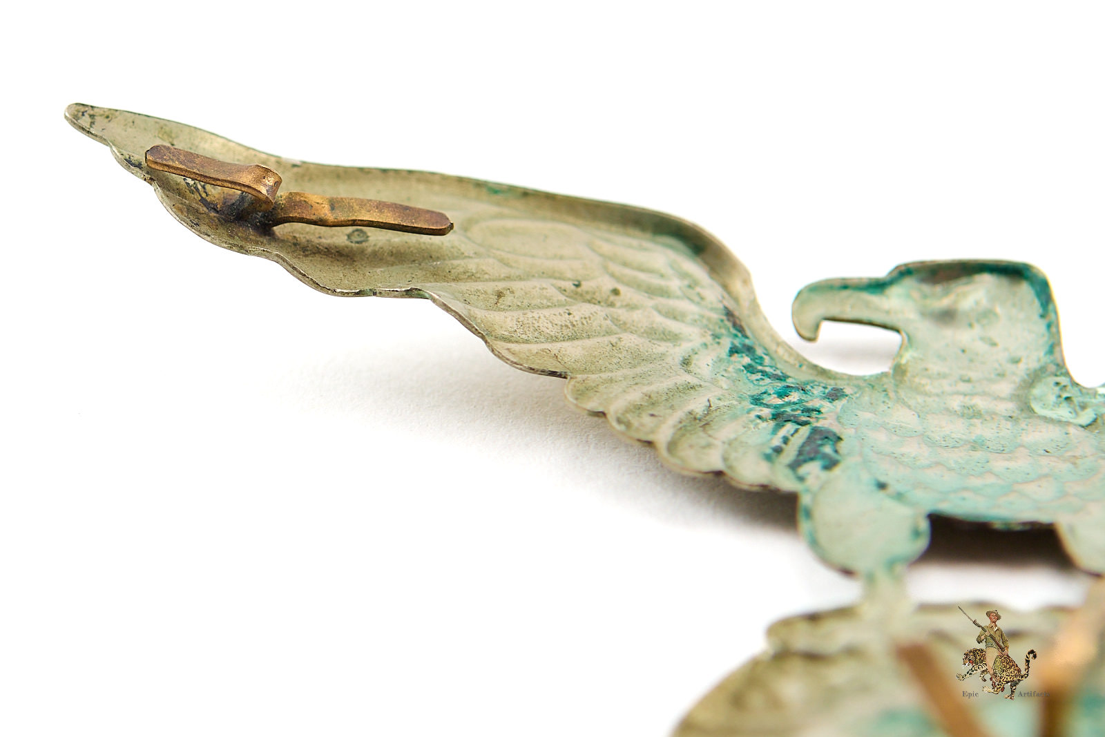 Product Description: A superb and rarely encountered 1st Pattern NSKK Helmet Cap Eagle, executed in stamped sheet metal and displaying the distinctive long-winged eagle and swastika emblem of the National Socialist Motor Corps (Nationalsozialistisches Kraftfahrkorps). The obverse retains an attractive, even patina with light rippling to the metal, characteristic of genuine period wear. The swastika shows paint wear from age and use. The reverse is hollow-backed, showing age-consistent oxidation and patina throughout. Clearly stamped with the circular RZM logo and maker code “43”, denoting officially sanctioned manufacture.