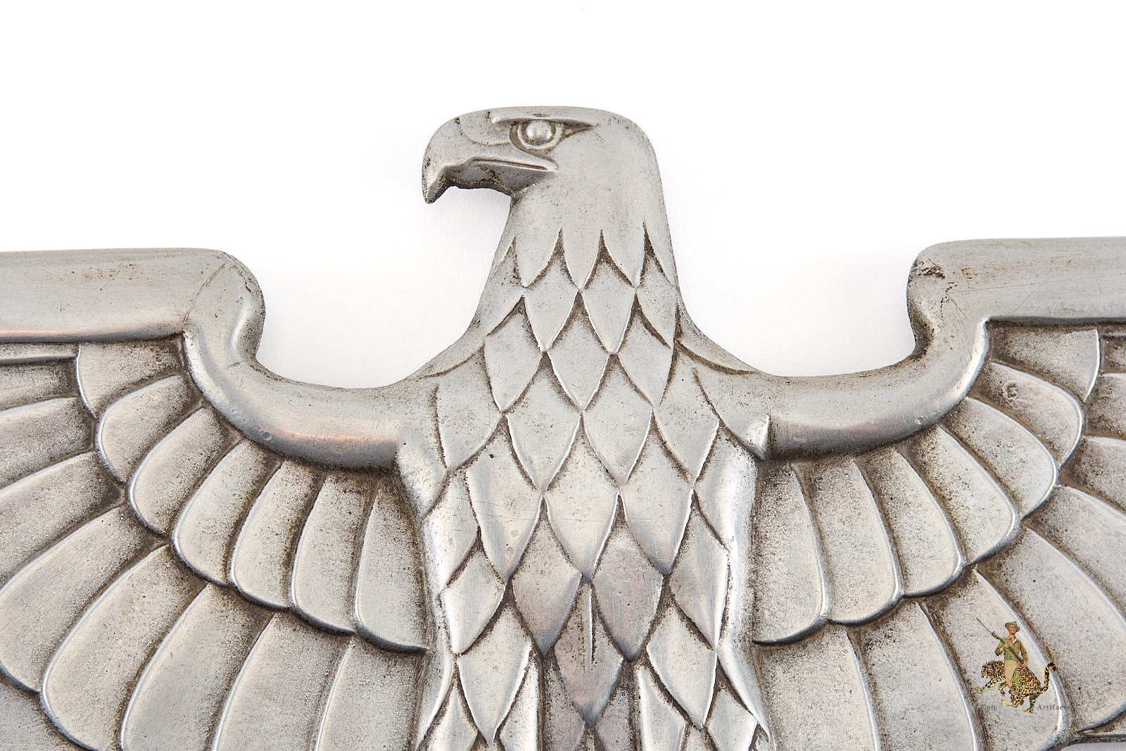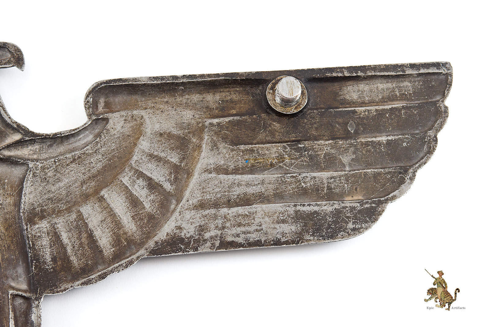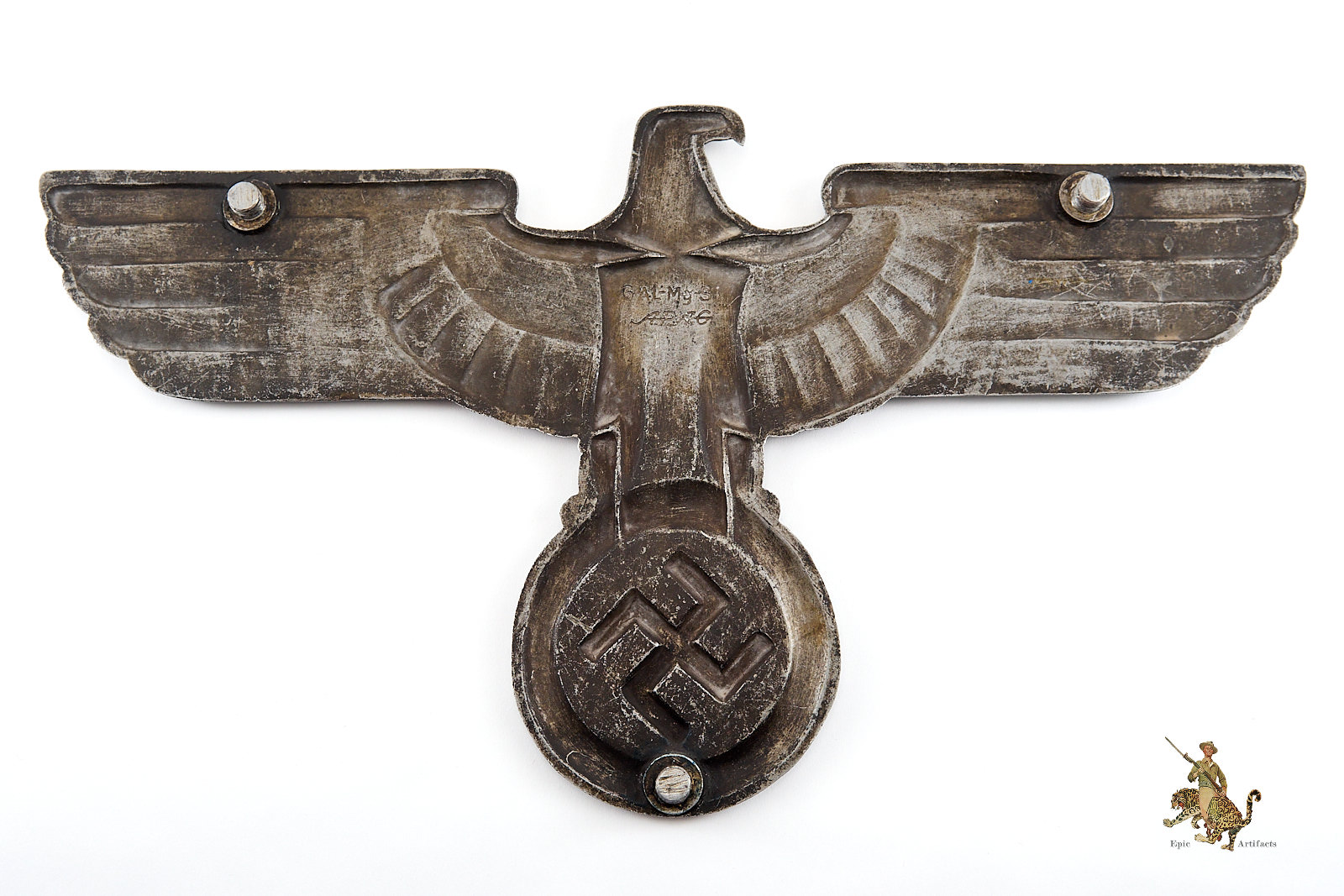 Historical Description: During the Third Reich, all rail transport was nationalized and organized under the German Reichsbahn. Reichsbahn rail cars were state property and included everything from the locomotives used for transporting freight, to passenger cars, street cars and trolleys. In the Nazi era, and during WWII, the Reichsbahn adorned their locomotives and passenger rail cars with large metal decorative German eagle and swastika national emblems. These were made in various sizes and had a variety of finishes to suit different purposes and vehicle types. Generally, these eagles were manufactured from aluminum or zinc alloy, with integral threaded studs on the reverse that were used to affix these to the fronts of rail cars. These eagles had a striking and imposing appearance and were an iconic part of Nazi regalia. After the war, Allied denazification policies required these to be removed. Many were destroyed, though these were eagerly sought after by Allied troops hunting for souvenirs. They are extremely collectible and desirable artifacts today.