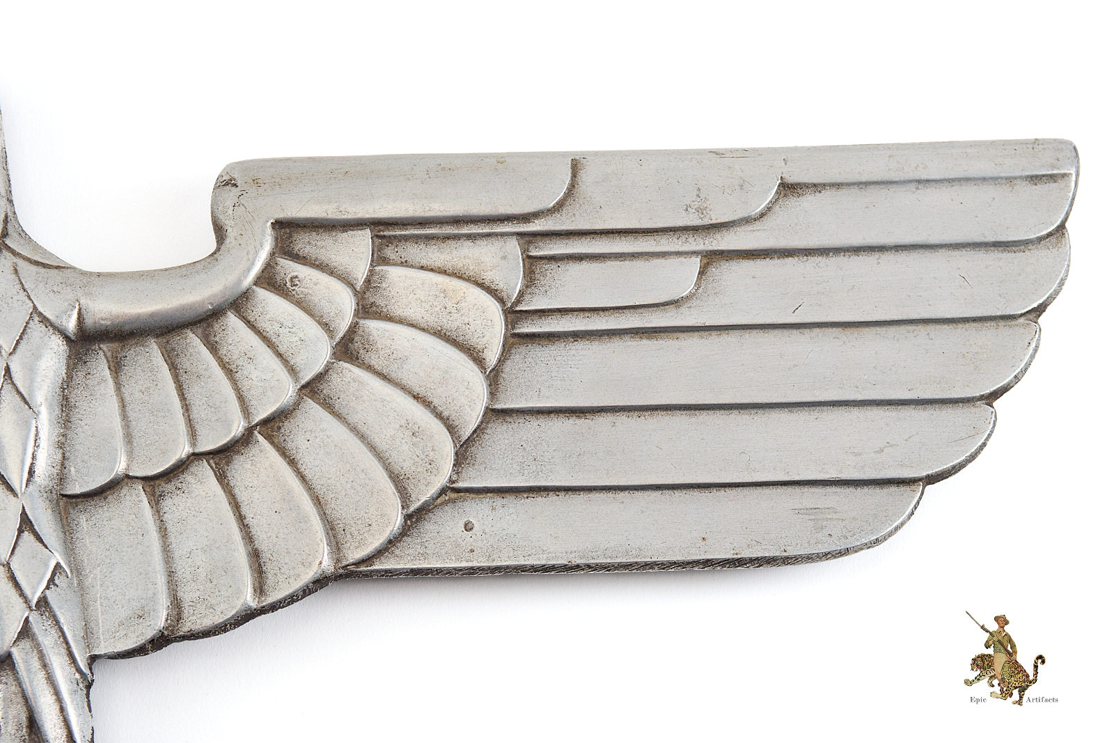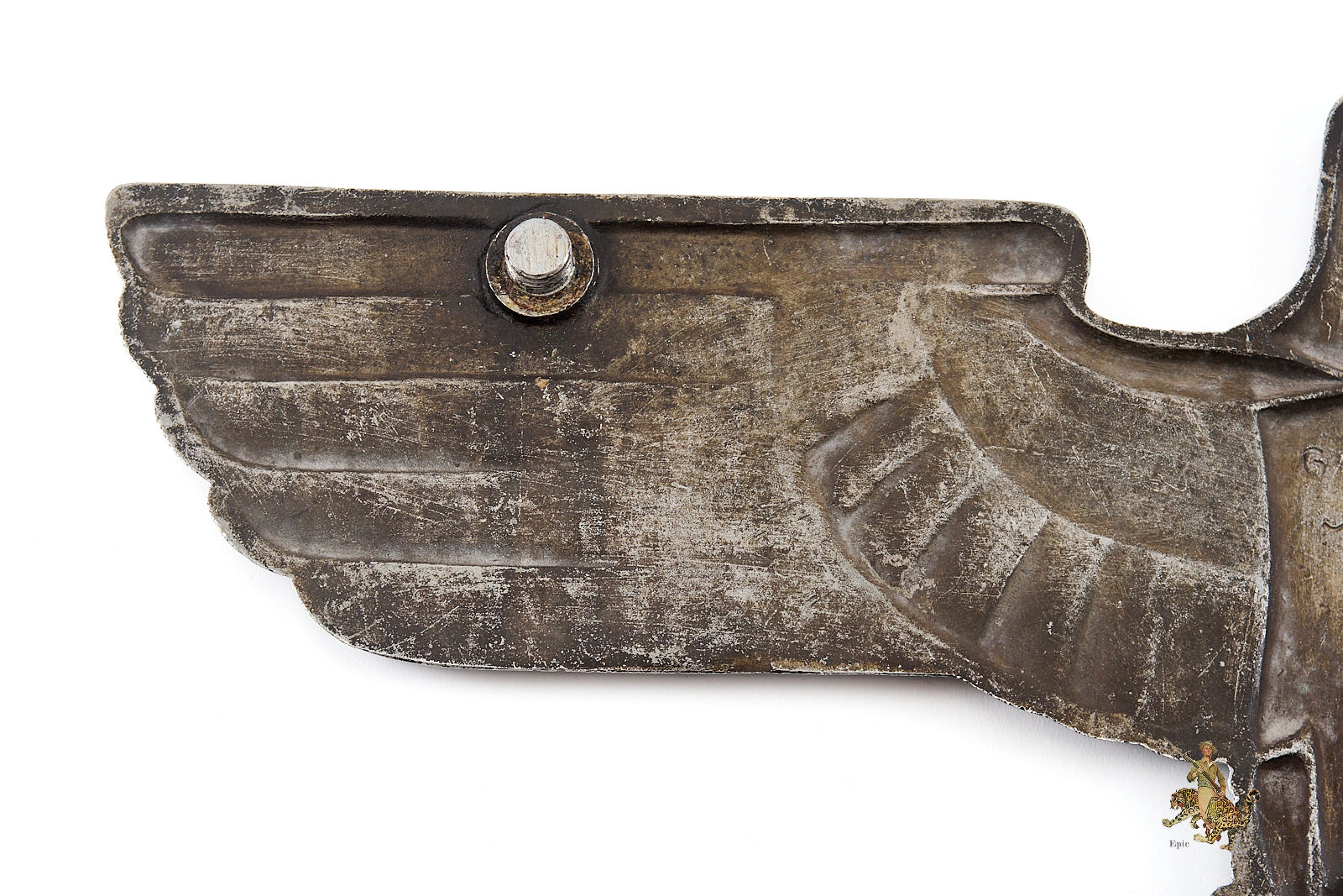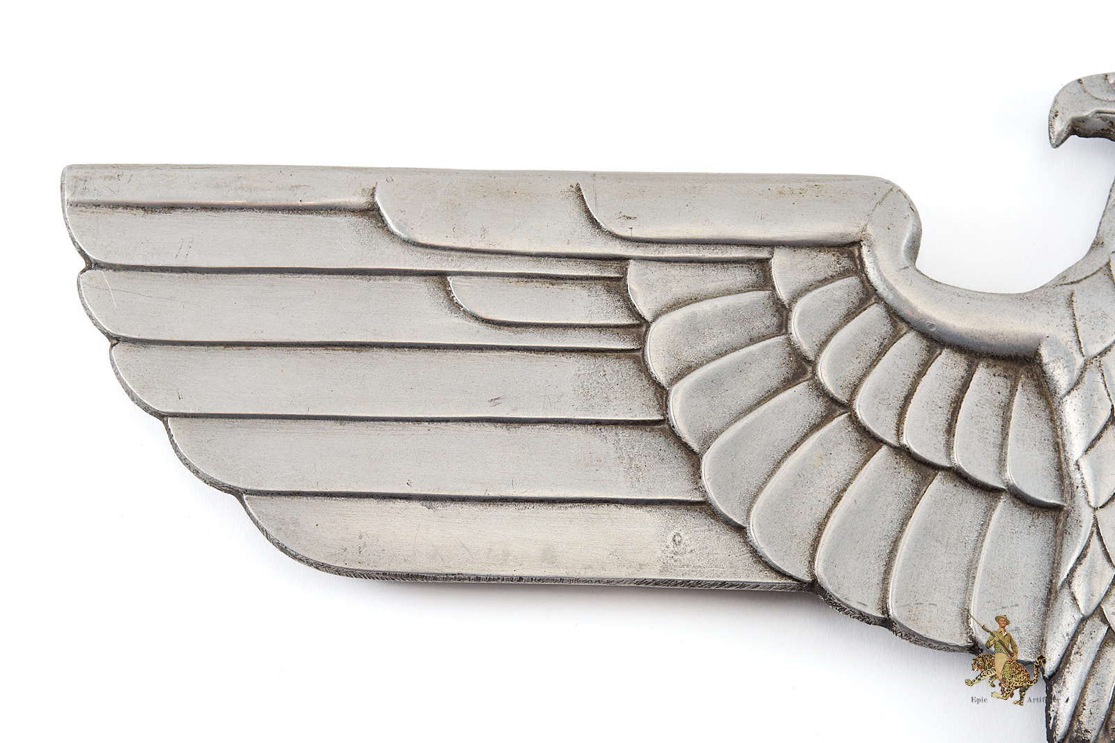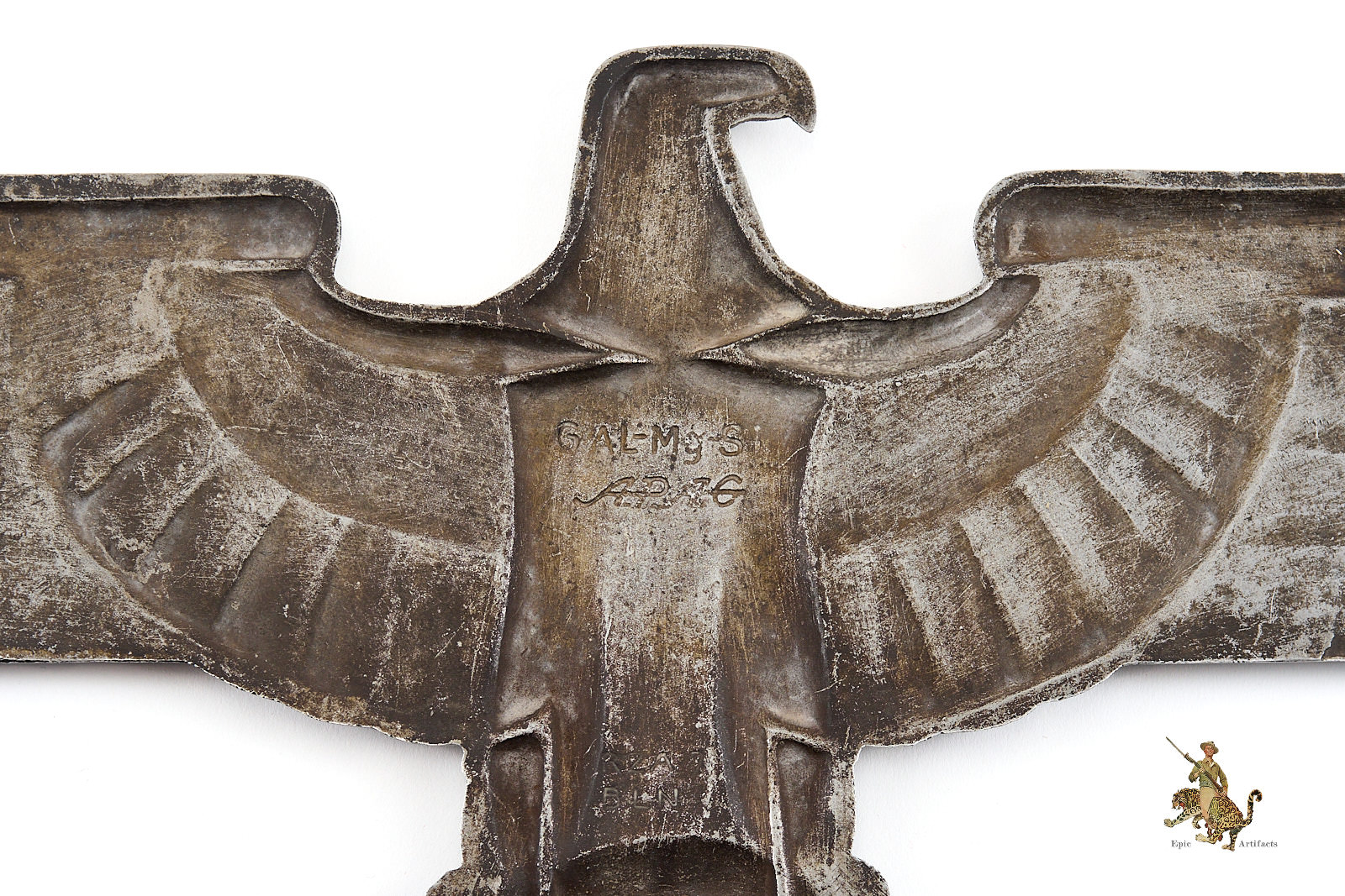Historical Description: During the Third Reich, all rail transport was nationalized and organized under the German Reichsbahn. Reichsbahn rail cars were state property and included everything from the locomotives used for transporting freight, to passenger cars, street cars and trolleys. In the Nazi era, and during WWII, the Reichsbahn adorned their locomotives and passenger rail cars with large metal decorative German eagle and swastika national emblems. These were made in various sizes and had a variety of finishes to suit different purposes and vehicle types. Generally, these eagles were manufactured from aluminum or zinc alloy, with integral threaded studs on the reverse that were used to affix these to the fronts of rail cars. These eagles had a striking and imposing appearance and were an iconic part of Nazi regalia. After the war, Allied denazification policies required these to be removed. Many were destroyed, though these were eagerly sought after by Allied troops hunting for souvenirs. They are extremely collectible and desirable artifacts today.