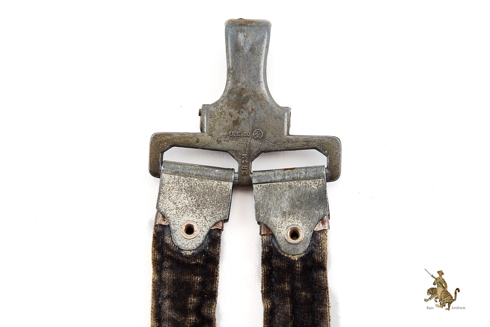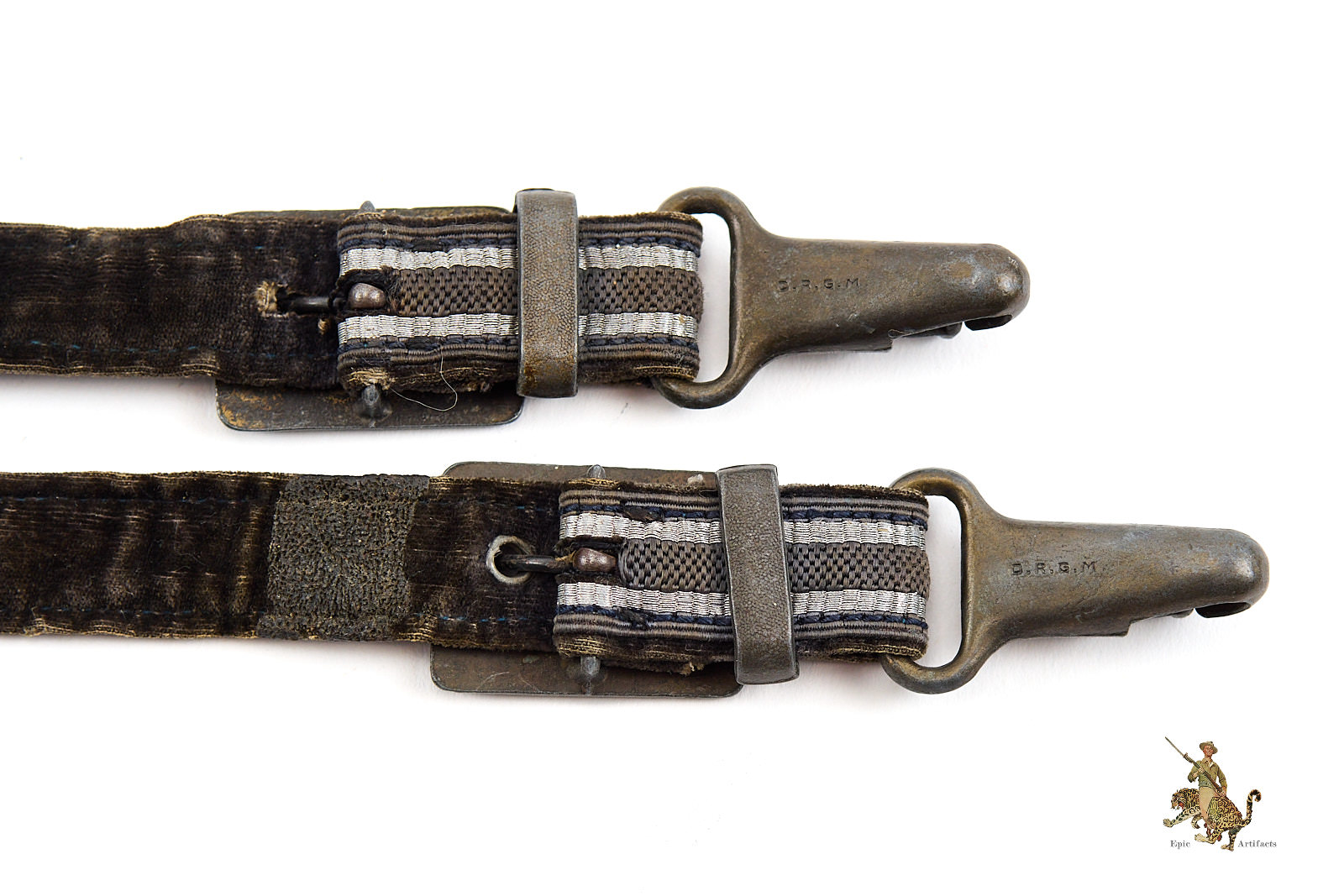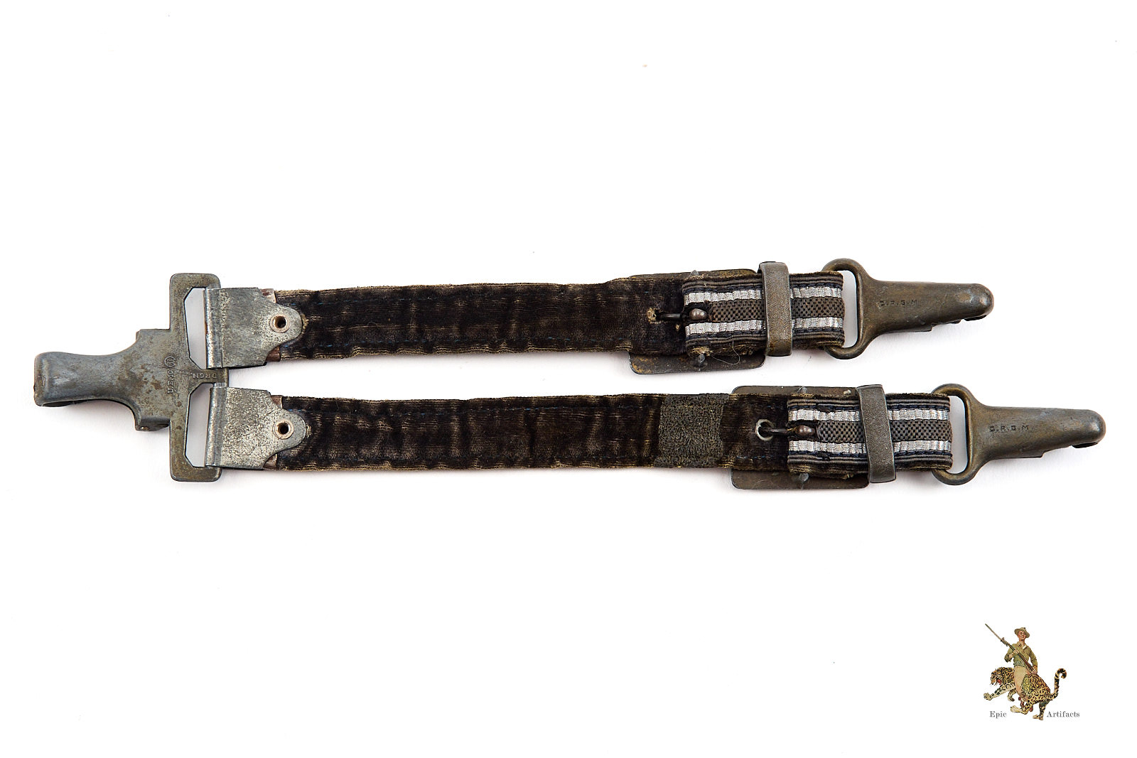 Product Description: This set of 2nd Model Deluxe Luftwaffe Dagger Hangers is complete and sound, and shows obvious traces of use from daily wear. This is a top quality, super deluxe set of hangers, with metal tops to the straps and ornate details on the fittings. The brocade tape on the straps shows light wear to the obverse. The velvet backing shows slight thinning at edges, but remains excellent overall. The metal fittings are made from zinc, and show only traces of the original silver finish, having mostly reverted to the dull gray color of the base metal. There are some small areas of light-colored surface oxidation. The buckles are functional, as are the spring clips, which are marked “D.R.G.M.” indicating a legally protected design. The upper clip also bears an embossed RZM logo within a single circular border with open bottom, as well as the letters “U.E” indicating “Uniformeffekten Erlaubnißschein” (Uniform Accessories License), and the manufacturer’s numerical code, “10”. This type of combined RZM/U.E. markings are believed to have been utilized circa May 1933 to March 1935. These 2nd Model Deluxe Luftwaffe Dagger Hangers would be perfect for completing a well-worn dagger, and remain a nice example of this high-quality pattern.