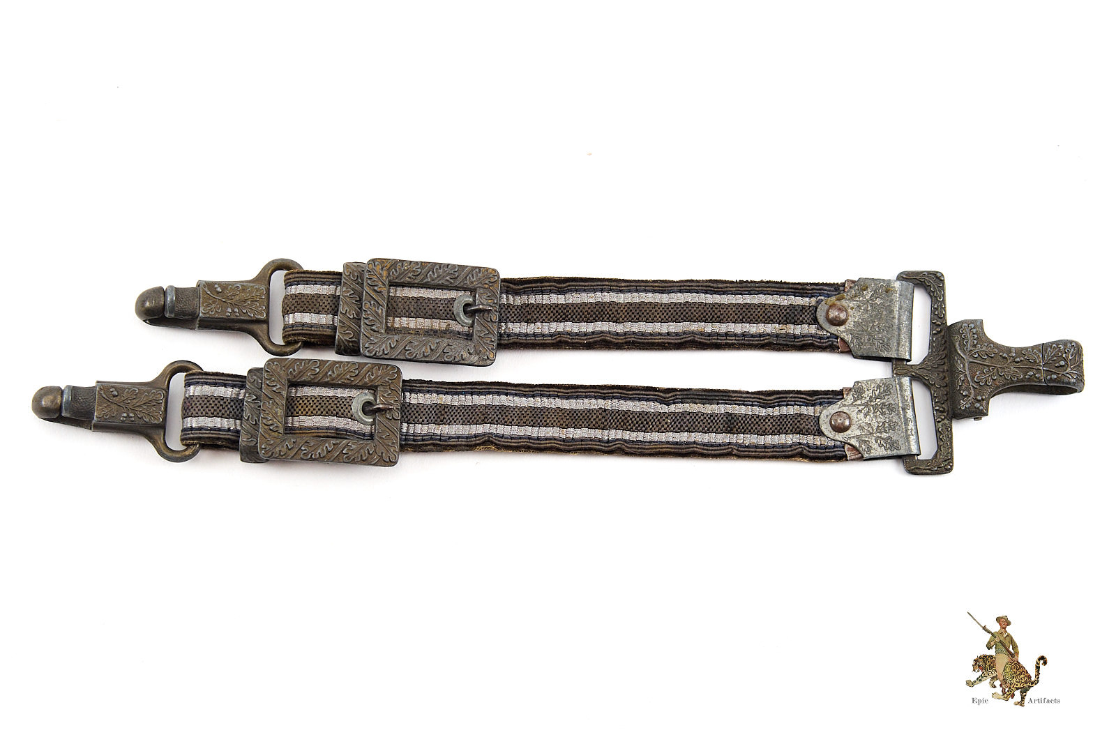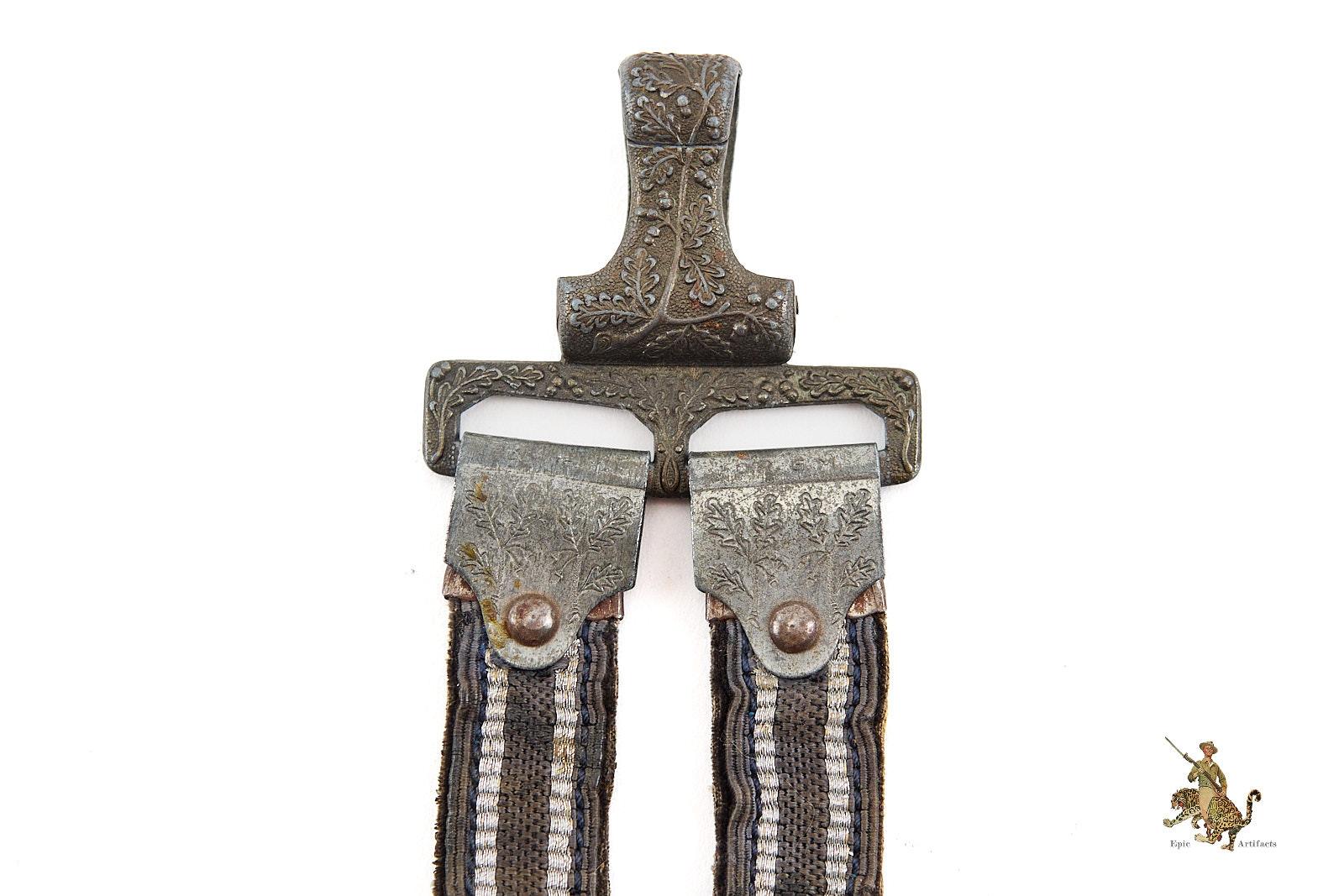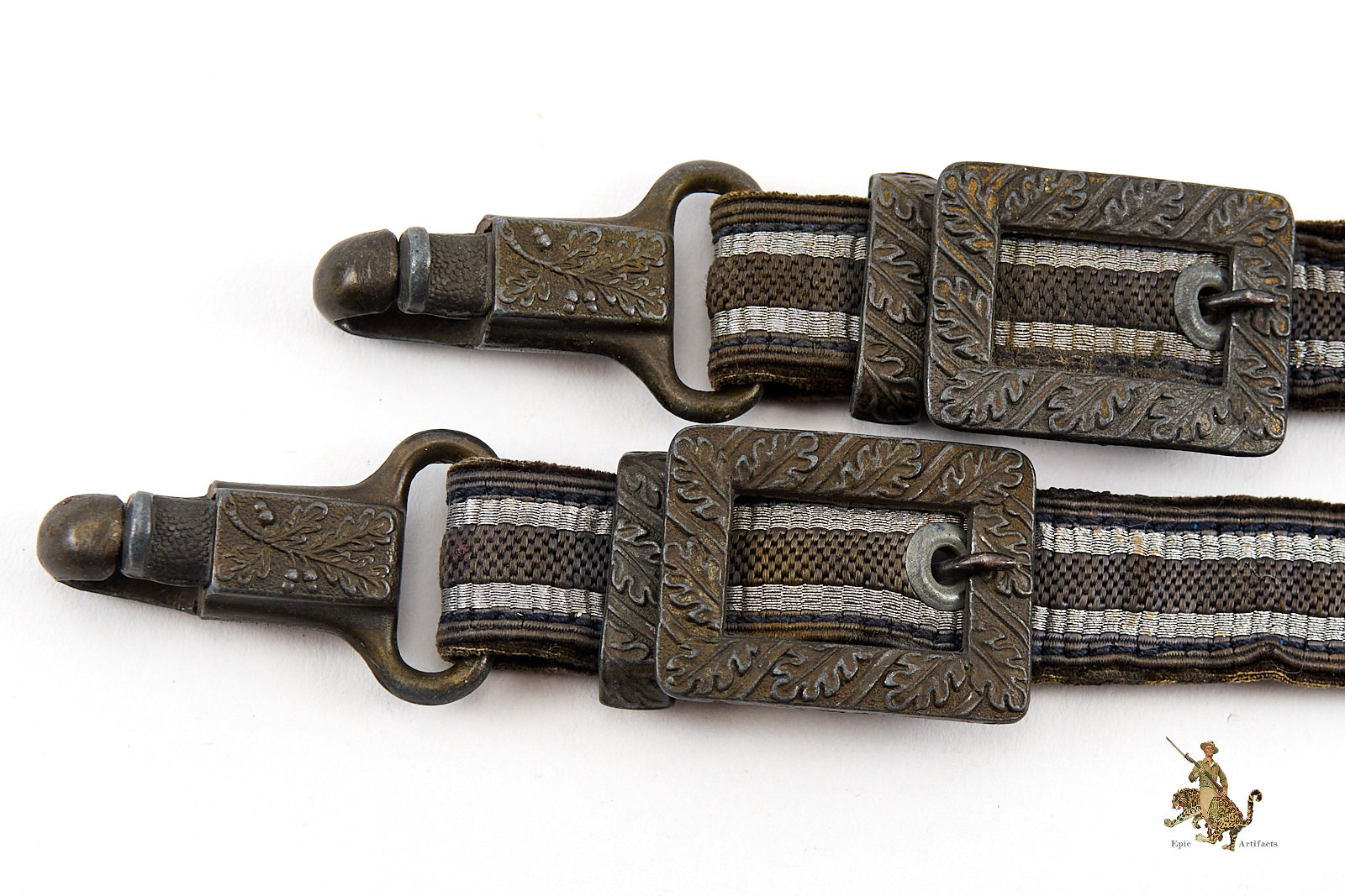Product Description: This set of 2nd Model Deluxe Luftwaffe Dagger Hangers is complete and sound, and shows obvious traces of use from daily wear. This is a top quality, super deluxe set of hangers, with metal tops to the straps and ornate details on the fittings. The brocade tape on the straps shows light wear to the obverse. The velvet backing shows slight thinning at edges, but remains excellent overall. The metal fittings are made from zinc, and show only traces of the original silver finish, having mostly reverted to the dull gray color of the base metal. There are some small areas of light-colored surface oxidation. The buckles are functional, as are the spring clips, which are marked “D.R.G.M.” indicating a legally protected design. The upper clip also bears an embossed RZM logo within a single circular border with open bottom, as well as the letters “U.E” indicating “Uniformeffekten Erlaubnißschein” (Uniform Accessories License), and the manufacturer’s numerical code, “10”. This type of combined RZM/U.E. markings are believed to have been utilized circa May 1933 to March 1935. These 2nd Model Deluxe Luftwaffe Dagger Hangers would be perfect for completing a well-worn dagger, and remain a nice example of this high-quality pattern.