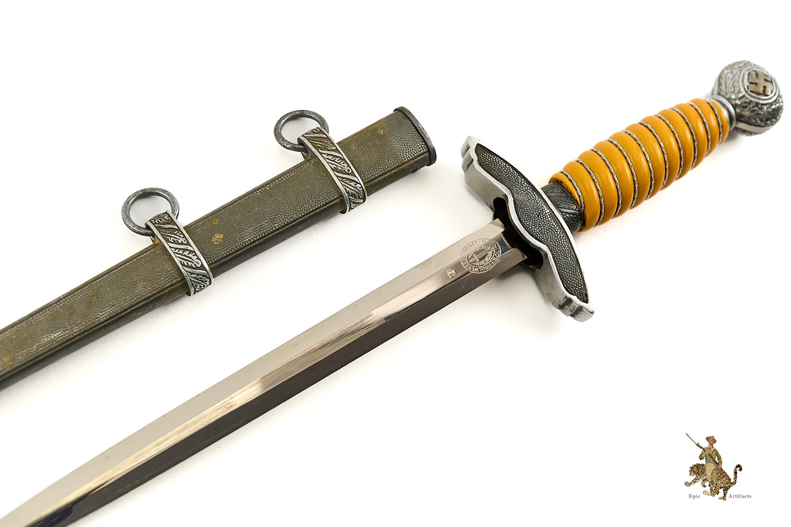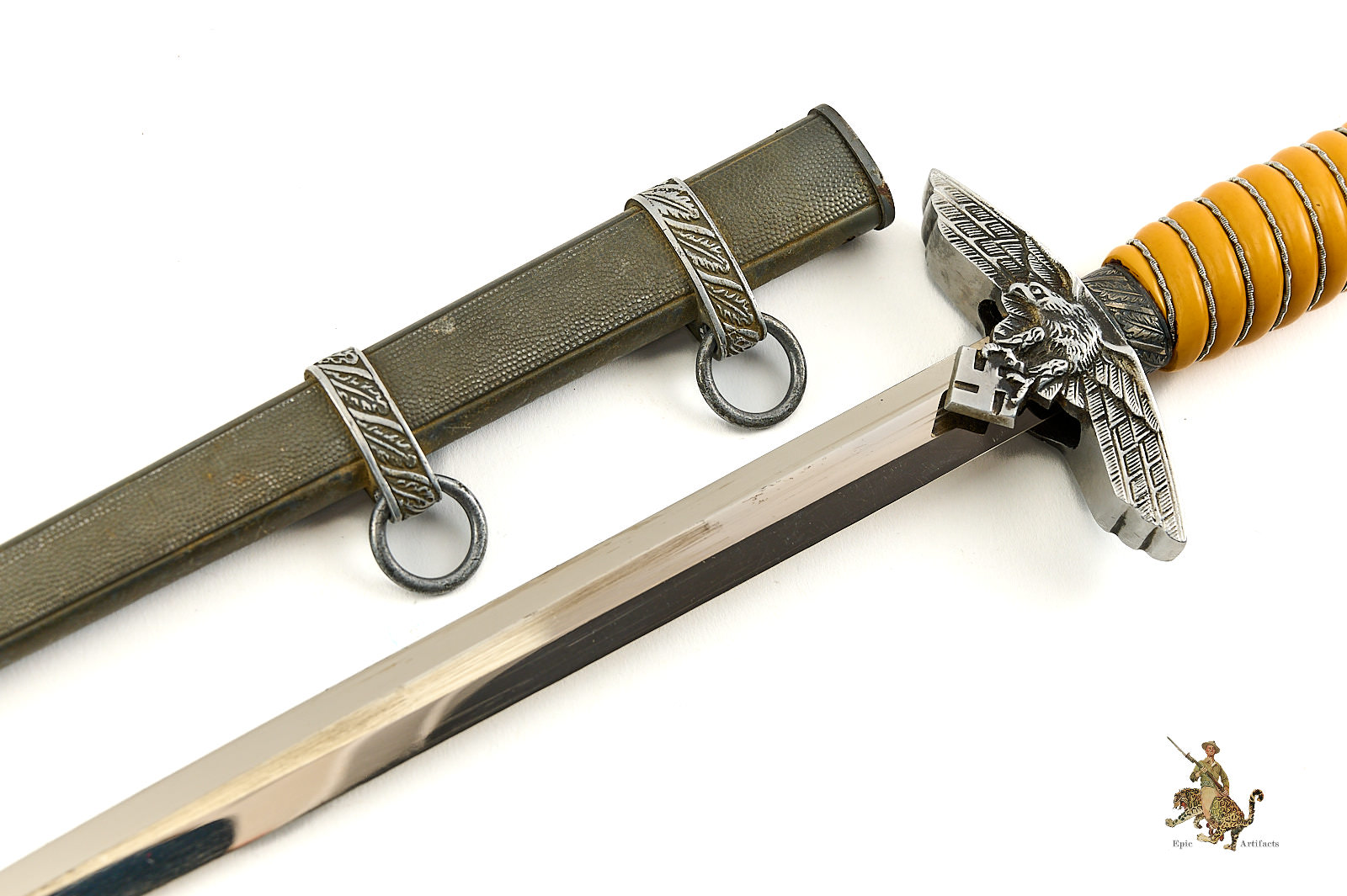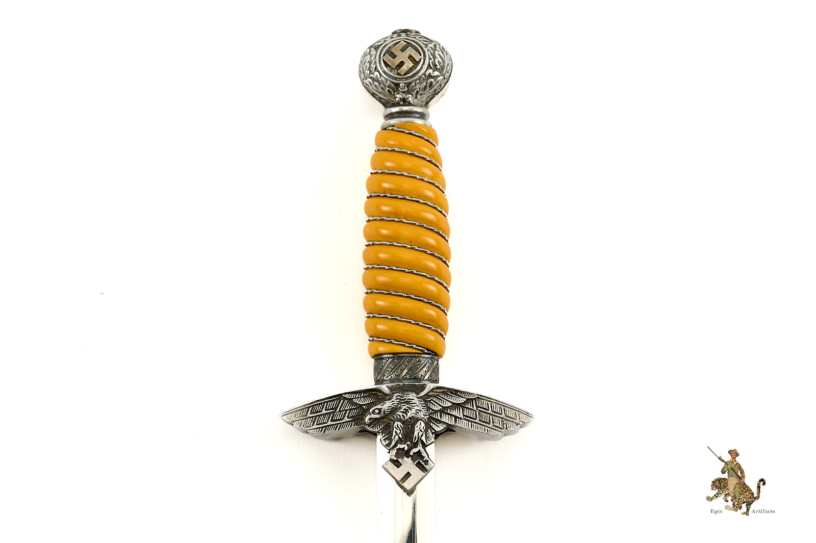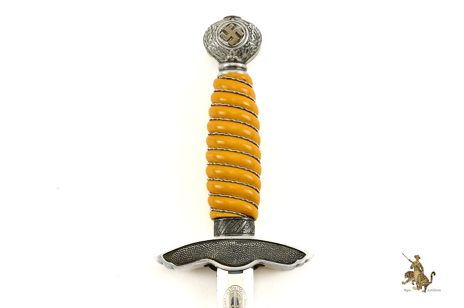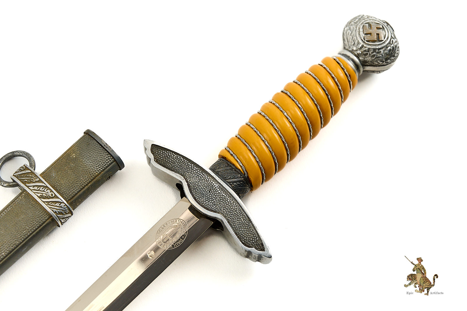 Historical Description: The Luftwaffe dagger was a piece of regalia with a unique history. After WWI, Germany was prohibited from having an Air Force. In 1933, the Nazis formed the Deutscher Luftsport-Verband (DLV), which was a paramilitary aviation organization. DLV officers wore a long dagger. In 1935, in violation of the Treaty of Versailles, Hitler instituted the new German armed forces, the Wehrmacht. One of the branches of the Wehrmacht was the Luftwaffe. Luftwaffe officers at this time wore what we know as the first model Luftwaffe dagger. This was a shortened version of the earlier DLV dagger. It featured a scabbard covered in blue leather, and a blue, wire-wrapped grip. The crossguard featured a round, “sunwheel” type swastika, flanked by downswept, stylized “wings.” The pommel was in the form of a vertical disc, with another, larger “sunwheel” swastika. In 1937, the Luftwaffe instituted a new dagger form, known to collectors as the second model. This new dagger was similar to that worn by officers of the German Army. The second model had a metal scabbard with impressed decoration, and no leather covering. The crossguard bore a Luftwaffe eagle, clutching a swastika. The blue grip was replaced with one that was orange, white or yellow. The various types of grips were a matter of personal preference and did not indicate branch or rank. The pommel of the new dagger featured a swastika within an oak leaves motif. The blades of these daggers were steel, and many but not all were manufacturer marked.