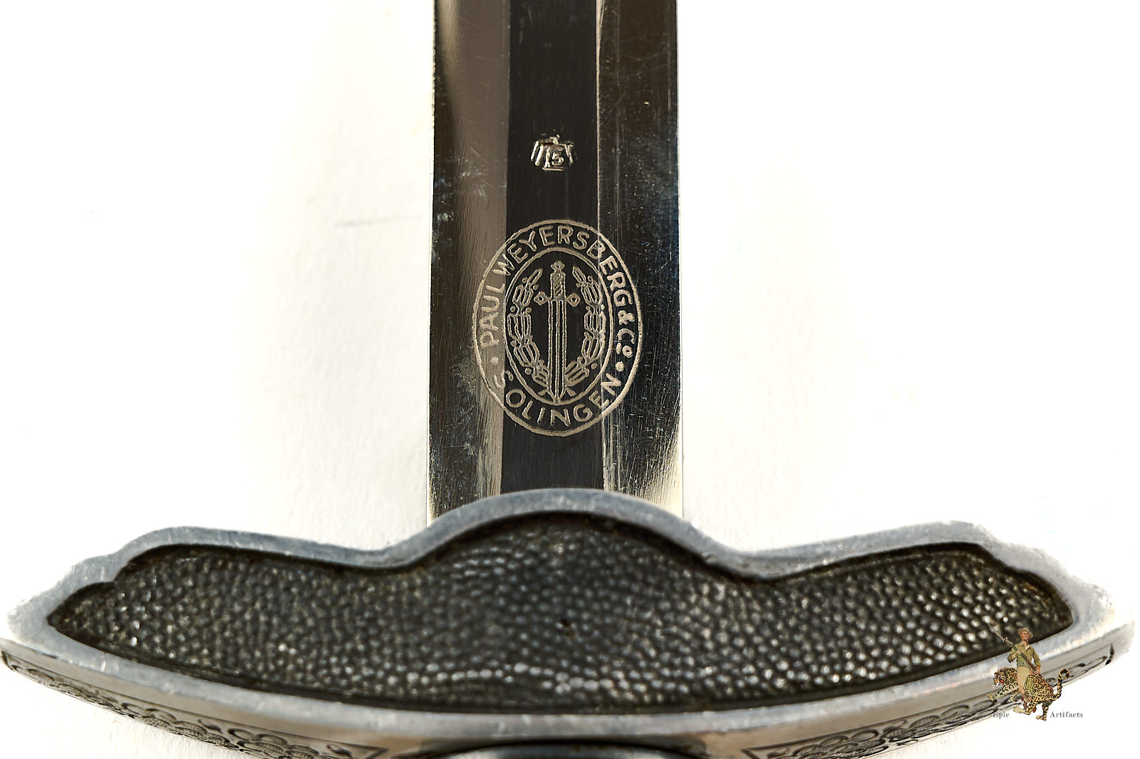 Product Description: An outstanding and complete example of the Second Model Luftwaffe Officer’s Dagger, produced by the esteemed Solingen maker Paul Weyersberg. This dagger exemplifies the refined craftsmanship of late Third Reich edged weapons, with a bright, immaculate blade that retains its full original plating. Only minimal runner marks are visible, and the ricasso bears the crisply struck maker’s mark for Paul Weyersberg, highly sought-after among collectors for its precision and provenance.