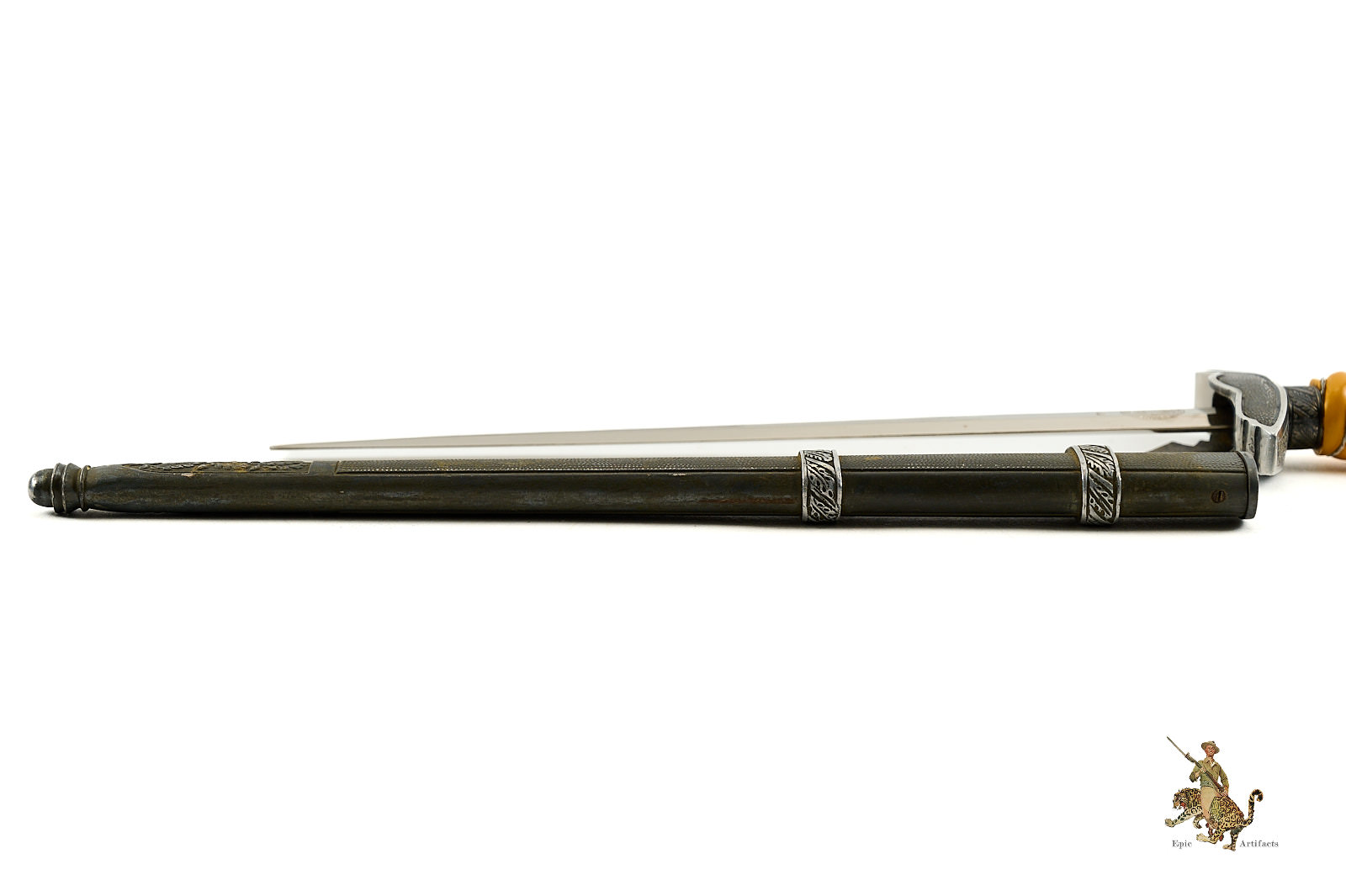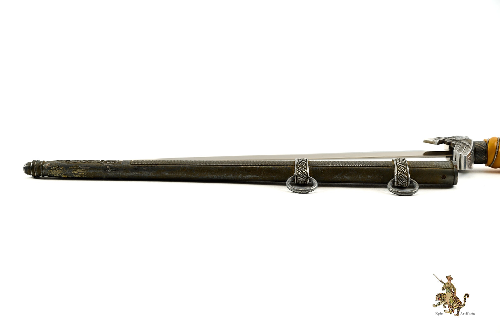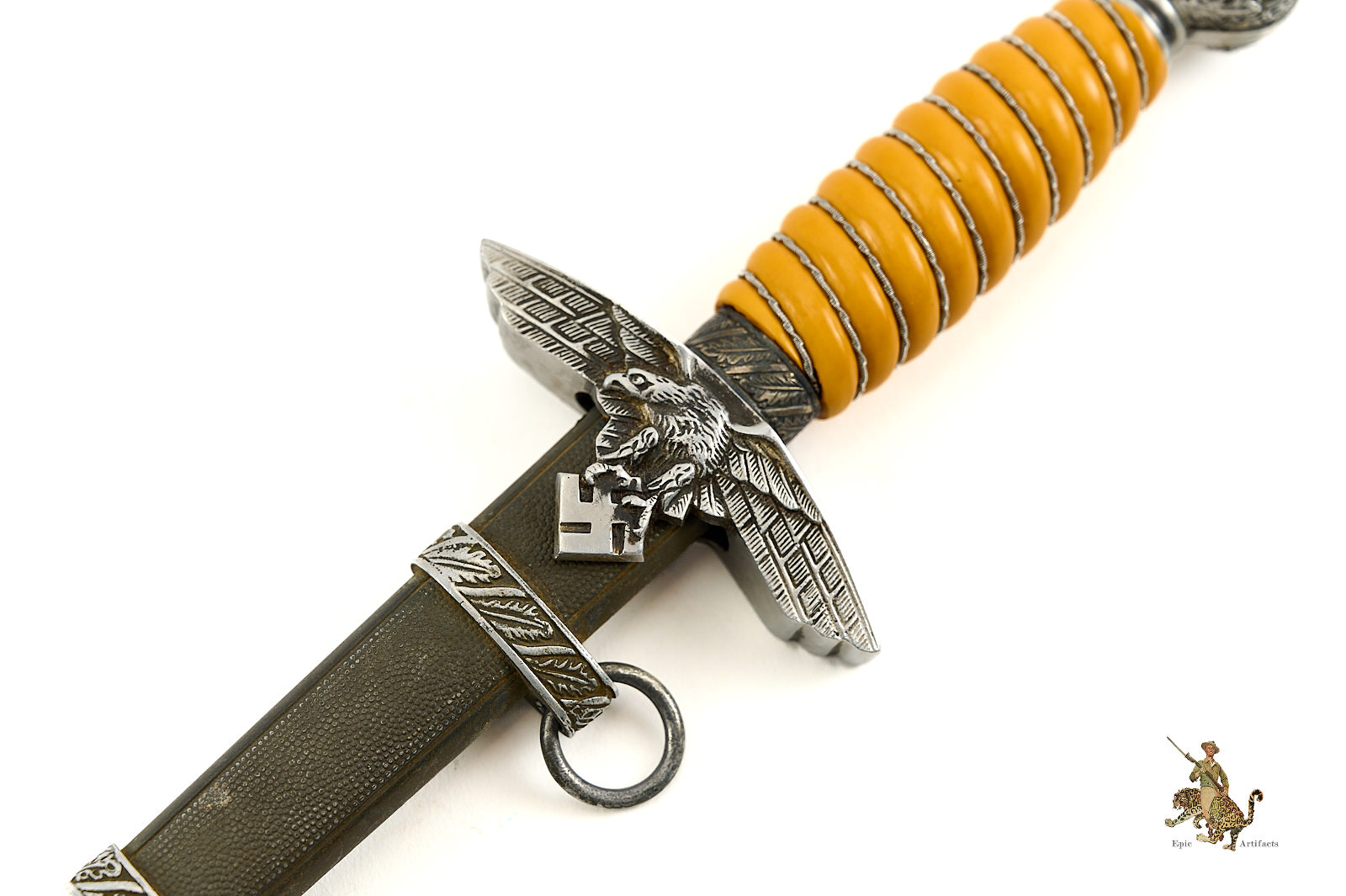 The grip is a particularly fine example, displaying a rich, mid-orange tone with its original springy wire wrap tightly intact—free of gaps or looseness. The accompanying steel scabbard is equally well-preserved, with no dents or distortions, and exhibits an even, pleasing patina consistent with careful long-term preservation. A dagger of exceptional visual appeal and integrity, this piece stands as a superb representation of Luftwaffe regalia and a desirable addition to any advanced edged weapons or WWII militaria collection.