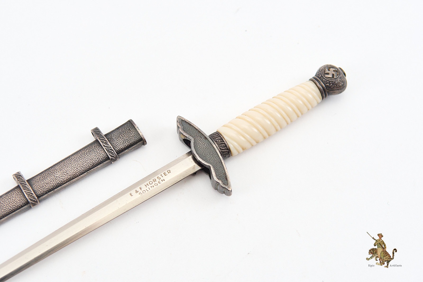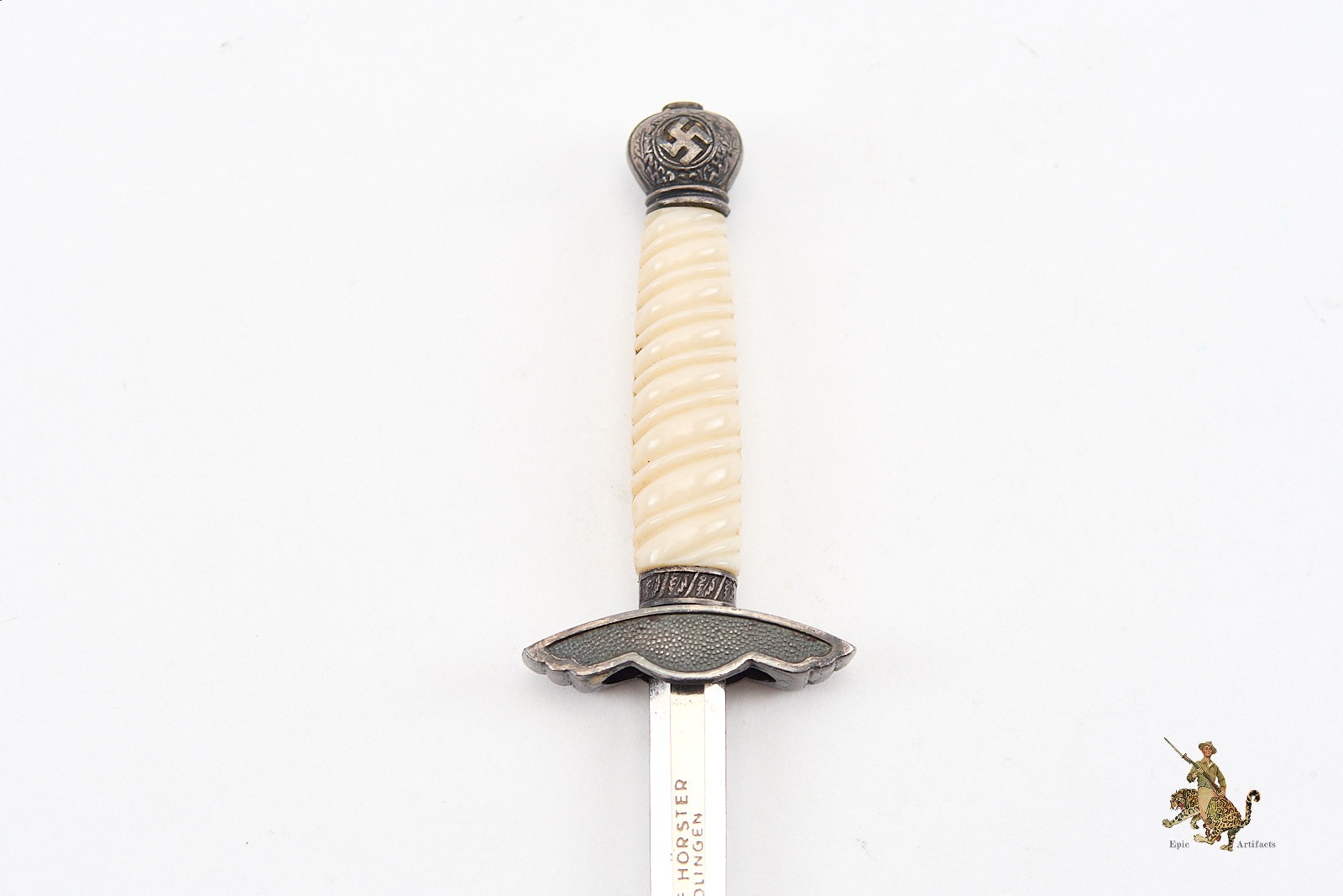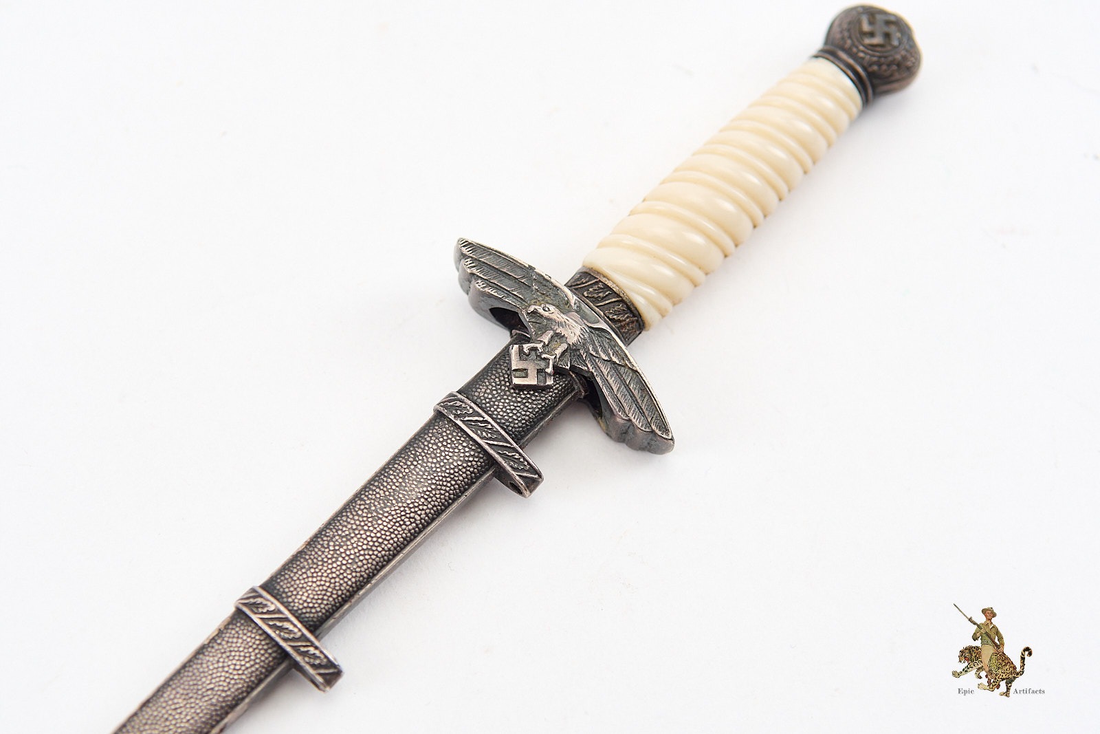 The hilt features a well-preserved white grip, free from chips or cracks. The pommel and cross guard bear sharply defined swastika emblems, with all metal fittings displaying a pleasing, untouched patina. The dagger is paired with its original scabbard, which mirrors the hilt’s aged toning and shows only minimal signs of wear. The scabbard fittings remain tight and undisturbed, further underscoring the quality and care in its preservation.