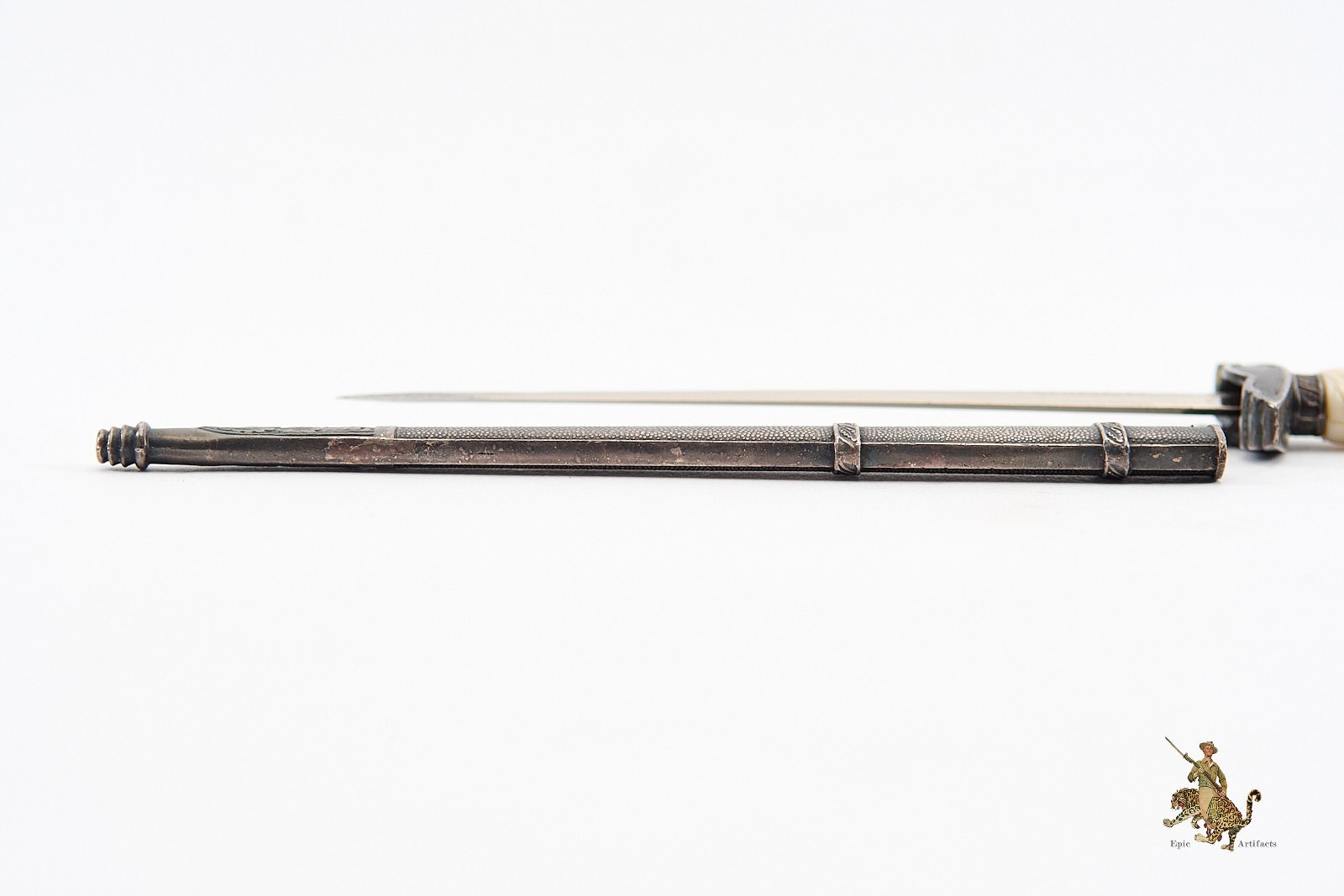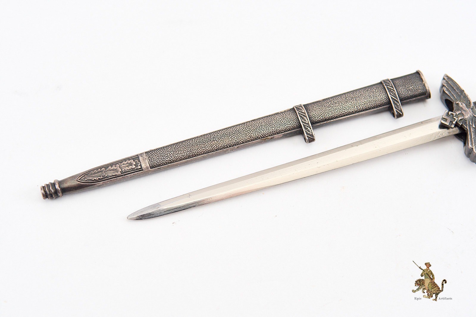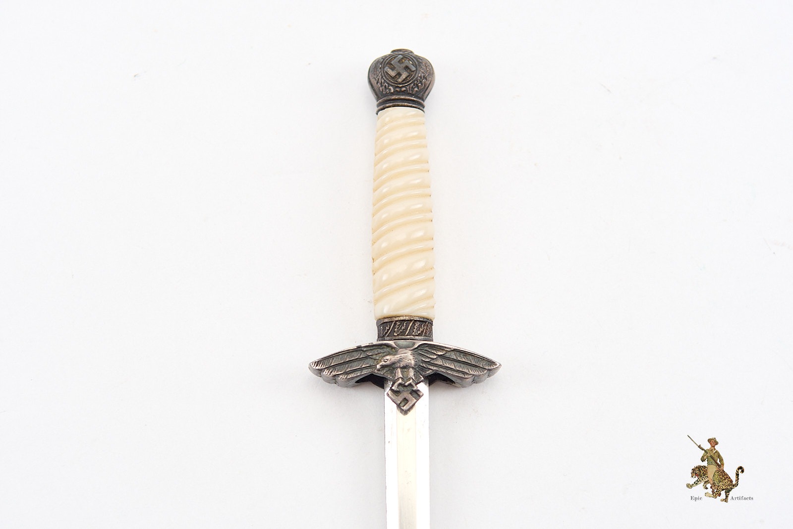 The hilt features a well-preserved white grip, free from chips or cracks. The pommel and cross guard bear sharply defined swastika emblems, with all metal fittings displaying a pleasing, untouched patina. The dagger is paired with its original scabbard, which mirrors the hilt’s aged toning and shows only minimal signs of wear. The scabbard fittings remain tight and undisturbed, further underscoring the quality and care in its preservation.