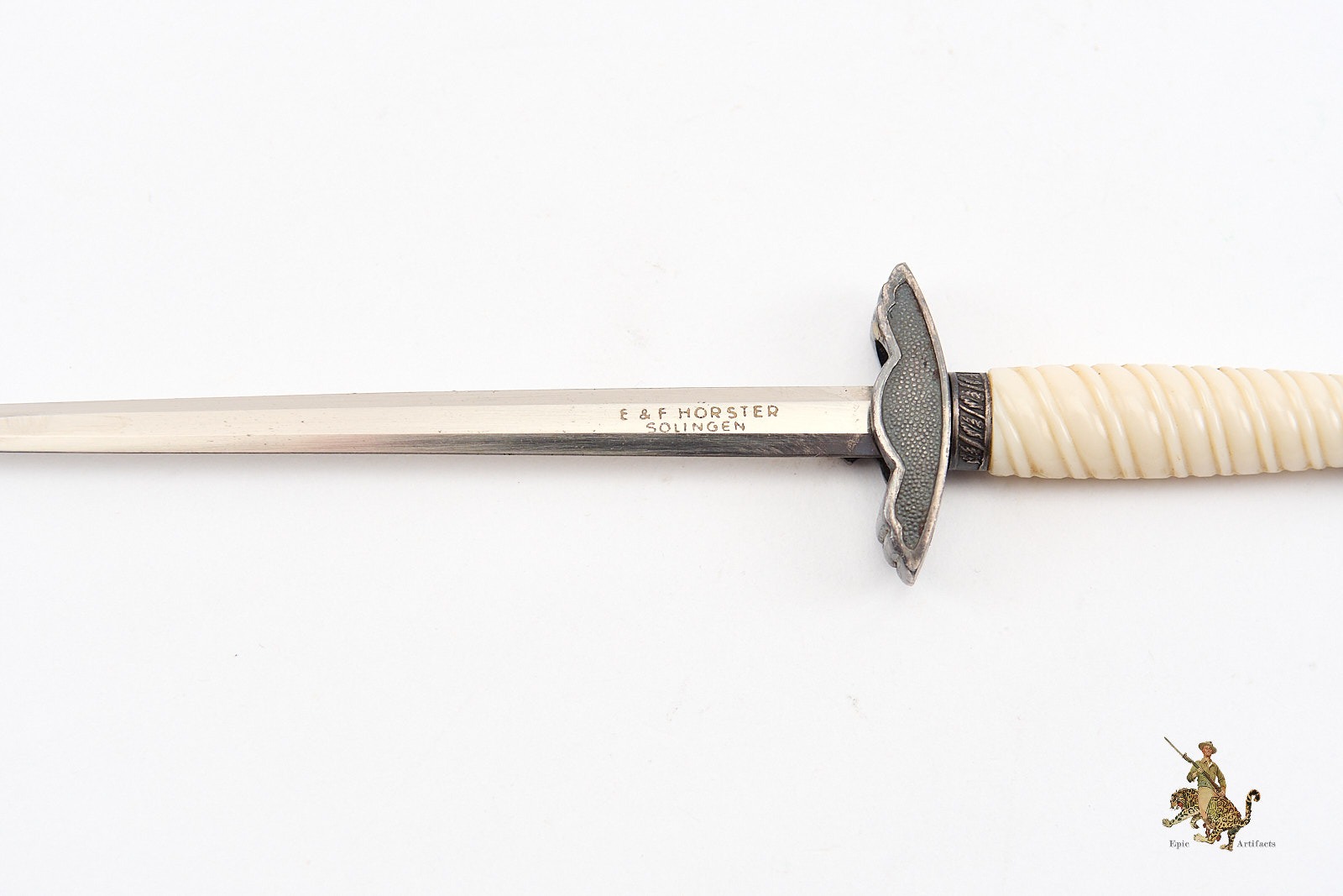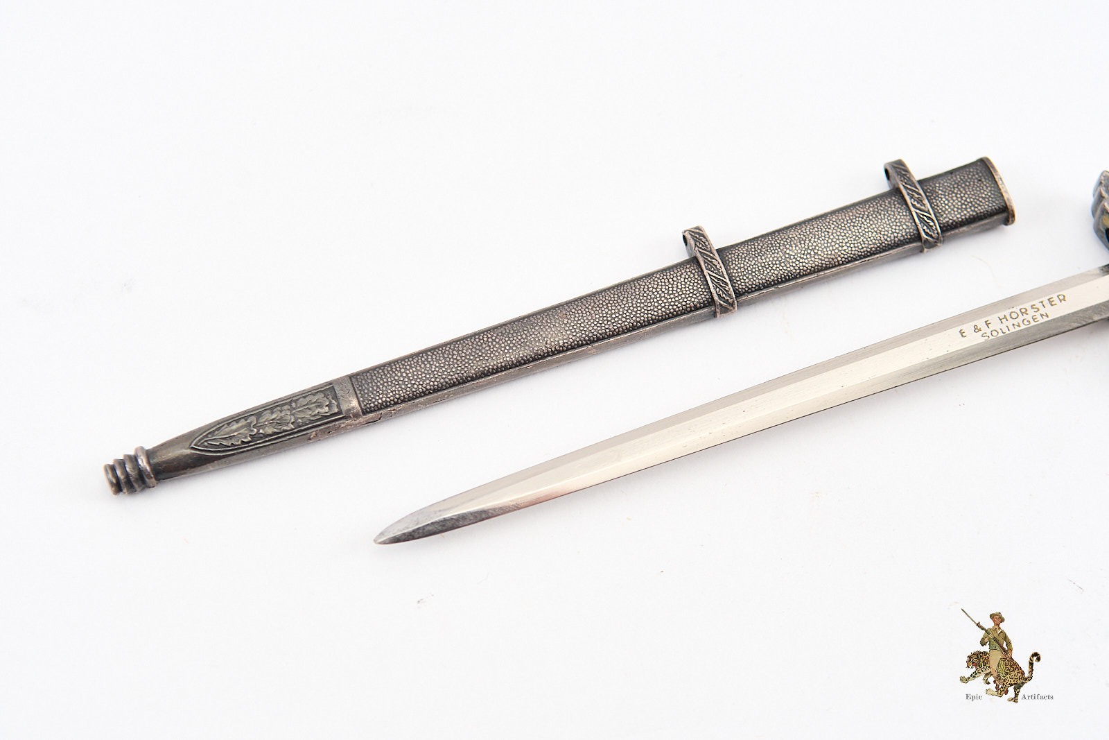 Product Description: A finely crafted example of the 2nd Model Luftwaffe Miniature Dagger – Hörster, executed in miniature scale with meticulous attention to detail, likely intended as a presentation piece or salesman’s sample. The bright, nickel-plated blade remains in excellent condition, exhibiting only minor scattered marks consistent with age. One side is crisply etched with the commercial logo of E. & F. Hörster, Solingen, a firm renowned for its precision blade manufacturing.
