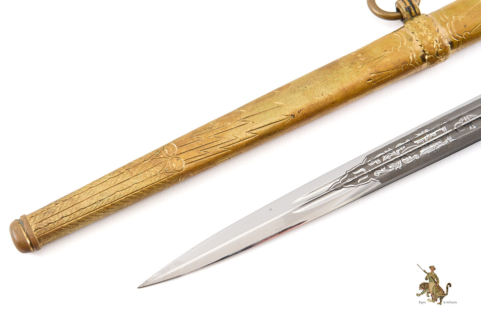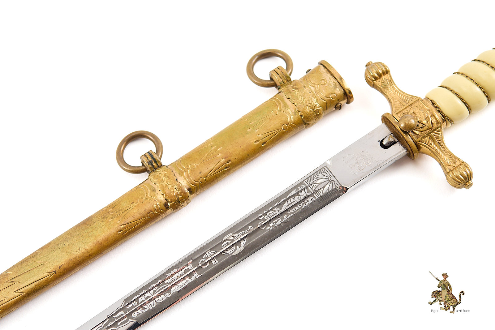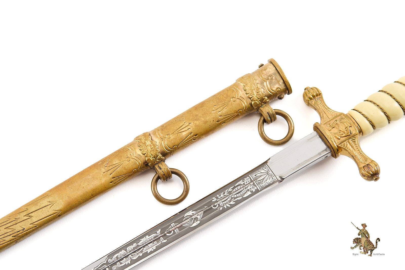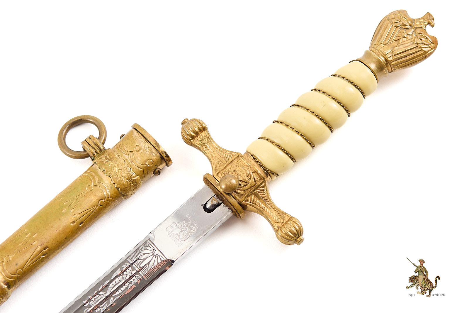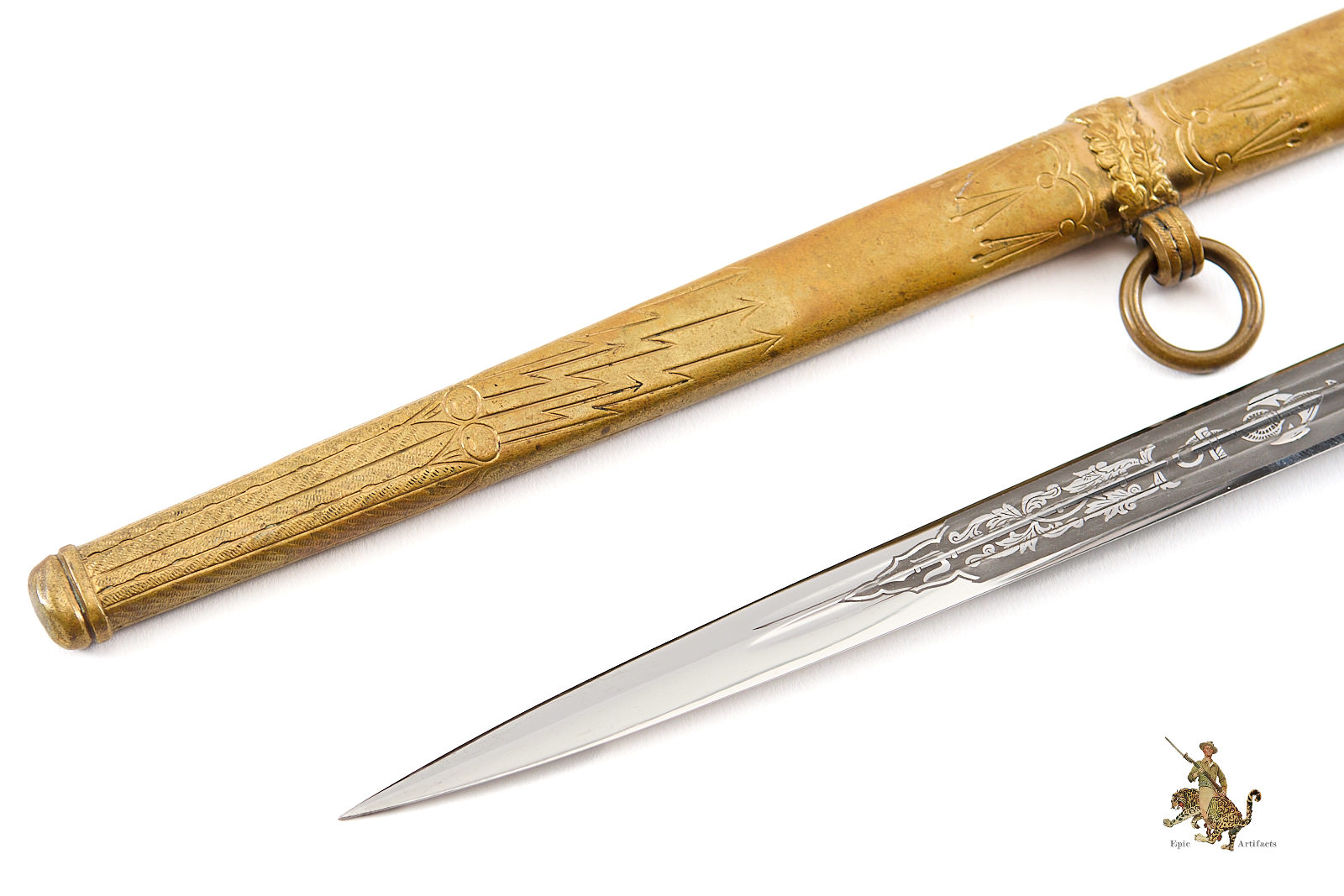 Historical Description: The German Navy adopted the use of a dress dagger for its officers in the 19th century. In 1935, the Nazi leadership reintroduced universal conscription for German men as part of a plan to greatly expand German military power. The German Navy became part of the new Wehrmacht and was renamed the “Kriegsmarine.” The leadership of the Kriegsmarine was largely very traditional and initially retained many pre-Nazi traditions including the traditional dress dagger which was unchanged since WWI. But in 1938, a new dagger was introduced for the Kriegsmarine, that bore the Nazi swastika emblem. This pattern of dress dagger is known today as the Second Model Navy Dagger. The earlier “flaming ball” device used on the first model pommel was replaced with a German national eagle emblem clutching a wreathed swastika. The crossguard on the second model Navy dagger was longer than that found on the first pattern. The standard blade was acid etched with a fouled anchor and ornate foliage pattern. Because it was expected that these daggers would be worn at sea, all parts with the exception of the blade were initially made from brass. The Second Model Navy Dagger was made by more than a dozen manufacturers in a number of variants until the end of WWII. As with all officer dress daggers, they were not issued, but were private purchase items. Officers could customize these to suit their own tastes by upgrading them and customizing them in various ways.