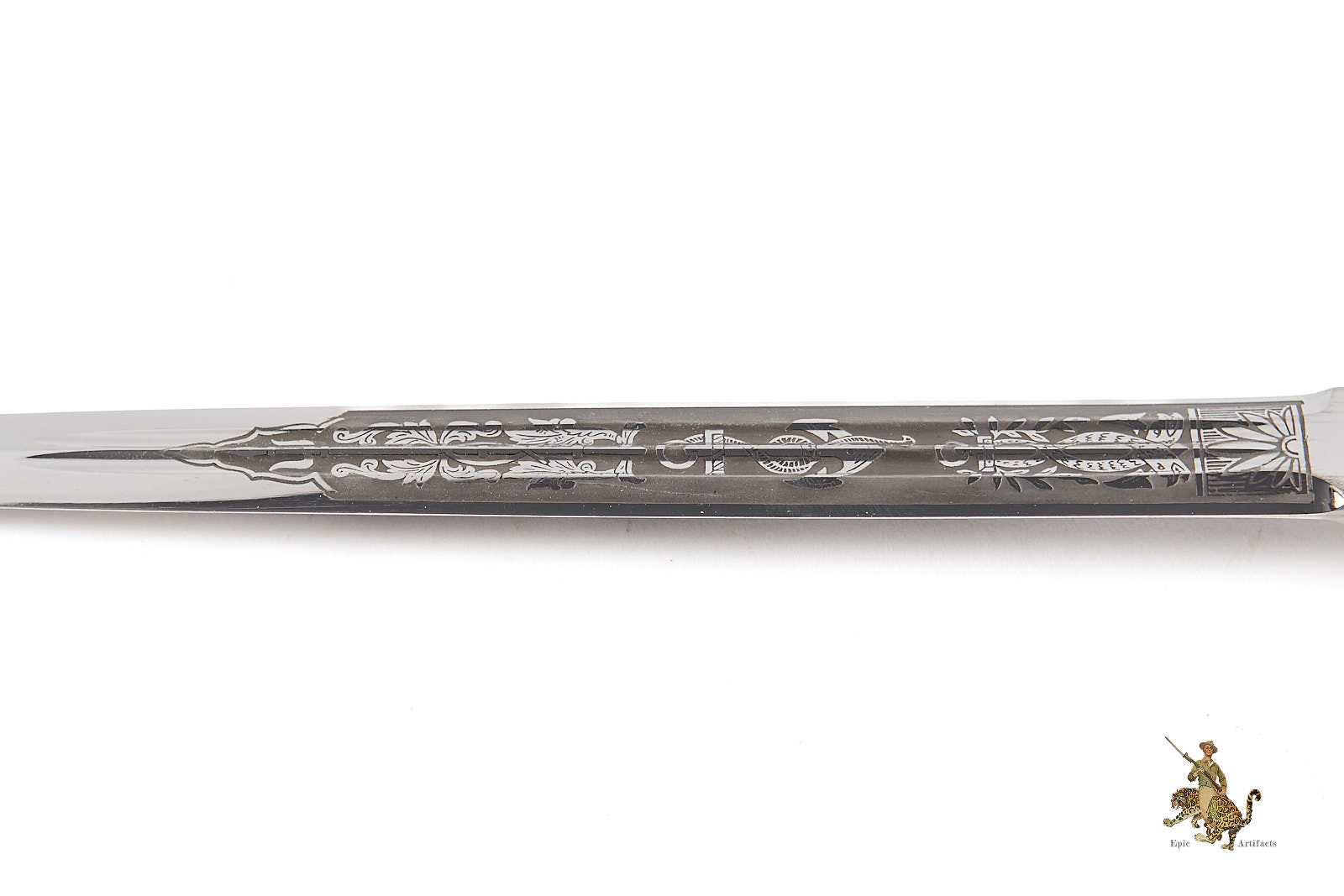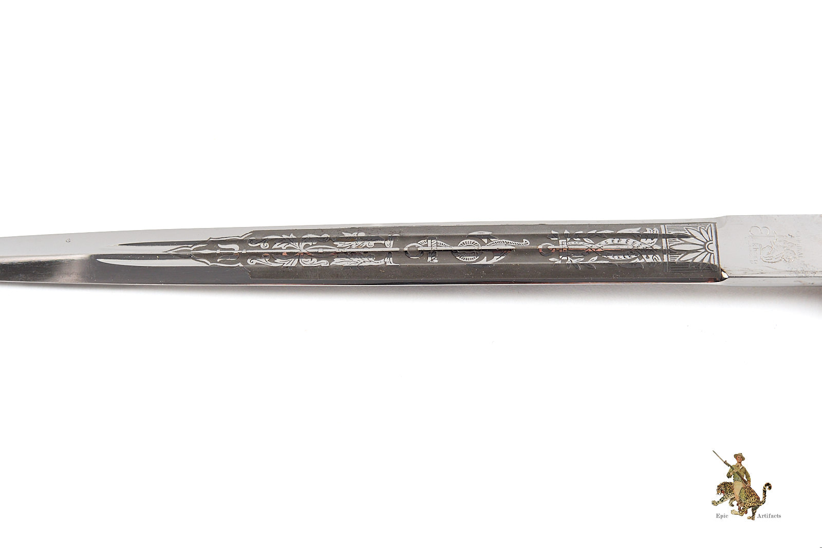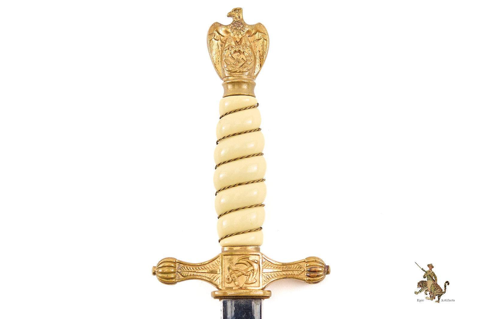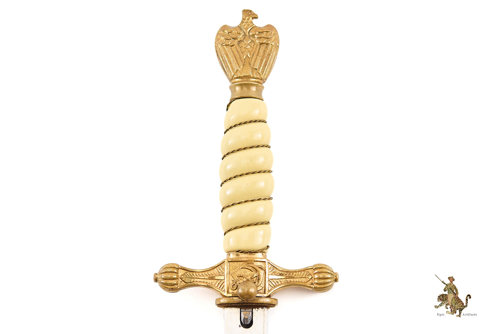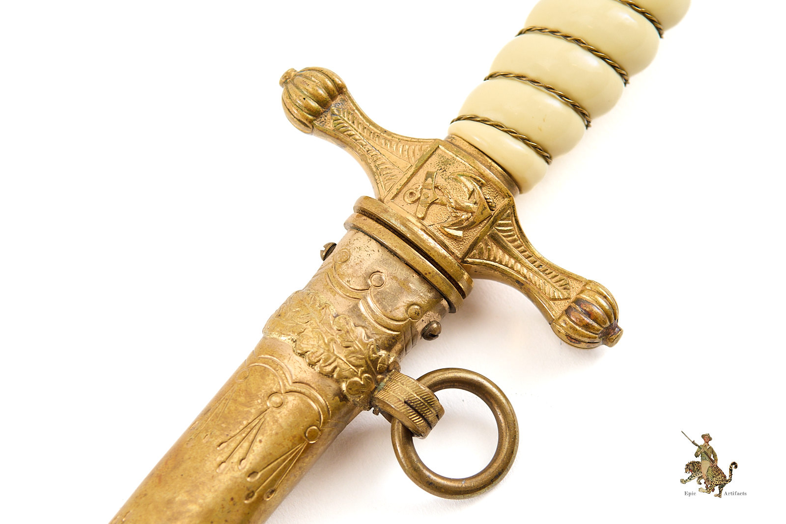 Historical Description: The German Navy adopted the use of a dress dagger for its officers in the 19th century. In 1935, the Nazi leadership reintroduced universal conscription for German men as part of a plan to greatly expand German military power. The German Navy became part of the new Wehrmacht and was renamed the “Kriegsmarine.” The leadership of the Kriegsmarine was largely very traditional and initially retained many pre-Nazi traditions including the traditional dress dagger which was unchanged since WWI. But in 1938, a new dagger was introduced for the Kriegsmarine, that bore the Nazi swastika emblem. This pattern of dress dagger is known today as the Second Model Navy Dagger. The earlier “flaming ball” device used on the first model pommel was replaced with a German national eagle emblem clutching a wreathed swastika. The crossguard on the second model Navy dagger was longer than that found on the first pattern. The standard blade was acid etched with a fouled anchor and ornate foliage pattern. Because it was expected that these daggers would be worn at sea, all parts with the exception of the blade were initially made from brass. The Second Model Navy Dagger was made by more than a dozen manufacturers in a number of variants until the end of WWII. As with all officer dress daggers, they were not issued, but were private purchase items. Officers could customize these to suit their own tastes by upgrading them and customizing them in various ways.