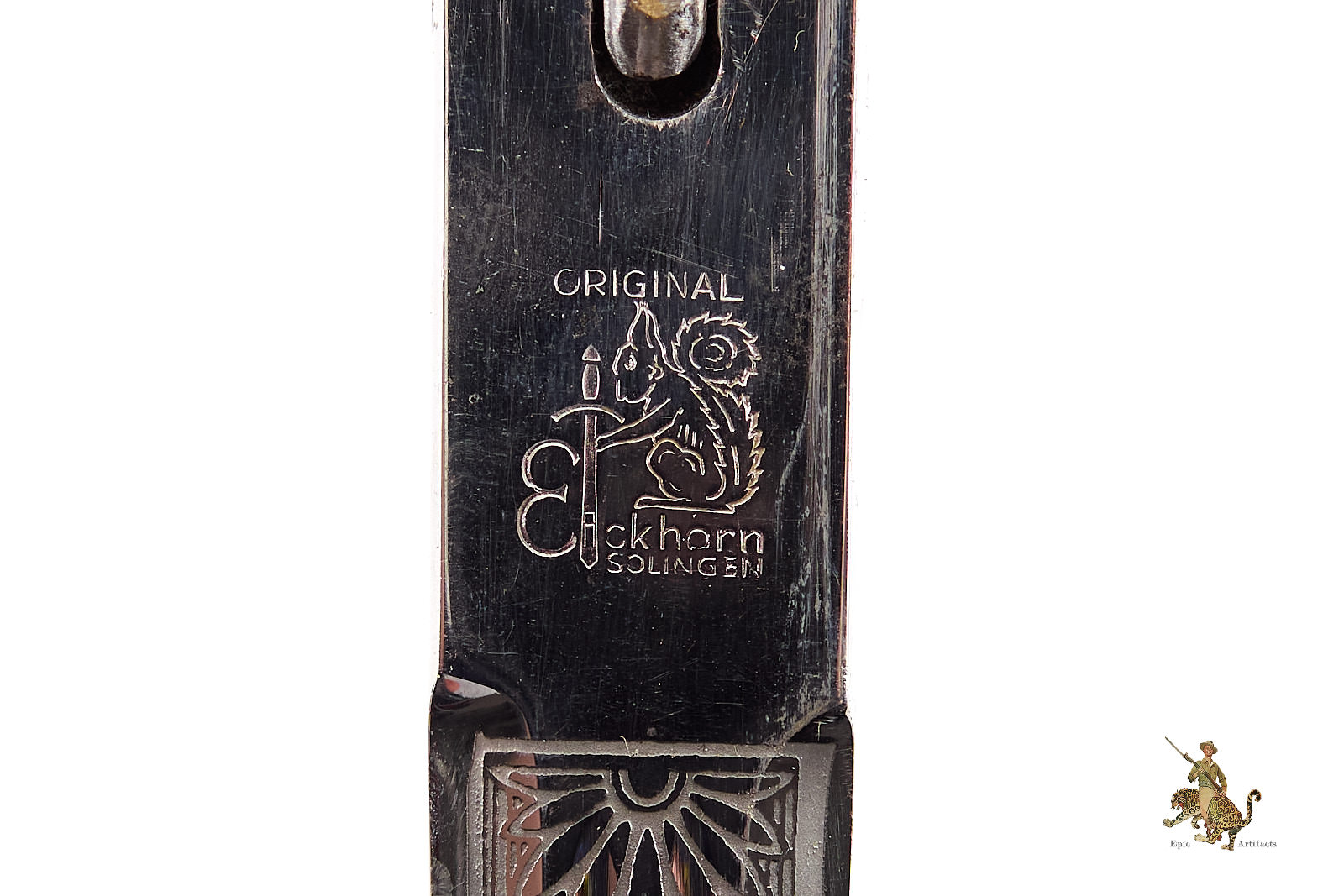 Product Description:  A fine example of the 2nd Model Navy Dagger – Carl Eickhorn, distinguished by its beautifully acid-etched “fouled anchor” blade exhibiting a deep, dark etch and a crisp “Carl Eickhorn” maker’s mark. The blade remains in Excellent condition, retaining its sharp point.  The original leather buffer pad is intact.