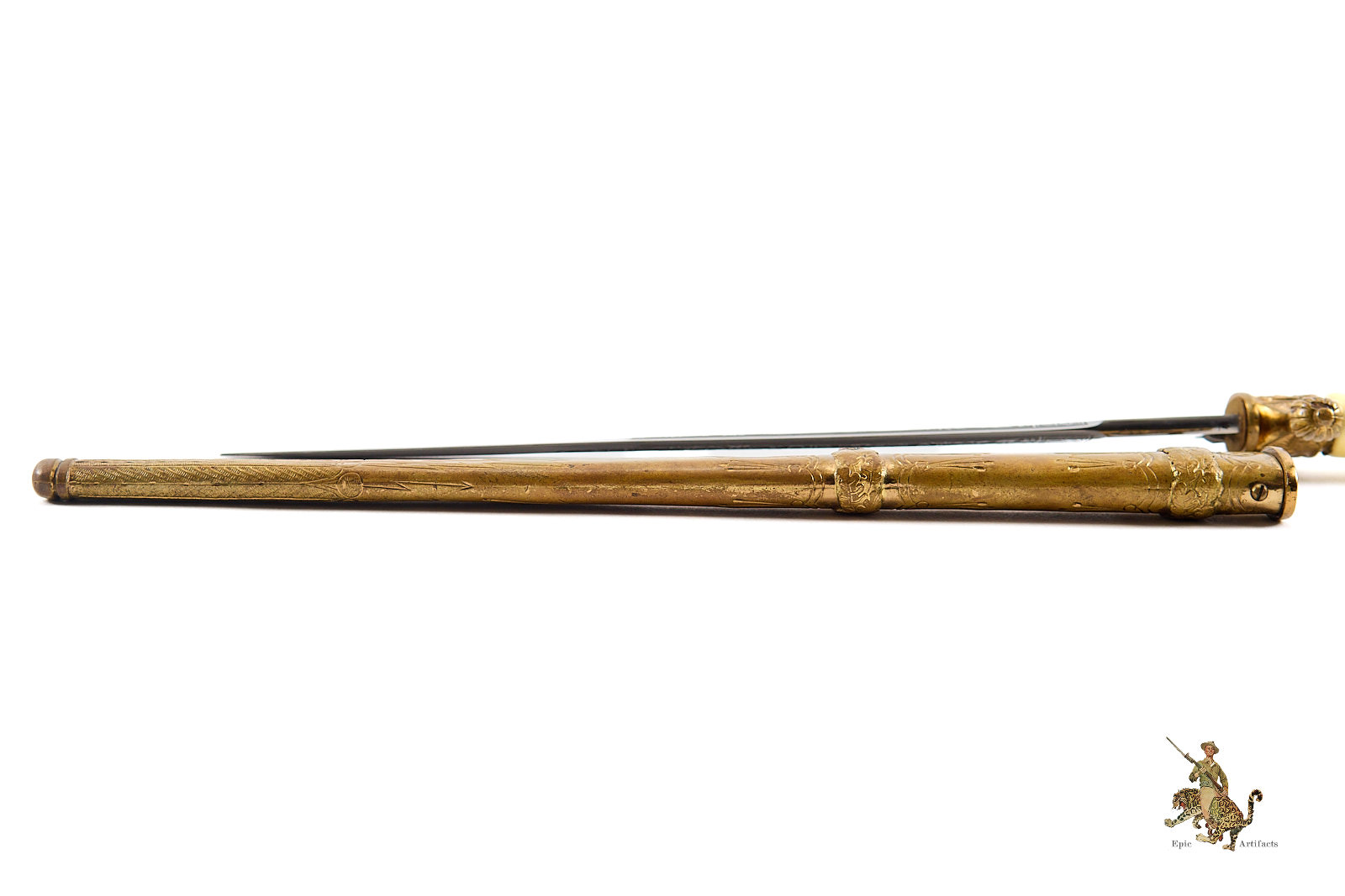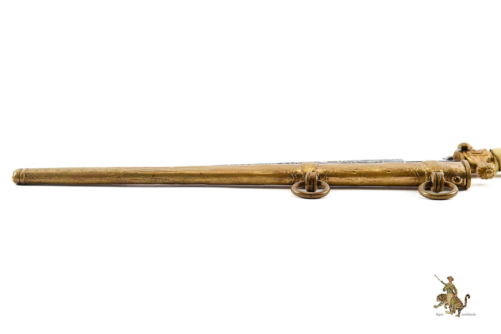 The brass-based lightning bolt scabbard displays finely hand-enhanced details to the tip and oak-leaf-and-acorn suspension bands, with both throat screws intact and the release button functioning smoothly. The original gilding has dulled, and the scabbard shows wear from age and use as shown.