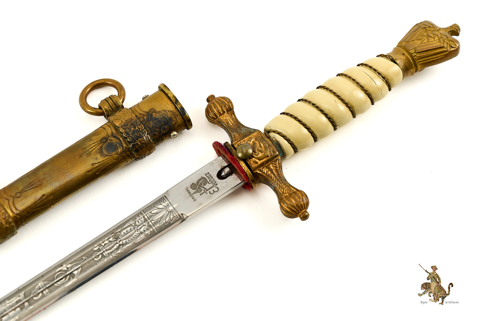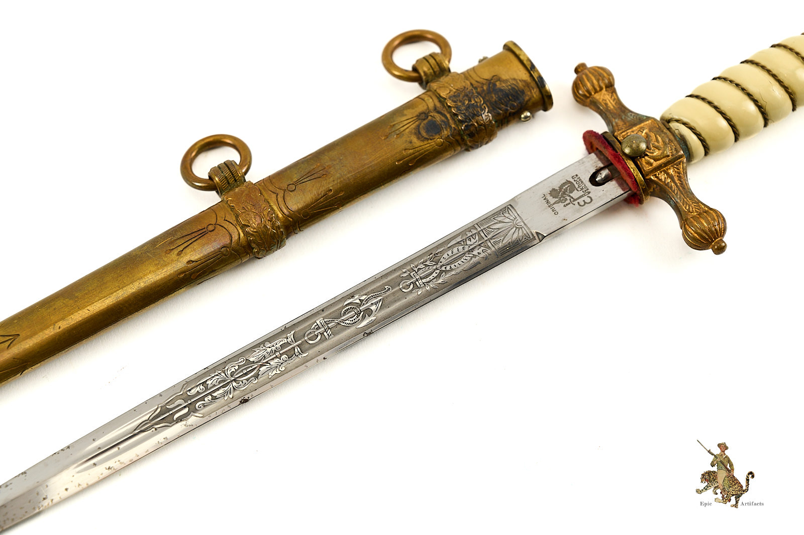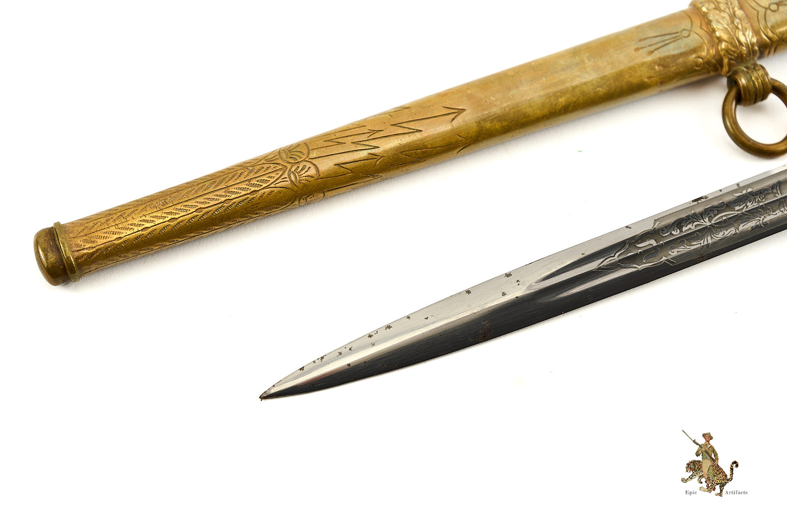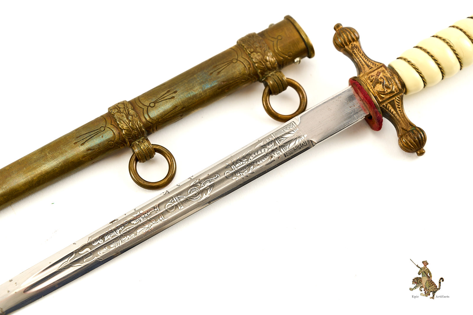 Historical Description: The German Navy adopted the use of a dress dagger for its officers in the 19th century. In 1935, the Nazi leadership reintroduced universal conscription for German men as part of a plan to greatly expand German military power. The German Navy became part of the new Wehrmacht and was renamed the “Kriegsmarine.” The leadership of the Kriegsmarine was largely very traditional and initially retained many pre-Nazi traditions including the traditional dress dagger which was unchanged since WWI. But in 1938, a new dagger was introduced for the Kriegsmarine, that bore the Nazi swastika emblem. This pattern of dress dagger is known today as the Second Model Navy Dagger. The earlier “flaming ball” device used on the first model pommel was replaced with a German national eagle emblem clutching a wreathed swastika. The crossguard on the second model Navy dagger was longer than that found on the first pattern. The standard blade was acid etched with a fouled anchor and ornate foliage pattern. Because it was expected that these daggers would be worn at sea, all parts with the exception of the blade were initially made from brass. The Second Model Navy Dagger was made by more than a dozen manufacturers in a number of variants until the end of WWII. As with all officer dress daggers, they were not issued, but were private purchase items. Officers could customize these to suit their own tastes by upgrading them and customizing them in various ways.