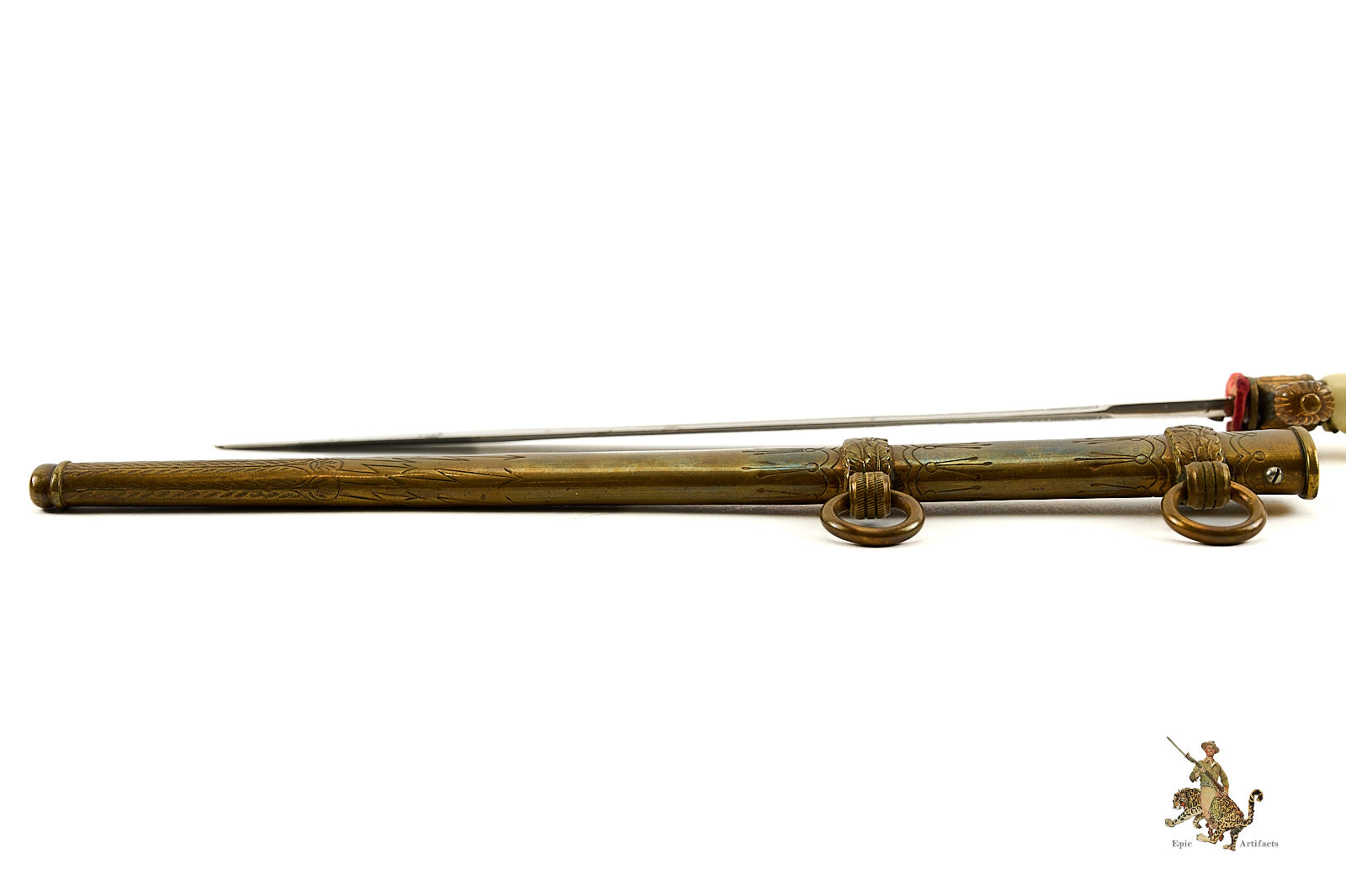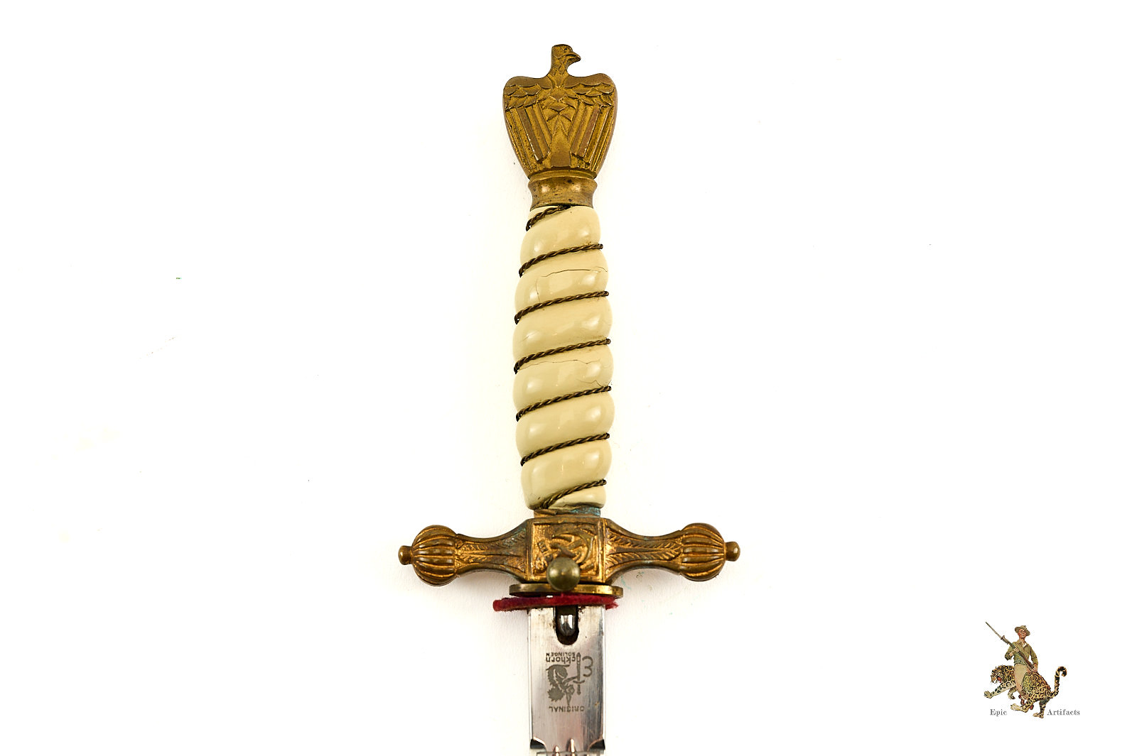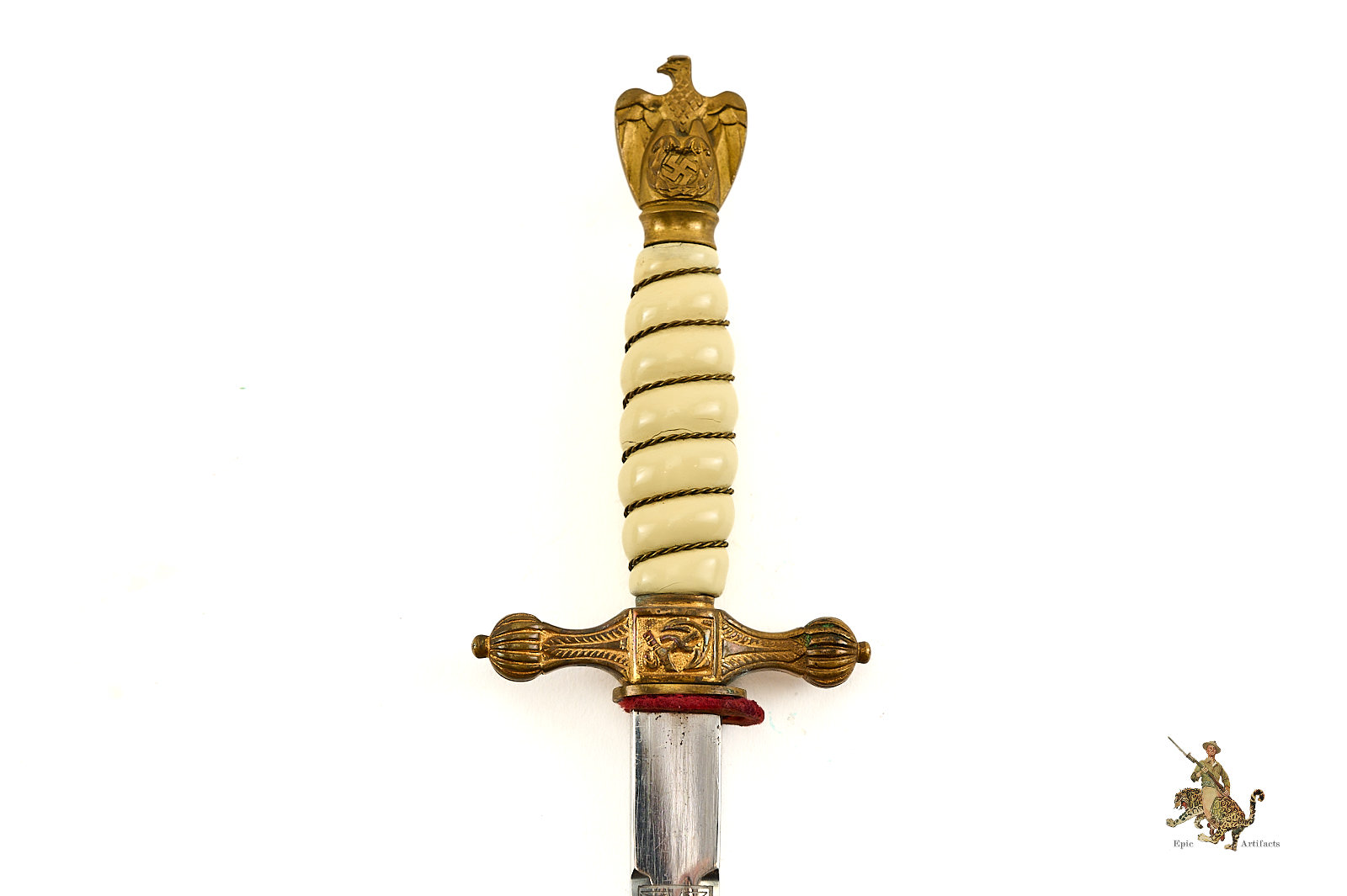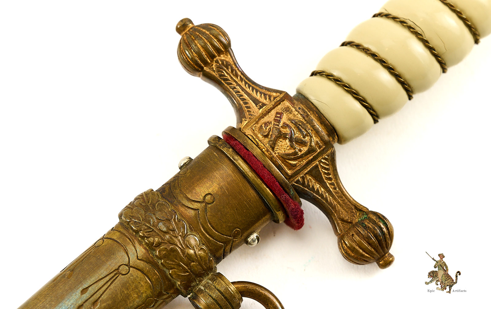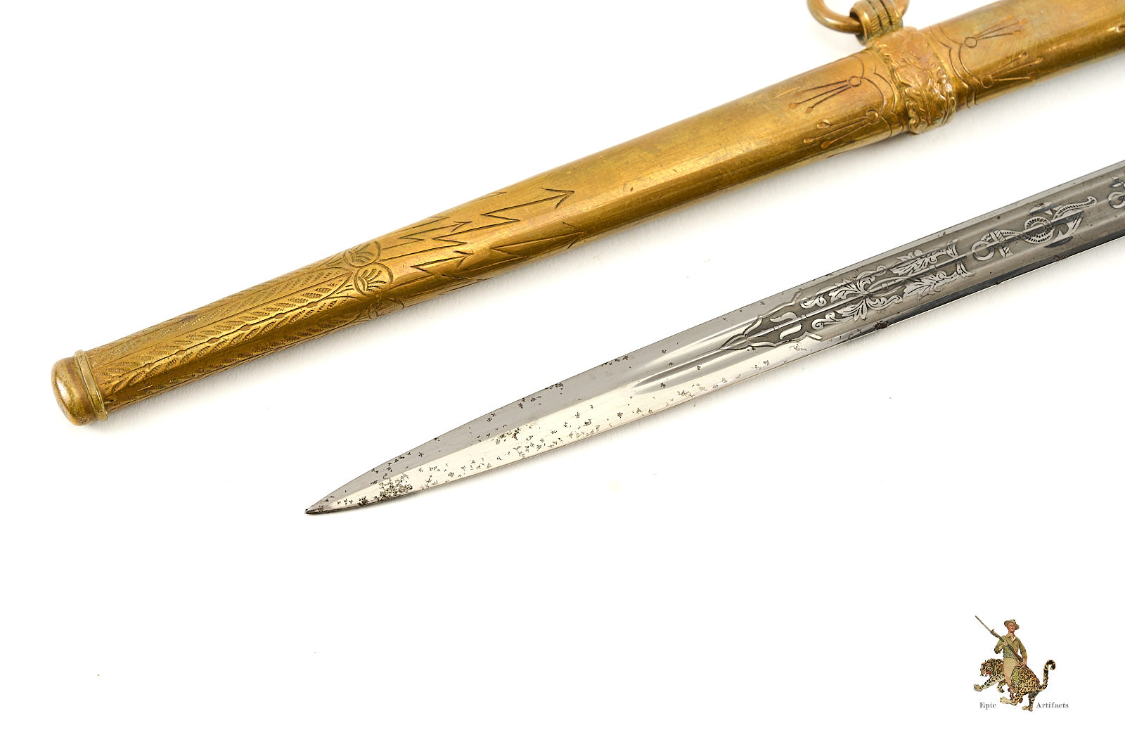 Historical Description: The German Navy adopted the use of a dress dagger for its officers in the 19th century. In 1935, the Nazi leadership reintroduced universal conscription for German men as part of a plan to greatly expand German military power. The German Navy became part of the new Wehrmacht and was renamed the “Kriegsmarine.” The leadership of the Kriegsmarine was largely very traditional and initially retained many pre-Nazi traditions including the traditional dress dagger which was unchanged since WWI. But in 1938, a new dagger was introduced for the Kriegsmarine, that bore the Nazi swastika emblem. This pattern of dress dagger is known today as the Second Model Navy Dagger. The earlier “flaming ball” device used on the first model pommel was replaced with a German national eagle emblem clutching a wreathed swastika. The crossguard on the second model Navy dagger was longer than that found on the first pattern. The standard blade was acid etched with a fouled anchor and ornate foliage pattern. Because it was expected that these daggers would be worn at sea, all parts with the exception of the blade were initially made from brass. The Second Model Navy Dagger was made by more than a dozen manufacturers in a number of variants until the end of WWII. As with all officer dress daggers, they were not issued, but were private purchase items. Officers could customize these to suit their own tastes by upgrading them and customizing them in various ways.