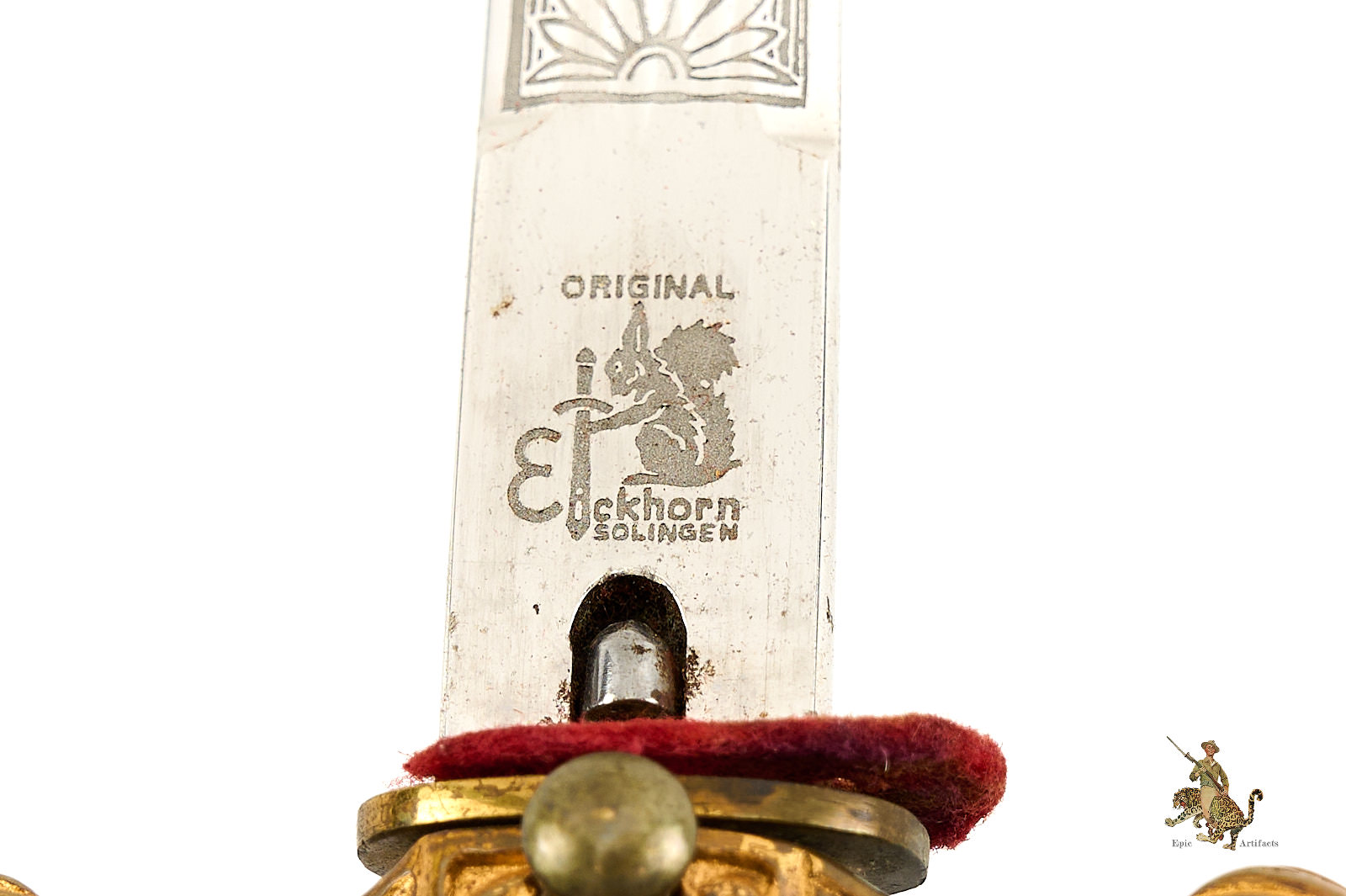Product Description: A fine example of the 2nd Model Navy Dagger – Carl Eickhorn, distinguished by its beautifully acid-etched “fouled anchor” blade exhibiting a deep, dark etch and a crisp “Carl Eickhorn” maker’s mark. The blade remains in Excellent condition, retaining its sharp point. The original leather buffer pad has been replaced by a red felt pad, but pad has tear.