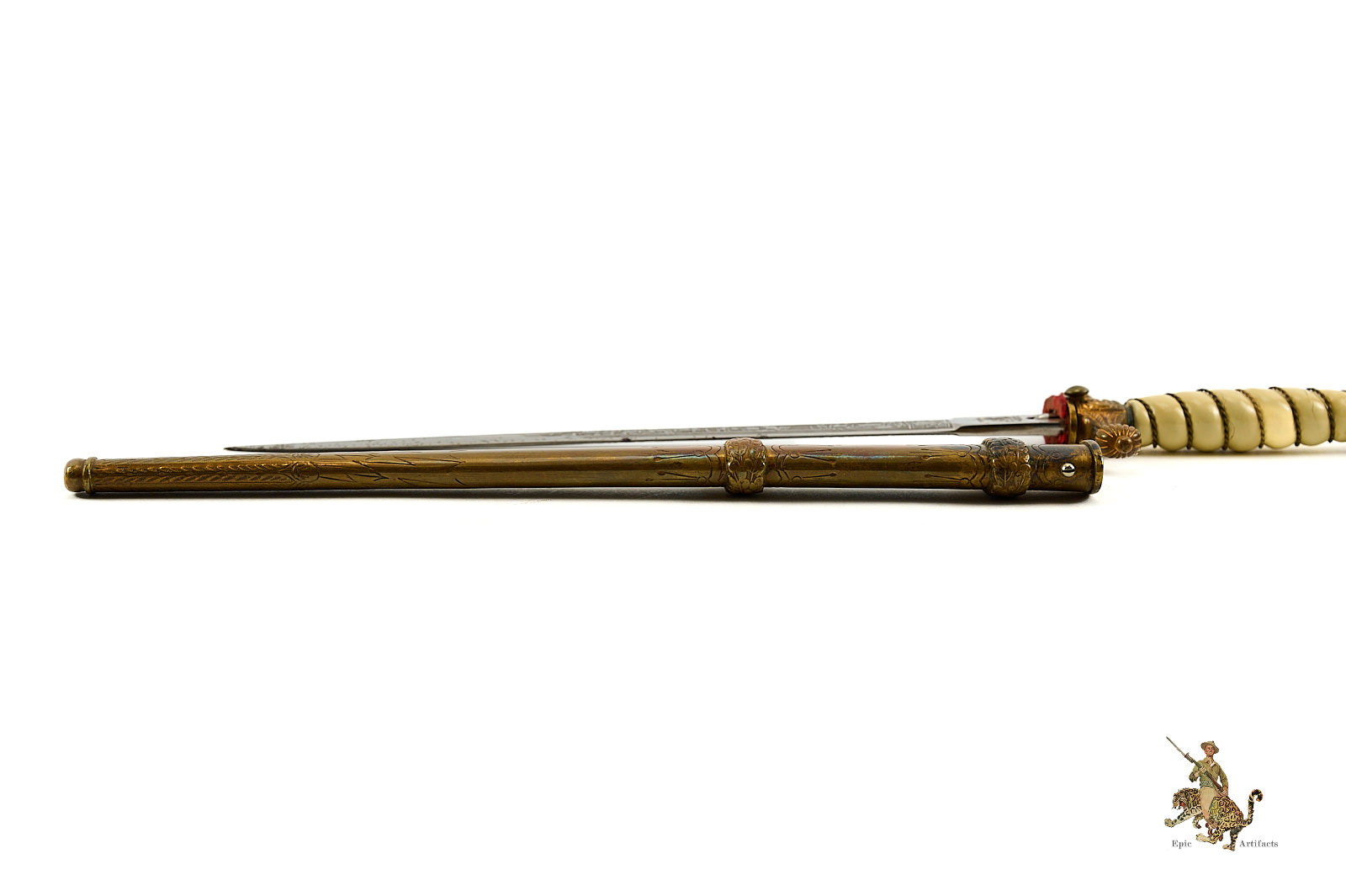 The brass-based lightning bolt scabbard displays finely hand-enhanced details to the tip and oak-leaf-and-acorn suspension bands, with both throat screws intact and the release button functioning smoothly. The original gilding has dulled, and the scabbard shows corrosion in multiple spots as shown.