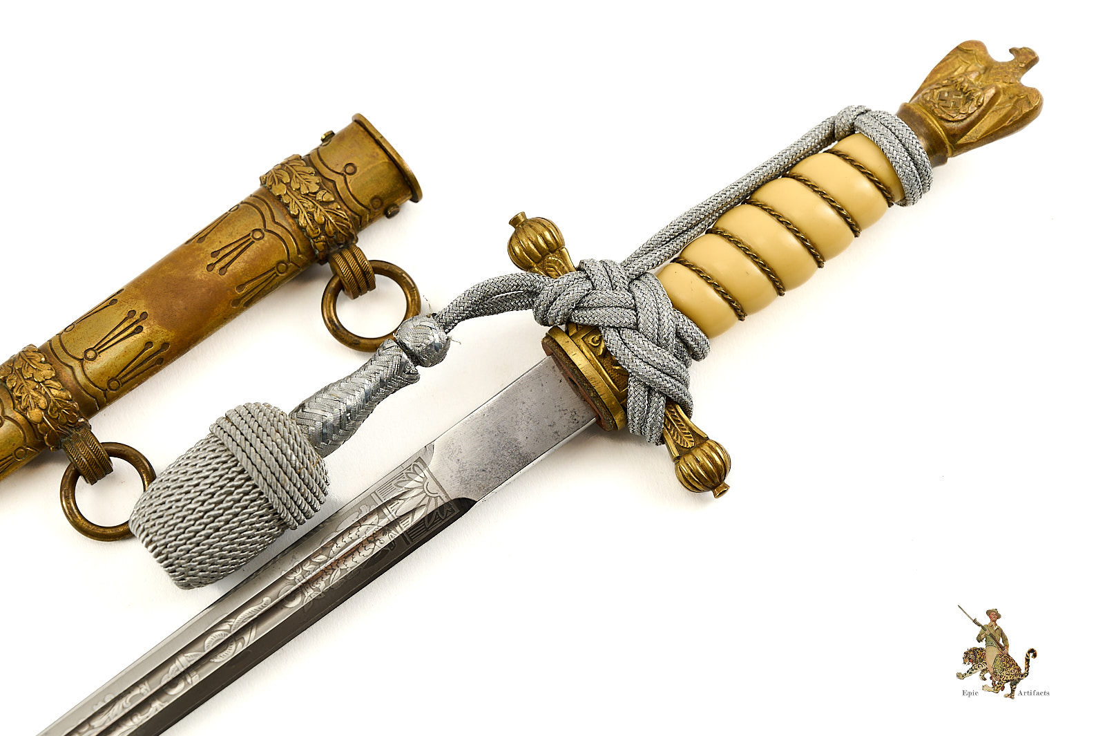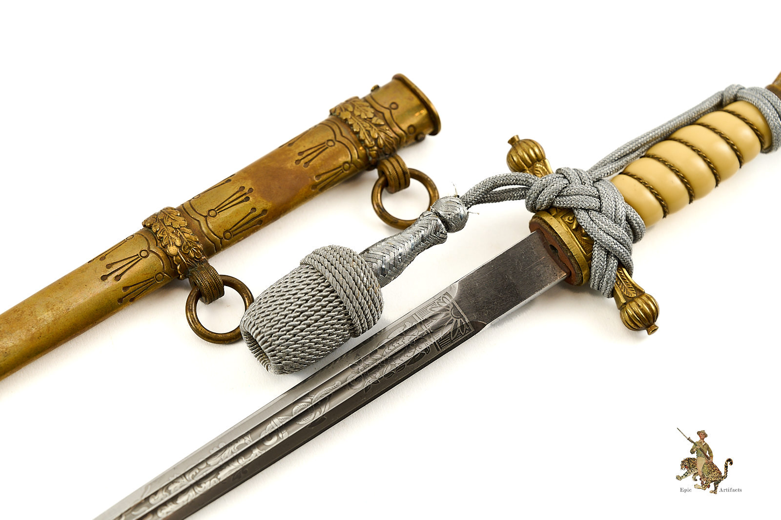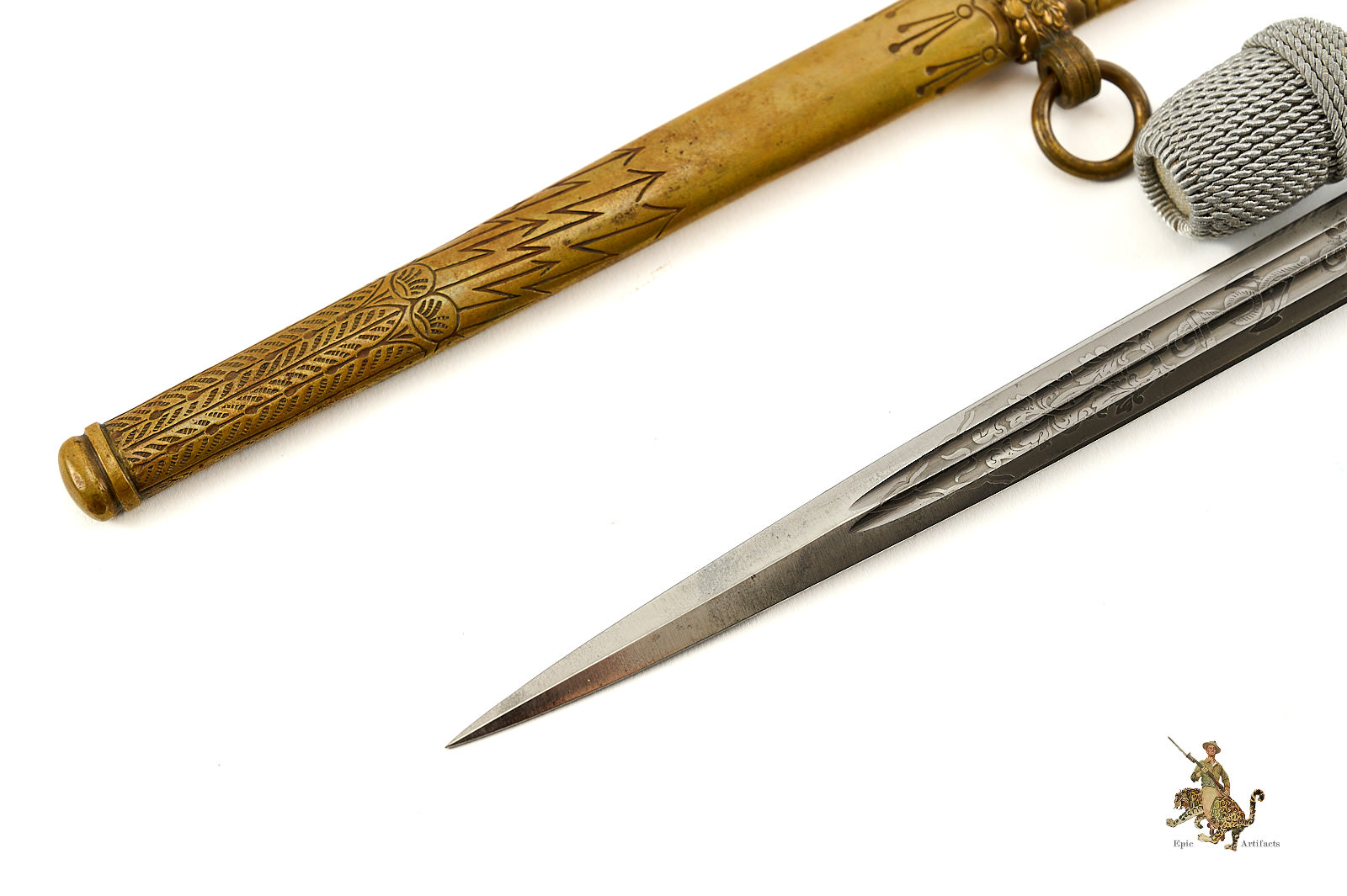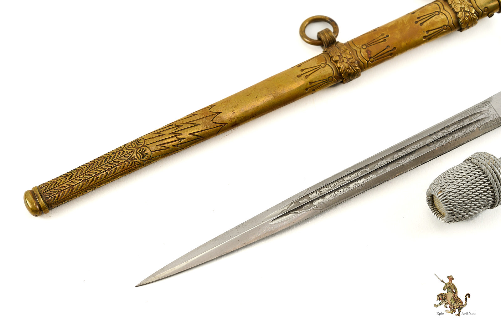 Historical Description: The German Navy adopted the use of a dress dagger for its officers in the 19th century. In 1935, the Nazi leadership reintroduced universal conscription for German men as part of a plan to greatly expand German military power. The German Navy became part of the new Wehrmacht and was renamed the “Kriegsmarine.” The leadership of the Kriegsmarine was largely very traditional and initially retained many pre-Nazi traditions including the traditional dress dagger which was unchanged since WWI. But in 1938, a new dagger was introduced for the Kriegsmarine, that bore the Nazi swastika emblem. This pattern of dress dagger is known today as the Second Model Navy Dagger. The earlier “flaming ball” device used on the first model pommel was replaced with a German national eagle emblem clutching a wreathed swastika. The crossguard on the second model Navy dagger was longer than that found on the first pattern. The standard blade was acid etched with a fouled anchor and ornate foliage pattern. Because it was expected that these daggers would be worn at sea, all parts with the exception of the blade were initially made from brass. The Second Model Navy Dagger was made by more than a dozen manufacturers in a number of variants until the end of WWII. As with all officer dress daggers, they were not issued, but were private purchase items. Officers could customize these to suit their own tastes by upgrading them and customizing them in various ways.