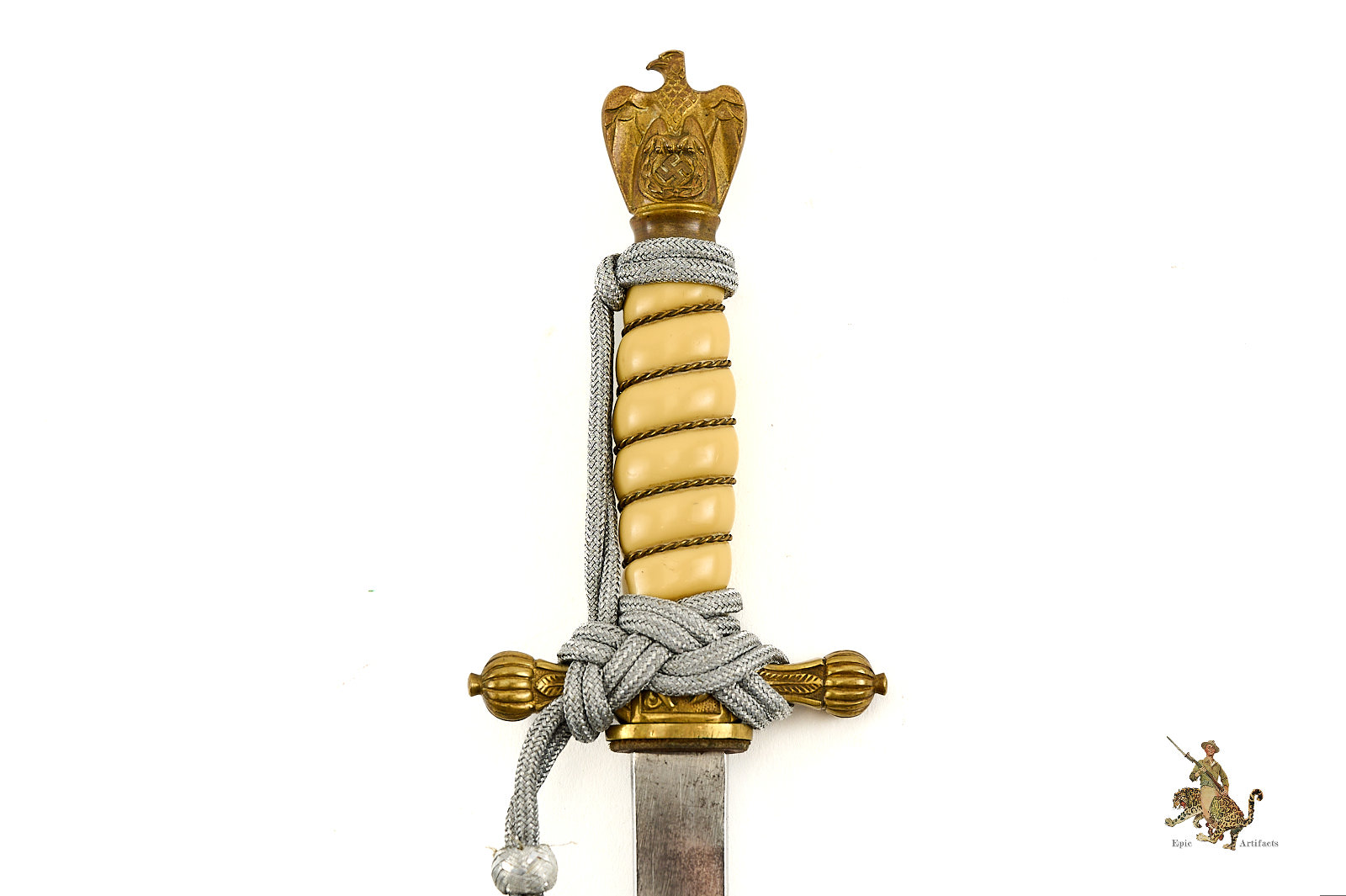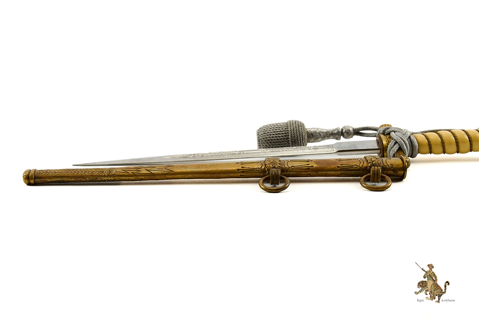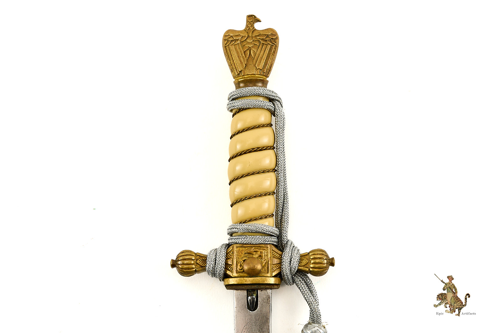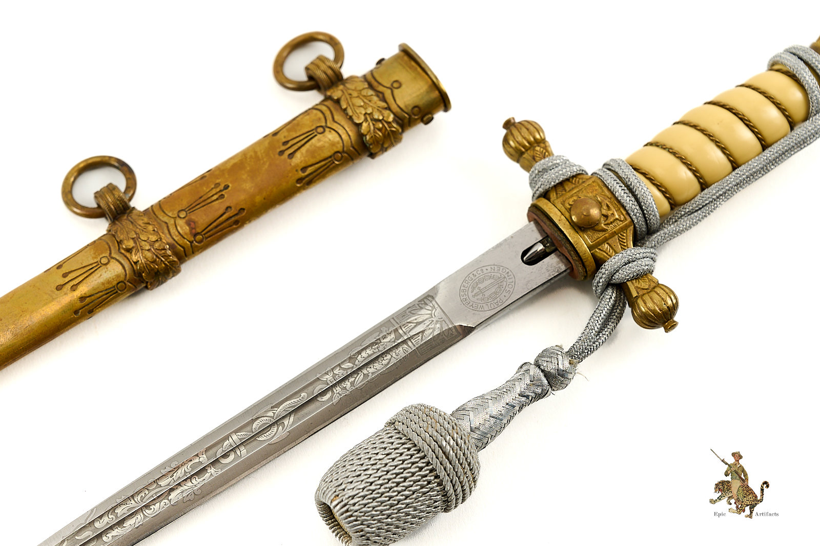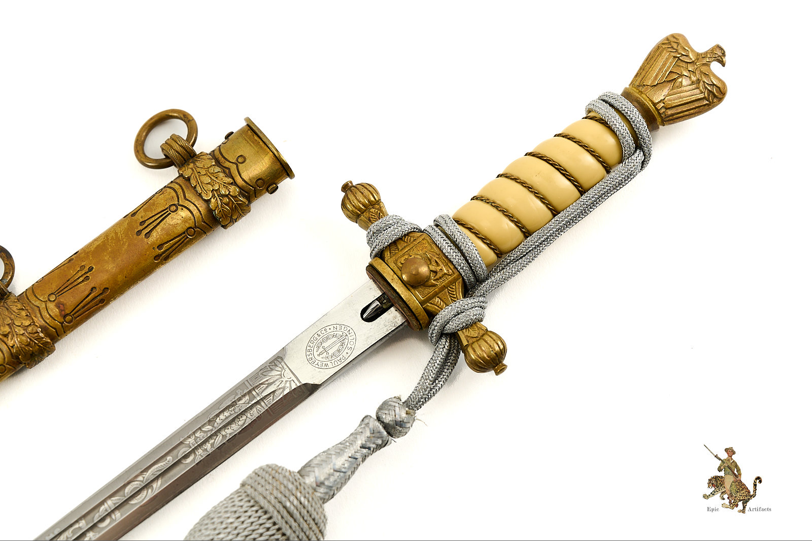 Historical Description: The German Navy adopted the use of a dress dagger for its officers in the 19th century. In 1935, the Nazi leadership reintroduced universal conscription for German men as part of a plan to greatly expand German military power. The German Navy became part of the new Wehrmacht and was renamed the “Kriegsmarine.” The leadership of the Kriegsmarine was largely very traditional and initially retained many pre-Nazi traditions including the traditional dress dagger which was unchanged since WWI. But in 1938, a new dagger was introduced for the Kriegsmarine, that bore the Nazi swastika emblem. This pattern of dress dagger is known today as the Second Model Navy Dagger. The earlier “flaming ball” device used on the first model pommel was replaced with a German national eagle emblem clutching a wreathed swastika. The crossguard on the second model Navy dagger was longer than that found on the first pattern. The standard blade was acid etched with a fouled anchor and ornate foliage pattern. Because it was expected that these daggers would be worn at sea, all parts with the exception of the blade were initially made from brass. The Second Model Navy Dagger was made by more than a dozen manufacturers in a number of variants until the end of WWII. As with all officer dress daggers, they were not issued, but were private purchase items. Officers could customize these to suit their own tastes by upgrading them and customizing them in various ways.