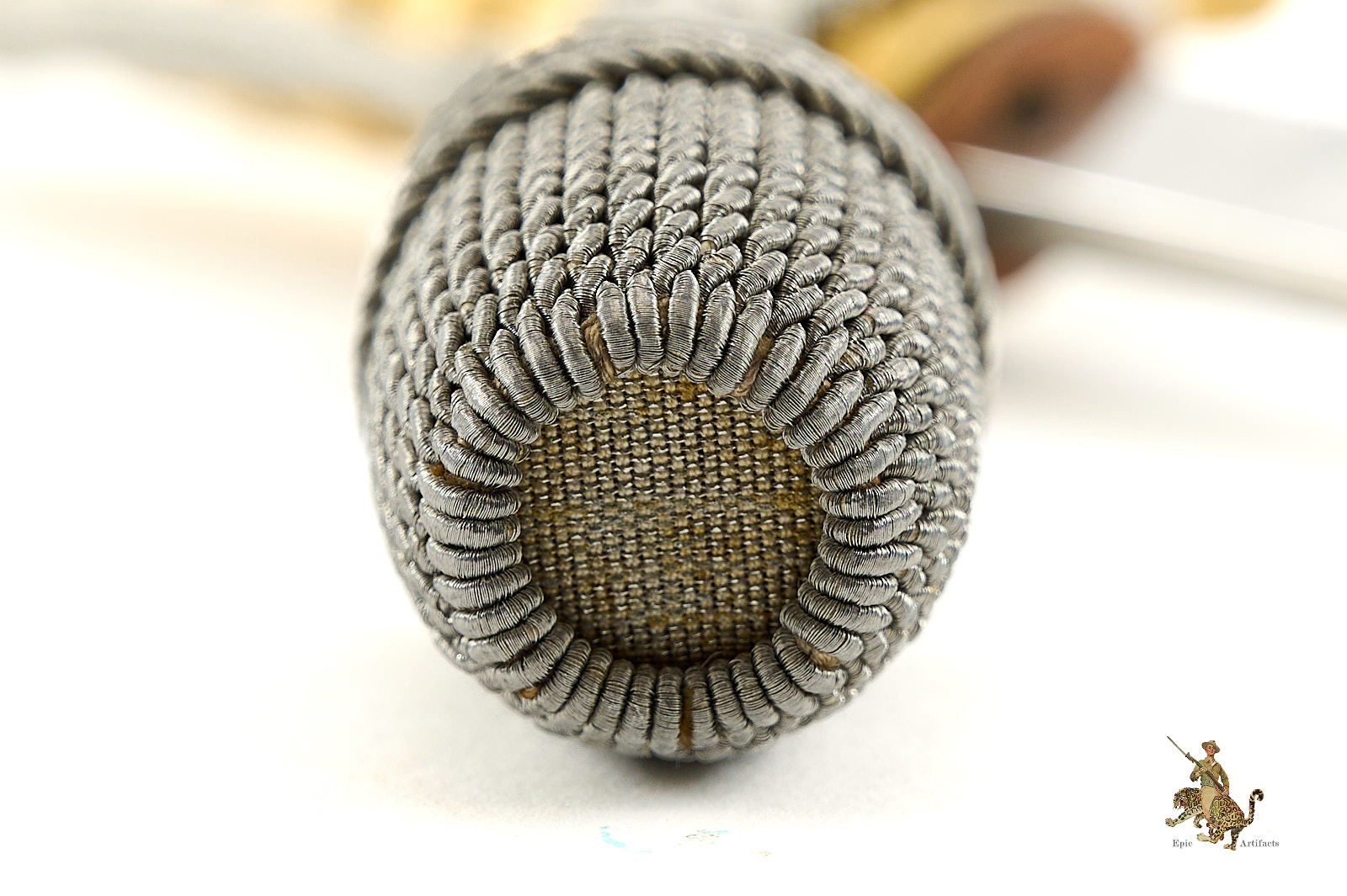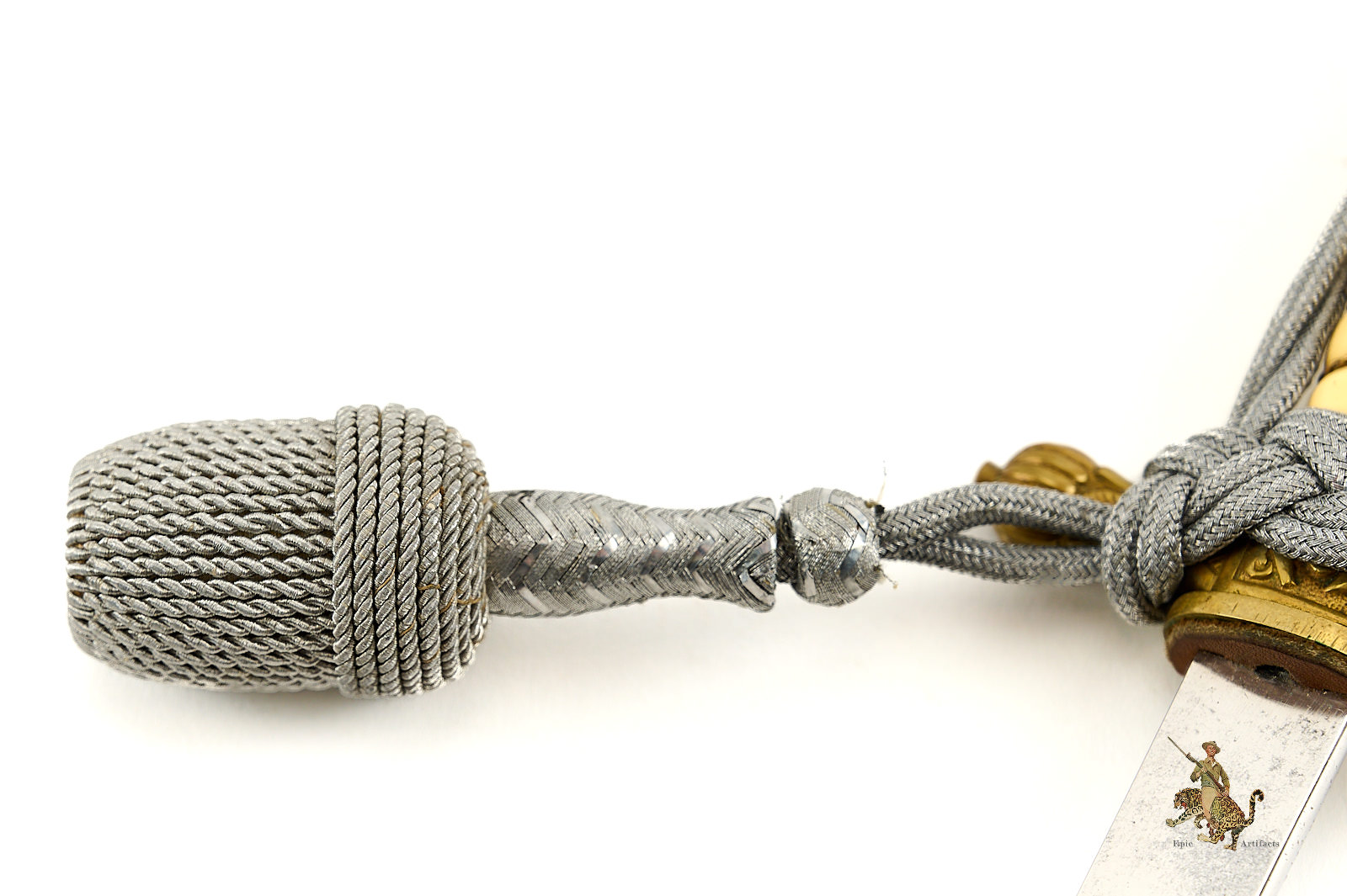 The brass-based lightning bolt scabbard displays finely hand-enhanced details to the tip and oak-leaf-and-acorn suspension bands, with both throat screws intact and the release button functioning smoothly. Although much of the original gilding has faded through age and cleaning, the overall presentation remains highly attractive.