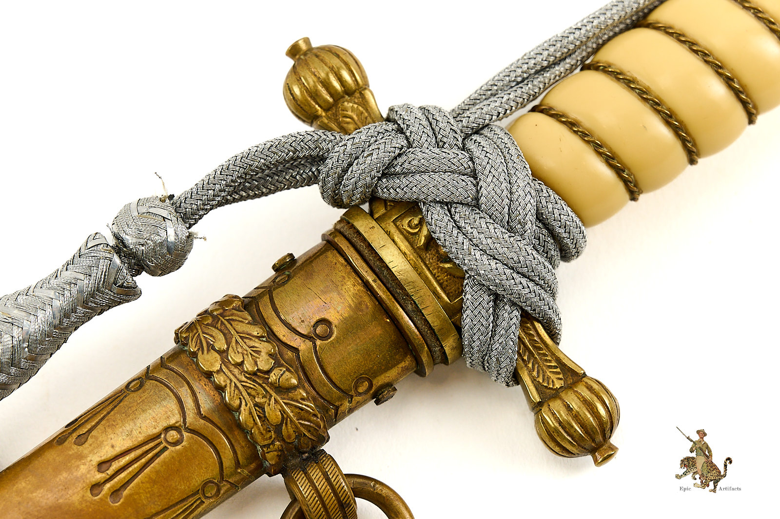 The gilt brass crossguard and pommel, the latter featuring the proud Kriegsmarine eagle, retain sharp detailing and a pleasing patina. The wood-based, celluloid-covered grip is without damage, with its double-twisted brass wire wrap still tightly bound. Accompanied by a well-preserved portepee.