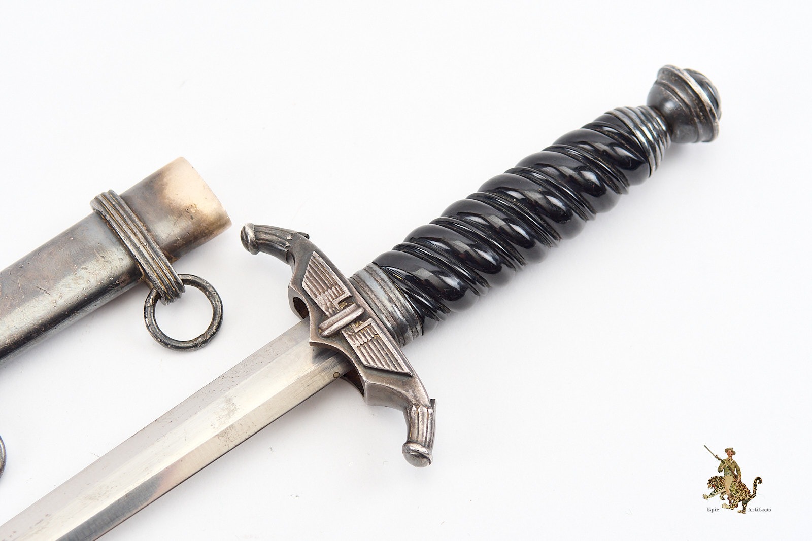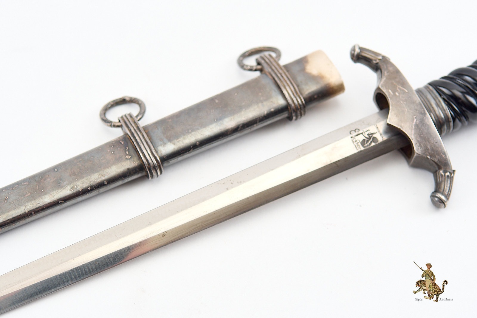 Of particular note is the rare single-piece scabbard variant—an experimental form that omits the usual two-piece throat collar. This rare scabbard design is seldom encountered and makes the dagger especially desirable. The scabbard itself remains in excellent condition overall, showing only two small dings to the lower front panel, typical from period wear (such as exiting vehicles). Both suspension rings remain intact and undisturbed.