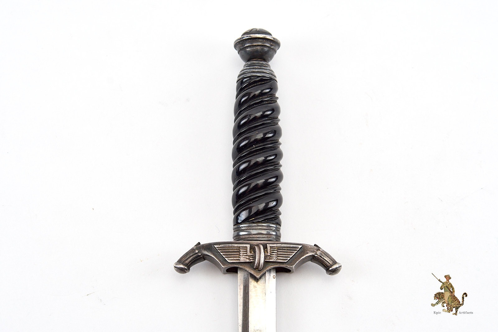 Historical Description: The German railway protection organizations (Bahnschutz) were made up of railway police as well as railway employees tasked with serving as a security force. The men of the Bahnschutz wore special insignia and uniforms and were also authorized to carry a special dagger. Initially, these men used a dagger that was identical to the German Army style of the period, but with a black grip, instead of the light shade of the Army dagger grip. Most of these were manufactured by the firm of Robert Klaas. In 1937, a new model of Bahnschutz dagger was introduced, with a totally different and organization-specific design. This type, known to collectors as the second model, featured the same black colored grip, but with new, silvered aluminum handle fittings, with the winged wheel emblem of the Reichsbahn on the crossguard. The scabbard had a brushed plated finish that matched the handle fittings. Because the Bahnschutz was never a large organization, these daggers were made in small numbers, making them very rare and desirable to collectors.