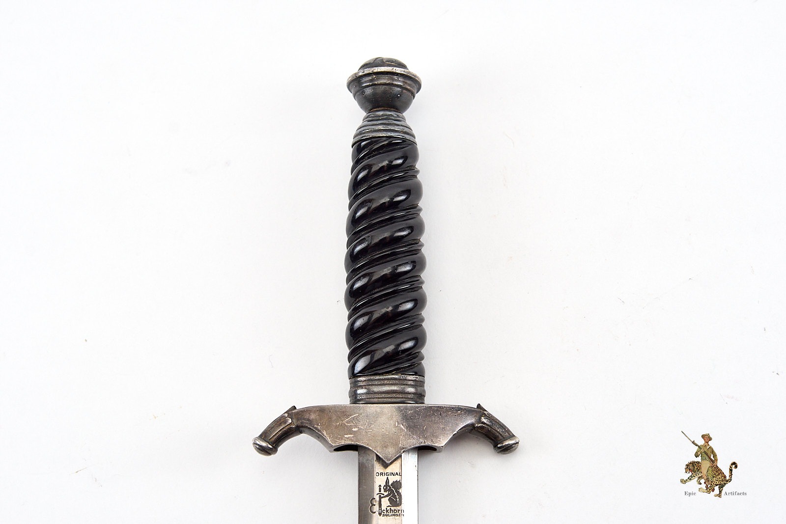 The handle is equally striking. The glossy grip remains completely free of cracks or chips, while the plated aluminum fittings preserve virtually all of their original finish. The crossguard displays the well-known die flaw on the left wing, a textbook feature found on genuine Eickhorn examples.