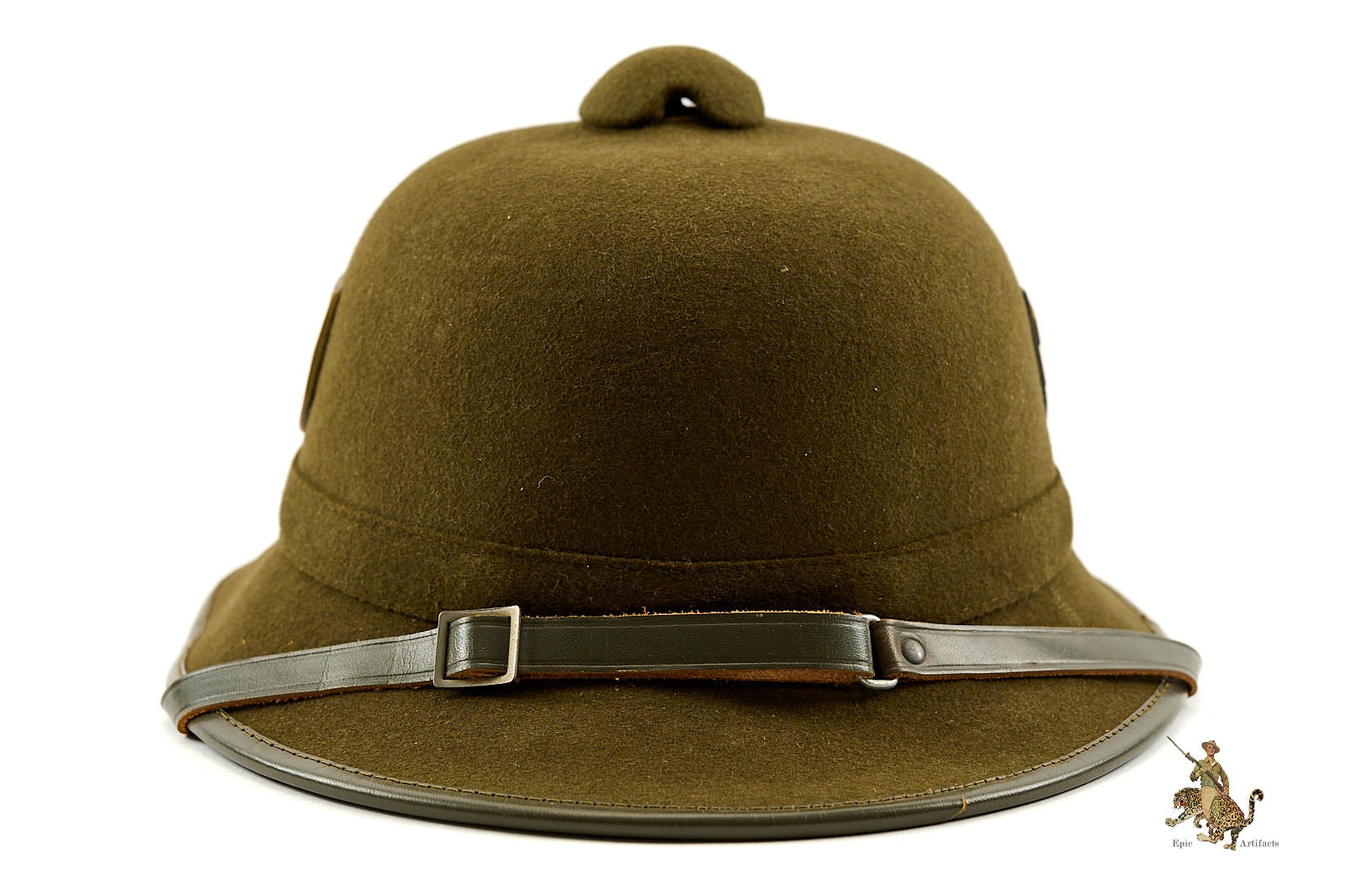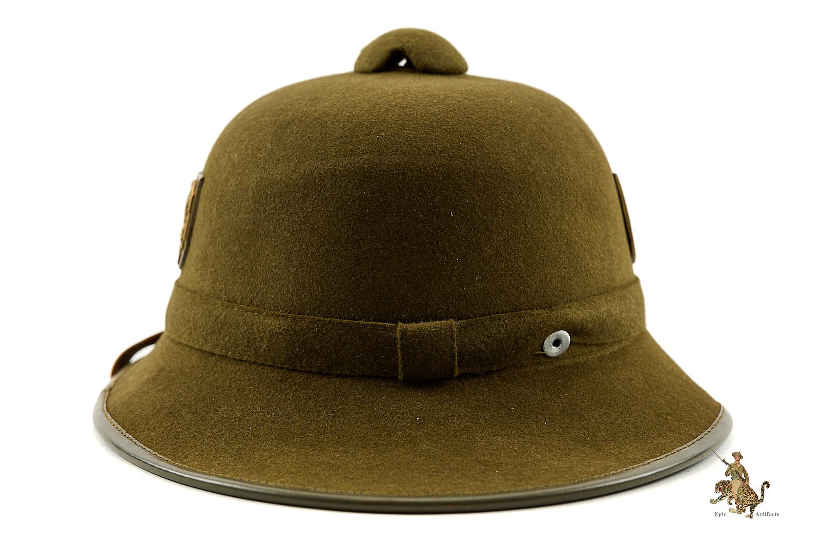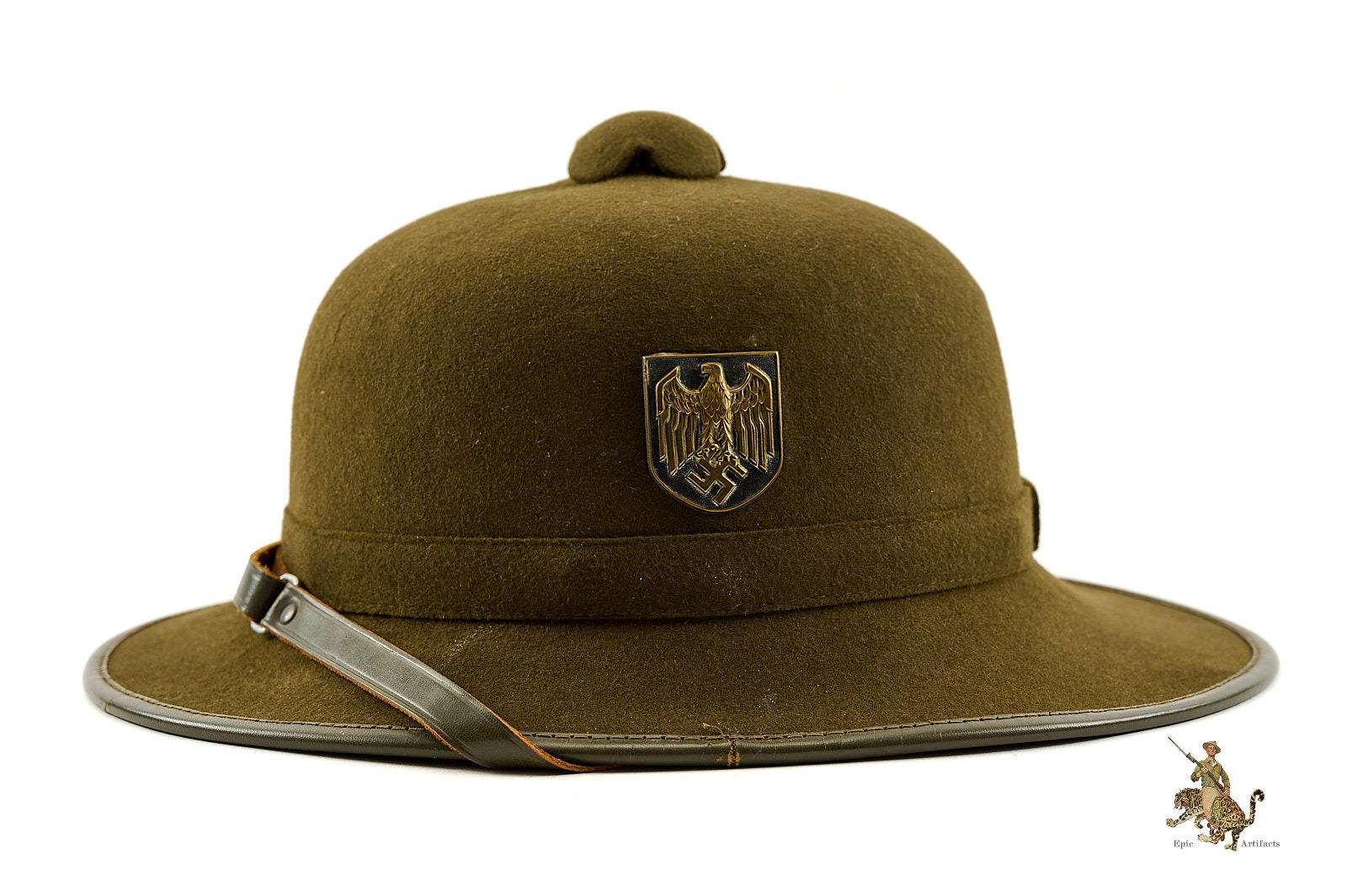 Historical Description: The pith helmet is one of the most iconic aspects of the tropical uniform worn by German personnel in WWII. Besides being worn by Rommel’s Afrikakorps, pith helmets were also worn in all; areas on the Southern Front where tropical uniforms were issued, including Italy and the Mediterranean, and southern Russia. Pith helmets were part of the uniform issued by the German Army, Luftwaffe, Kriegsmarine, and the Waffen-SS. The chief visible difference among the pith helmets used by these various organizations, were the metal badges affixed to each side. These were made in the style of the branch decals used on the steel helmet. Early pith helmets were made with a twill fabric outer covering. Later, second pattern examples were covered with felt. As German troops withdrew from Afrika, many pith helmets sat unissued in warehouses, where they were recovered by Allied forces at the end of the war; at one time, later pattern examples were relatively common. With the passage of time, complete original examples, especially in nice condition, have become much harder to find.