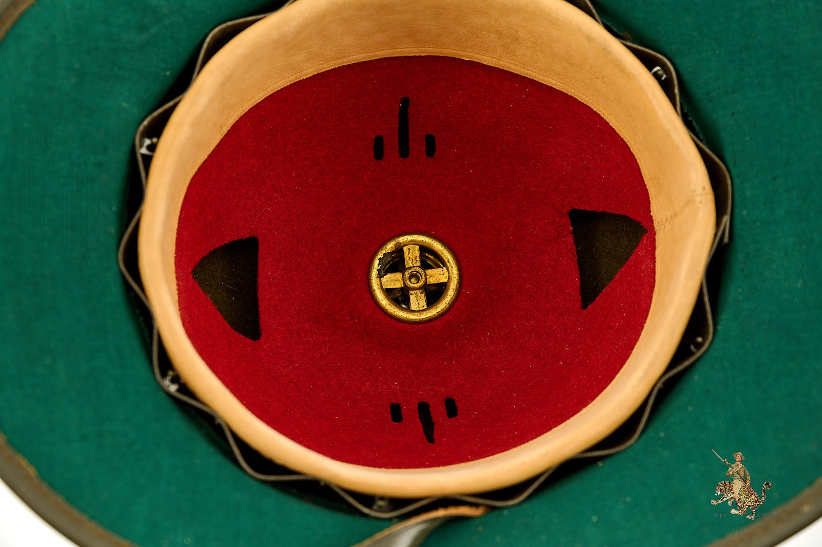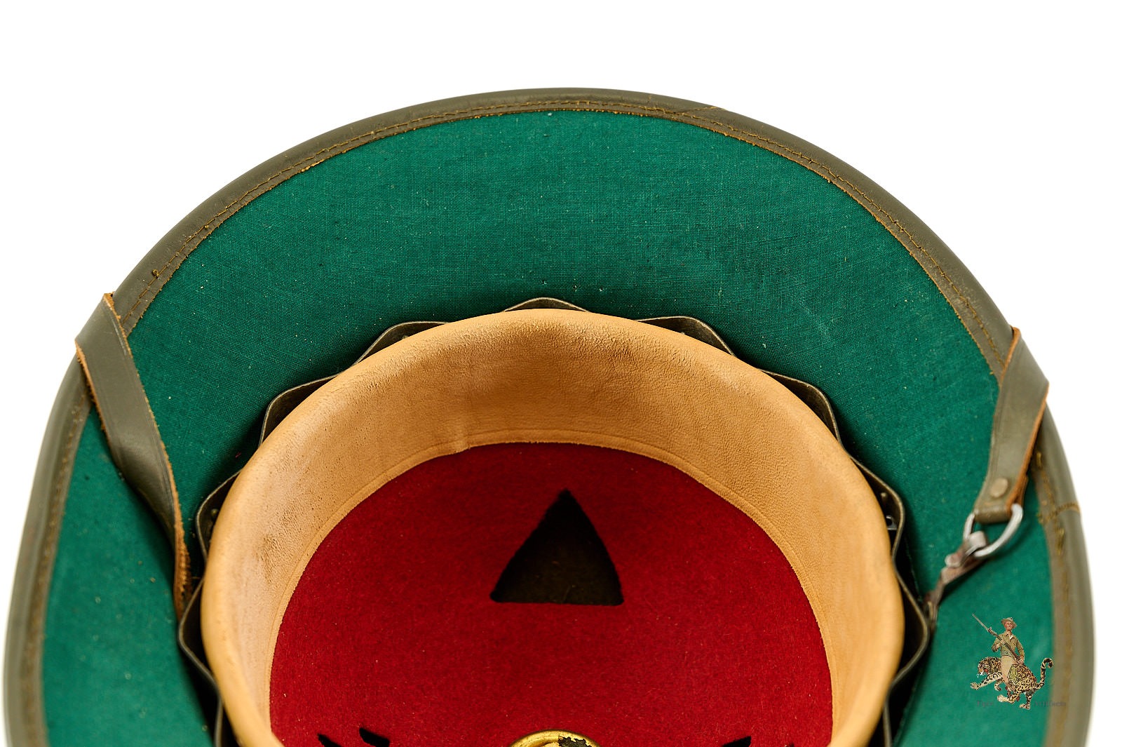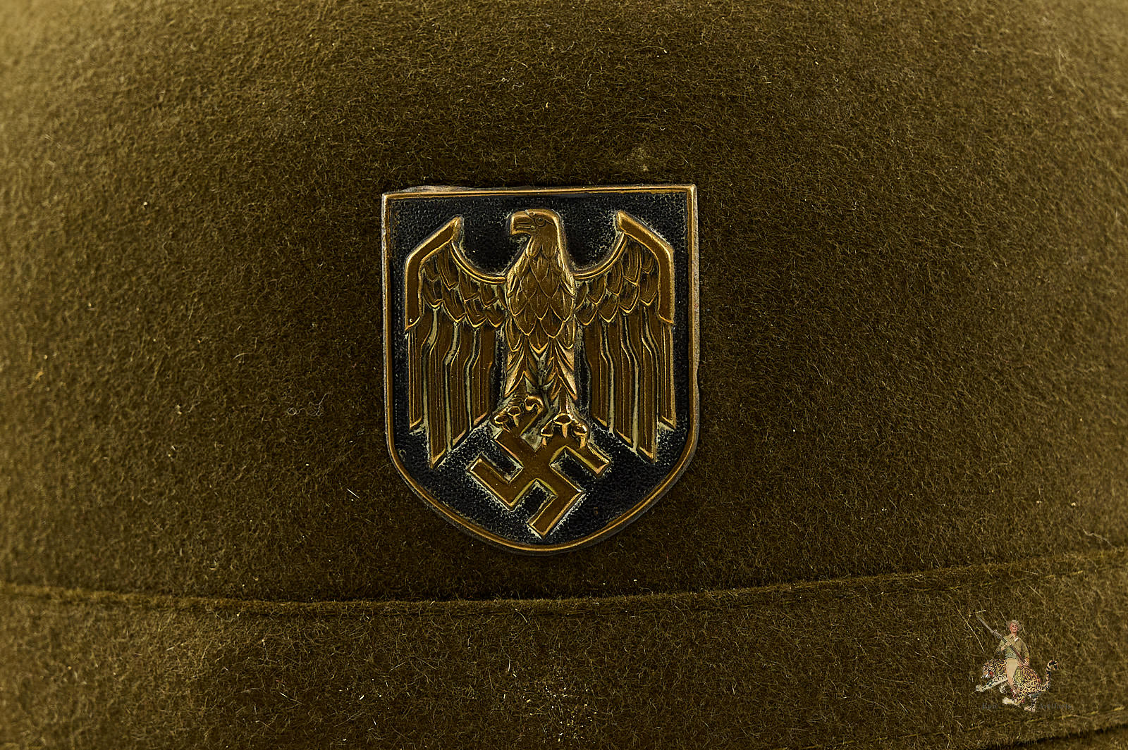 Historical Description: The pith helmet is one of the most iconic aspects of the tropical uniform worn by German personnel in WWII. Besides being worn by Rommel’s Afrikakorps, pith helmets were also worn in all; areas on the Southern Front where tropical uniforms were issued, including Italy and the Mediterranean, and southern Russia. Pith helmets were part of the uniform issued by the German Army, Luftwaffe, Kriegsmarine, and the Waffen-SS. The chief visible difference among the pith helmets used by these various organizations, were the metal badges affixed to each side. These were made in the style of the branch decals used on the steel helmet. Early pith helmets were made with a twill fabric outer covering. Later, second pattern examples were covered with felt. As German troops withdrew from Afrika, many pith helmets sat unissued in warehouses, where they were recovered by Allied forces at the end of the war; at one time, later pattern examples were relatively common. With the passage of time, complete original examples, especially in nice condition, have become much harder to find.