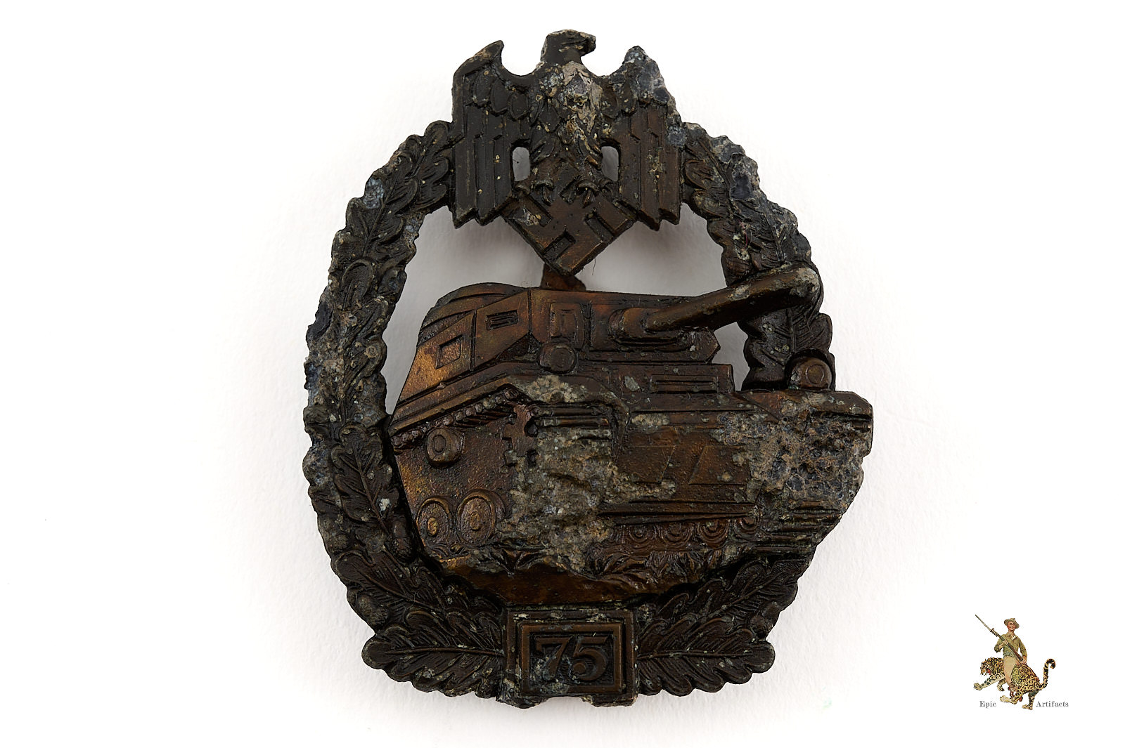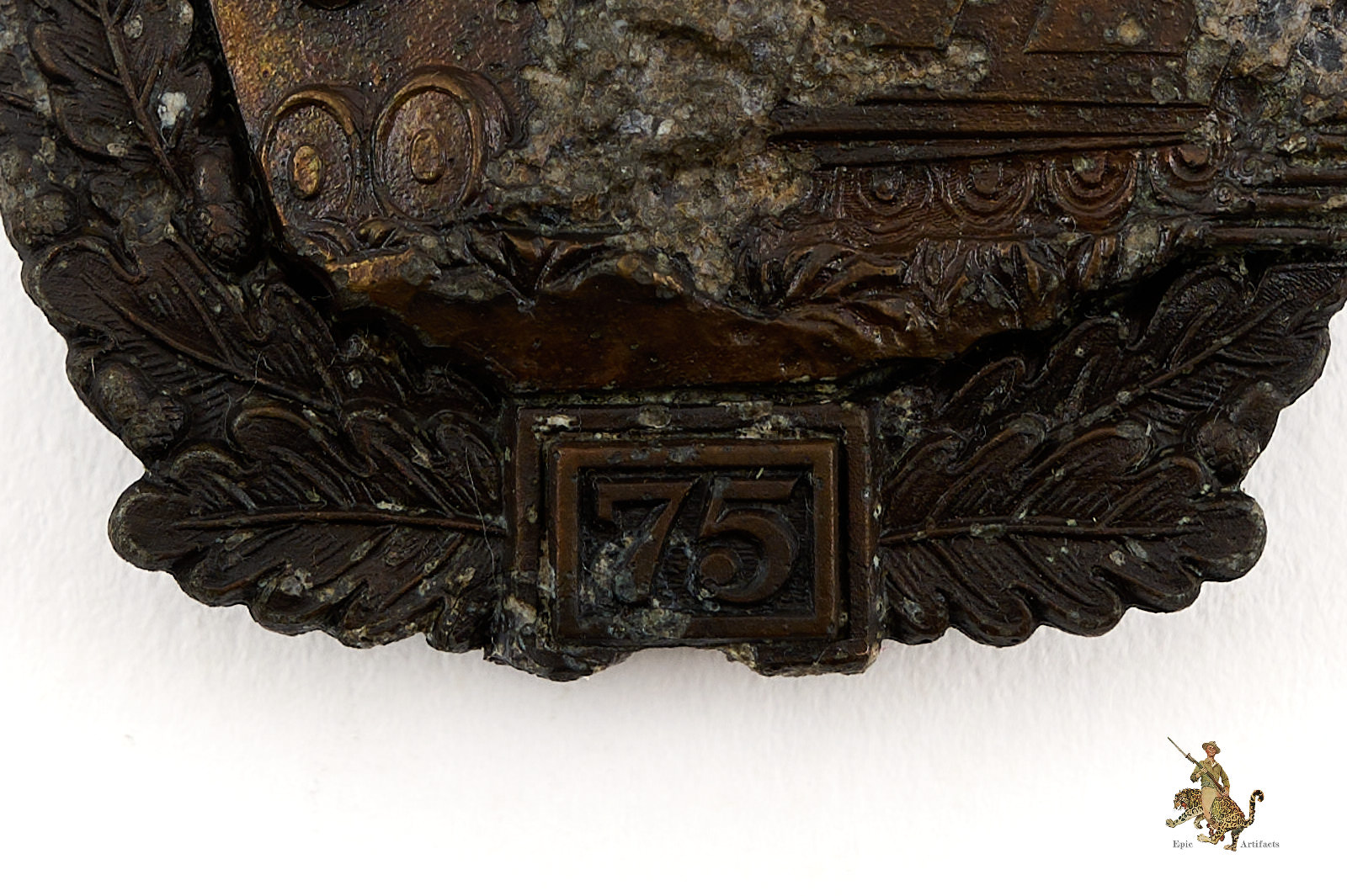 Product Description: An extraordinarily rare survivor of frontline armored warfare, this 75 Engagement Panzer Assault Badge stands among the most elusive grades within the Panzerkampfabzeichen series. Instituted in June 1943 to recognize extended combat service far beyond the initial award thresholds, the higher engagement grades were produced in extremely limited numbers, with the 75 Engagement badge ranking as one of the most difficult variants to obtain.