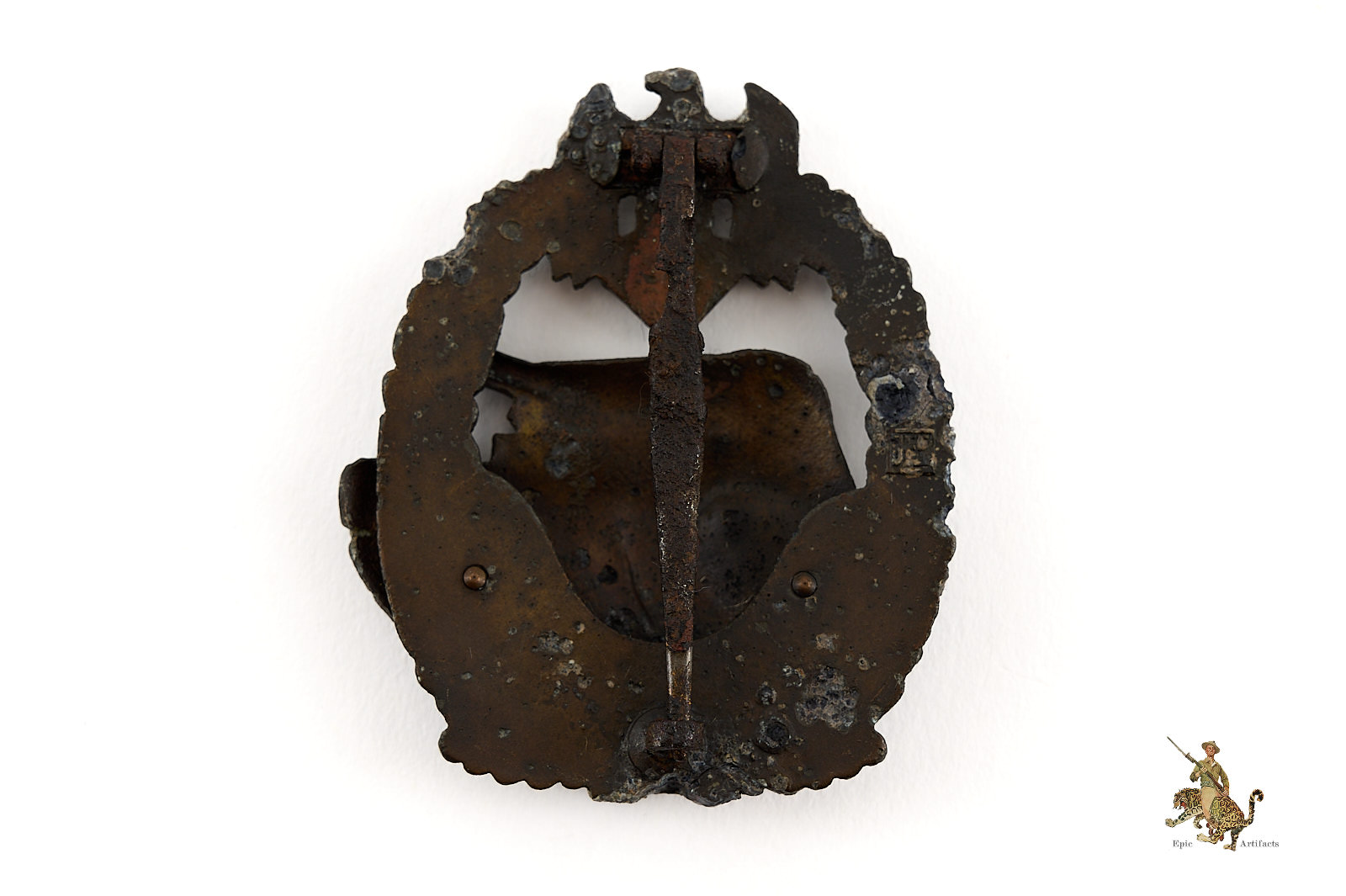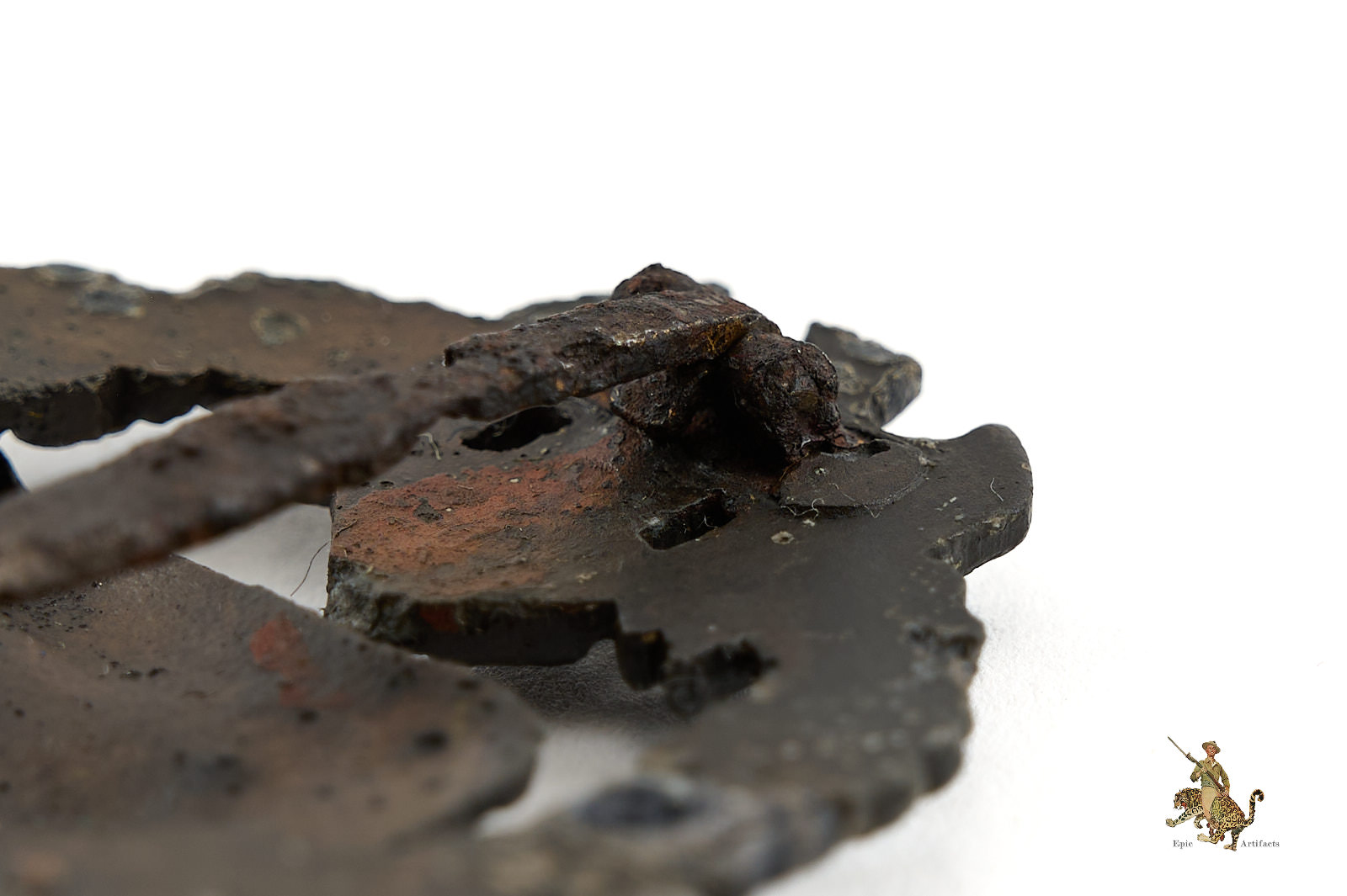 Struck in zinc, the badge exhibits honest age and unmistakable period wear. Natural oxidation and corrosion are present across the surface, imparting a timeworn character that reflects its long history. Traces of the original bronze wash remain visible within the recessed areas, lending subtle depth to the oak leaves, Panzer silhouette, and national eagle. The remaining finish, now softened by decades, creates the rugged, battlefield aesthetic advanced collectors expect from authentic, untouched examples.