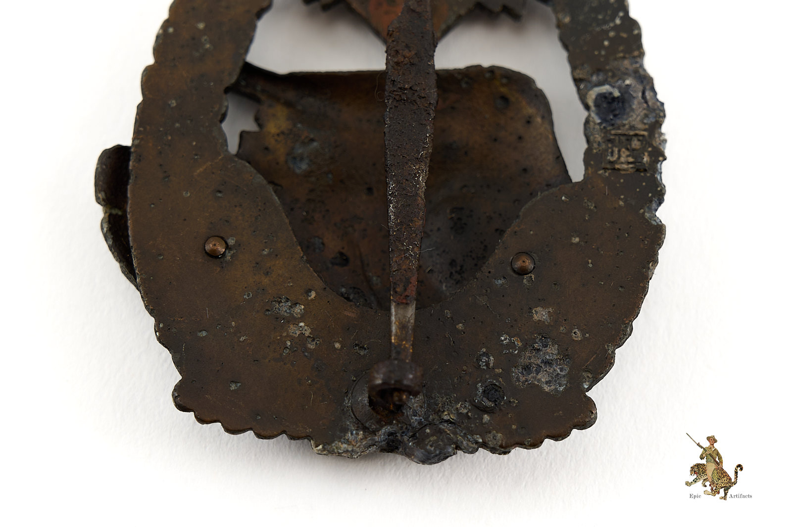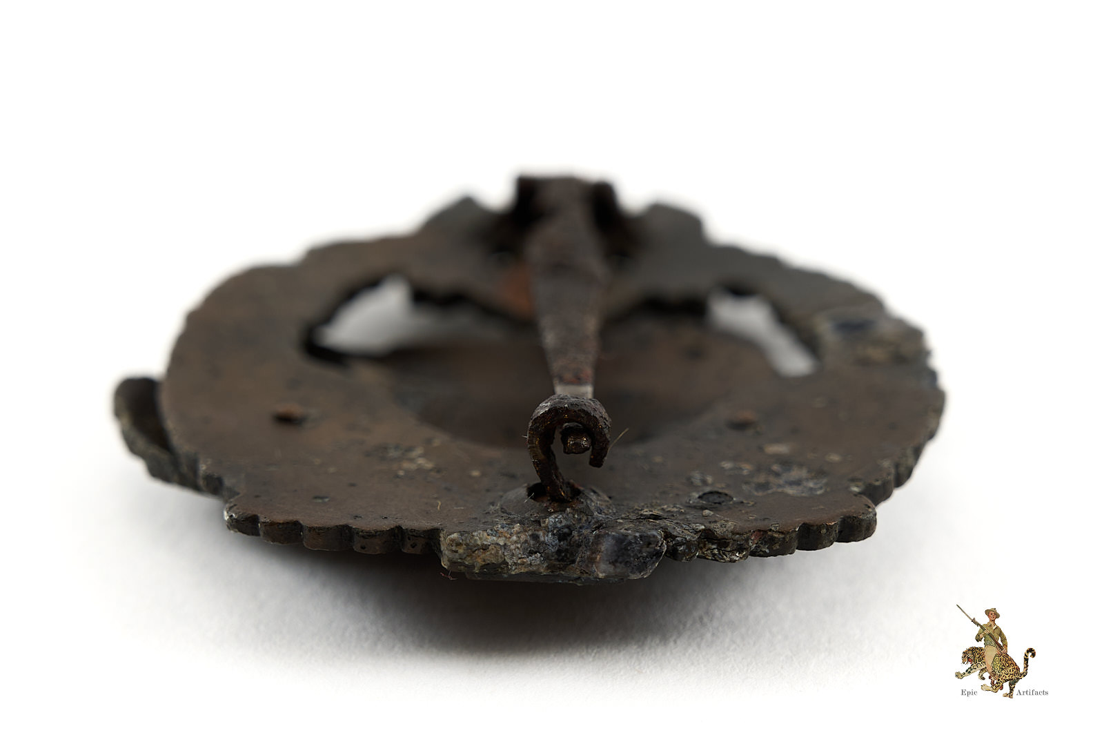 The reverse retains its original banjo-style pin assembly and soldered catch, both consistent with wartime manufacture. Corrosion is evident to the hardware, and based on the pattern and extent of surface deterioration, we believe this example may have been ground recovered. A small portion of the pin is missing along one side, noted for complete transparency. The reverse is clearly marked “JFS,” denoting production by Josef Feix & Sohn, a respected and well-documented maker of Panzer Assault Badges. The pin itself is extremely fragile due to age and corrosion, and we would not recommend attempting to open or flex it. The remaining hardware is intact and correct for the period.