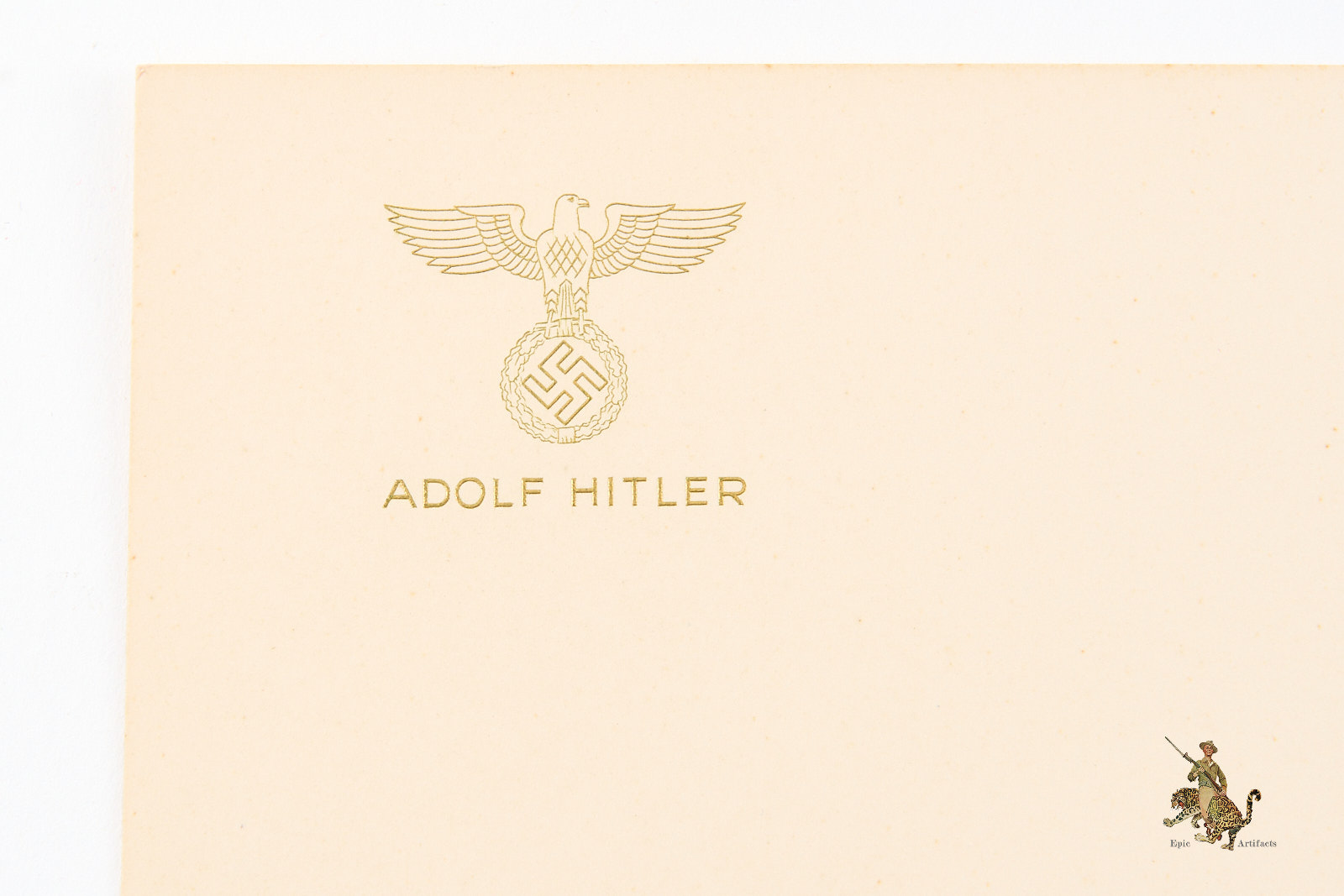 Product Description: An impressive and well-preserved Adolf Hitler Correspondence Stationery Card – München, dating to the period of the Second World War. The unused card is printed with a finely executed raised gilt Reich eagle positioned above the name Adolf Hitler, with München elegantly placed to the side. Measuring approximately 8 x 5 inches, the card exhibits mild toning and slight discoloration consistent with age, yet maintains strong visual appeal and crisp embossing. A rare surviving example of official correspondence material from the Führer’s office, notable for its striking presentation and historical significance.