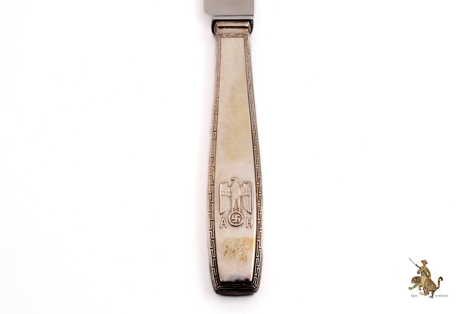 Product Description:  Own a remarkable piece of history with this original Adolf Hitler formal pattern dinner knife, a rare and highly sought-after artifact from World War II. Crafted with exceptional quality and elegance, this silver knife was personally used by Hitler and his guests during state banquets, formal dinners, and gatherings at his residences. This distinguished piece features the prestigious Greek Key pattern, the most desirable of all Hitler’s silverware designs. The handle showcases intricate geometric detailing, complemented by a political-style Nazi eagle and swastika emblem, flanked by the initials “A” and “H” for Adolf Hitler. The reverse bears the hallmarks of Brückmann, a renowned German silversmith, along with a crescent, crown emblem, and “800” silver purity stamp—indicating 80% pure silver, a standard German alloy of the era. The knife is 10 inches in length.
