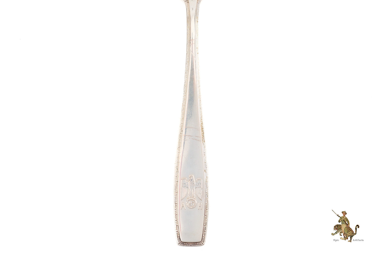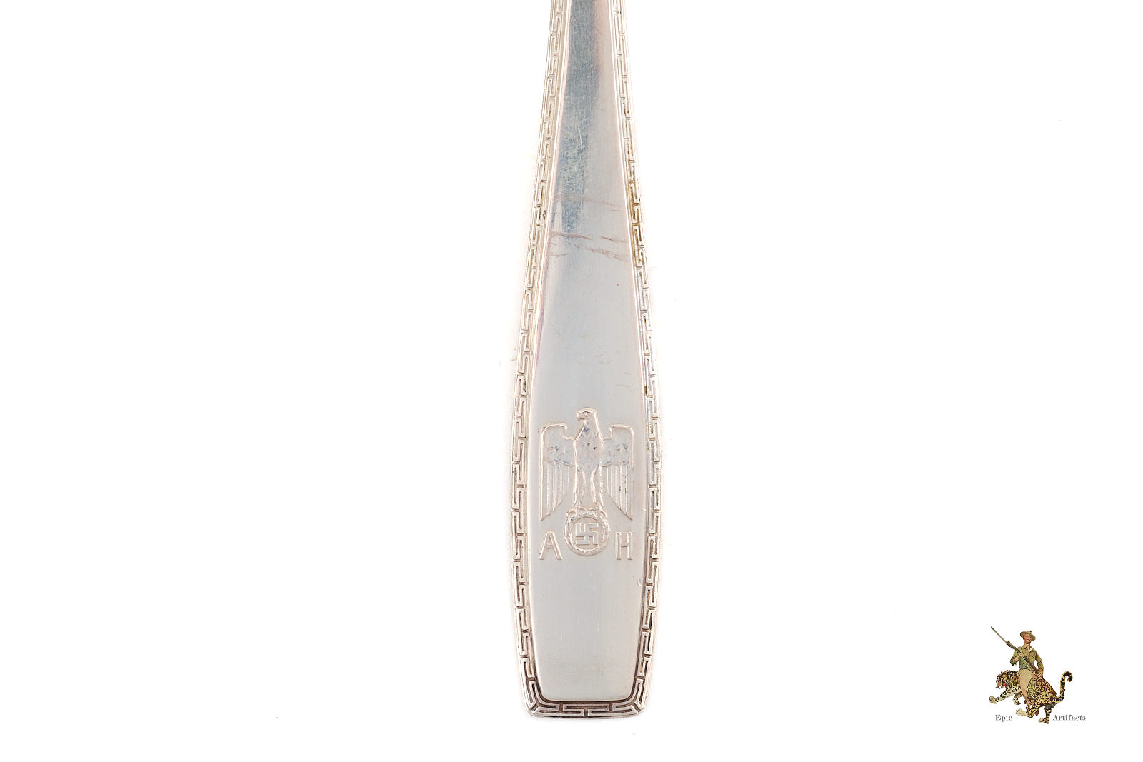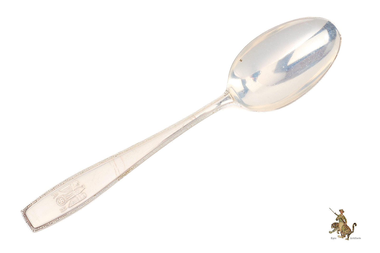 Historical Description: The German military and civil elite formed a sort of aristocratic class in Germany before WWII. As was fitting for their status, they used various types of luxury goods including unique, personalized items. For many Nazi leaders, this included sets of silverware and china for use on formal occasions and sometimes for informal use as well. Some of the most highly regarded silversmiths and glass and porcelain manufacturers in Germany and elsewhere were employed to create these fine wares, which were adorned with emblems ranging from initials, monograms and family crests, to insignia of Nazi organizations. In the case of the highest Nazi leader, Adolf Hitler, he had a number of sets of silverware, place settings, linens and service items, used for different functions in his various homes and in the places where he entertained domestic and foreign leaders. When American troops entered Germany in the closing months and weeks of the war, these personal items that had belonged to infamous Nazis were very eagerly sought after as souvenirs. Today, these items, especially those that belonged to the highest echelon of German leadership, are generally regarded as high-end collectibles.