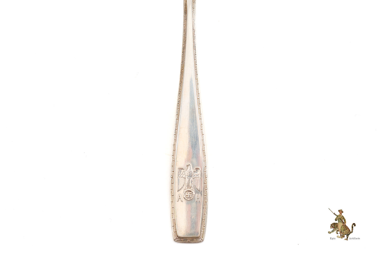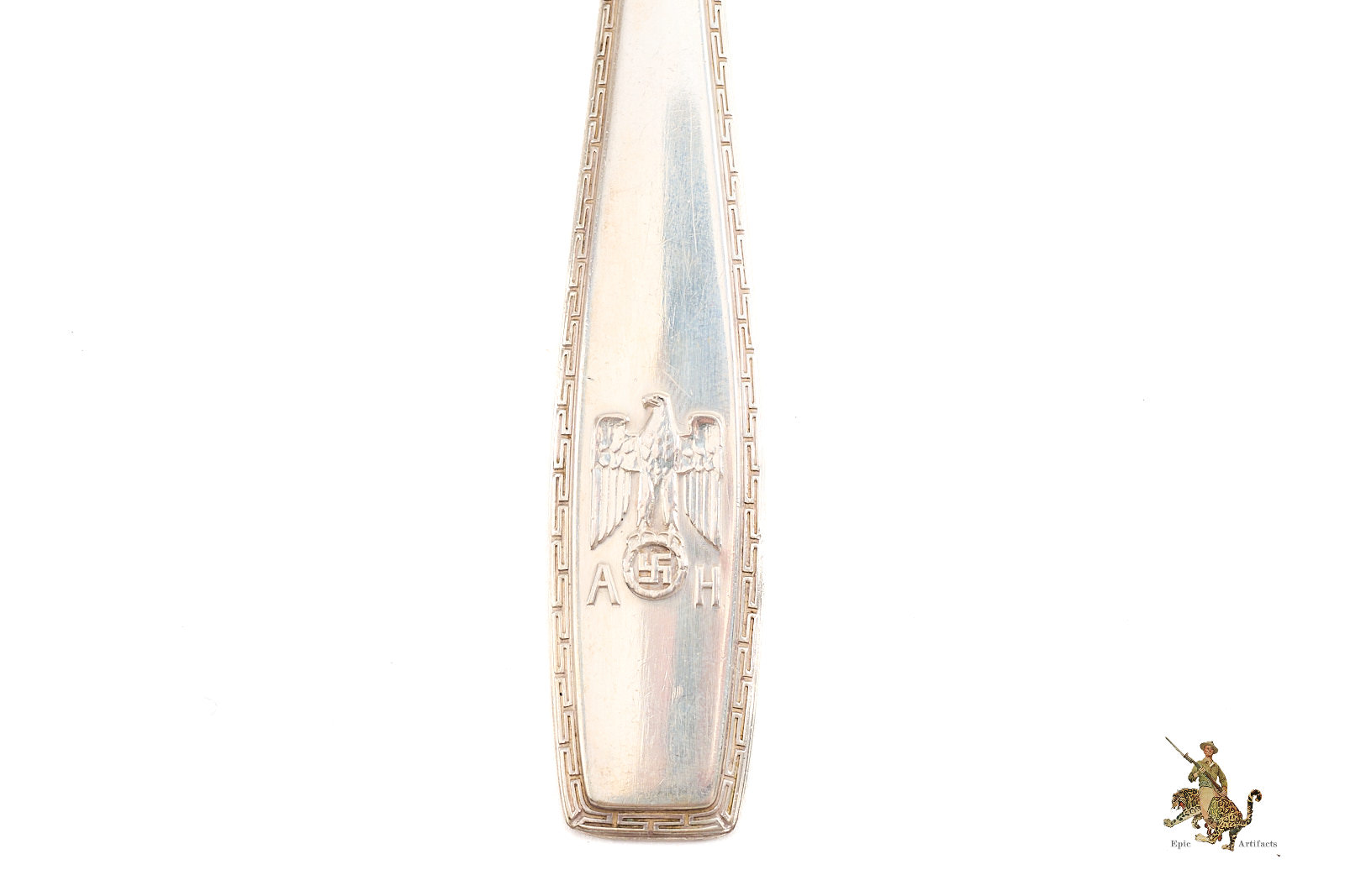 Historical Description: The German military and civil elite formed a sort of aristocratic class in Germany before WWII. As was fitting for their status, they used various types of luxury goods including unique, personalized items. For many Nazi leaders, this included sets of silverware and china for use on formal occasions and sometimes for informal use as well. Some of the most highly regarded silversmiths and glass and porcelain manufacturers in Germany and elsewhere were employed to create these fine wares, which were adorned with emblems ranging from initials, monograms and family crests, to insignia of Nazi organizations. In the case of the highest Nazi leader, Adolf Hitler, he had a number of sets of silverware, place settings, linens and service items, used for different functions in his various homes and in the places where he entertained domestic and foreign leaders. When American troops entered Germany in the closing months and weeks of the war, these personal items that had belonged to infamous Nazis were very eagerly sought after as souvenirs. Today, these items, especially those that belonged to the highest echelon of German leadership, are generally regarded as high-end collectibles.