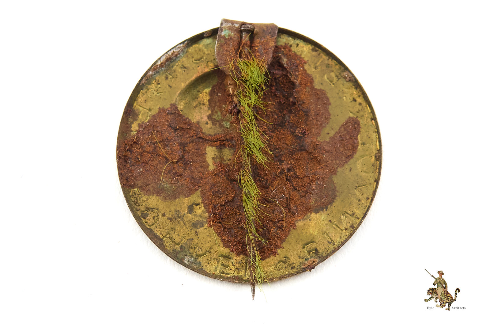 Product Description: A WHW (Winterhilfswerk des Deutschen Volkes) Adolf Hitler Gold TInnie featuring profile and motto “Ein Volk – Ein Reich – Ein Fuhrer”, issued as part of the Nazi regime’s annual winter relief fundraising campaign. Struck in tin and painted gold, the badge was given to donors as a visible token of support for the National Socialist welfare program. The reverse retains its original pin, and shows some corrosion and remnants of being mounted in an album of some sort. A nice example of Nazi-era propaganda and charitable engagement, representative of early Third Reich social initiatives.