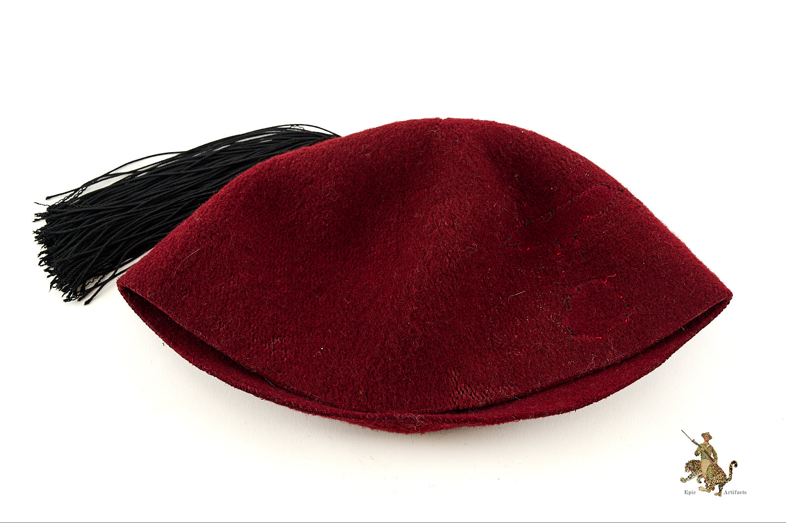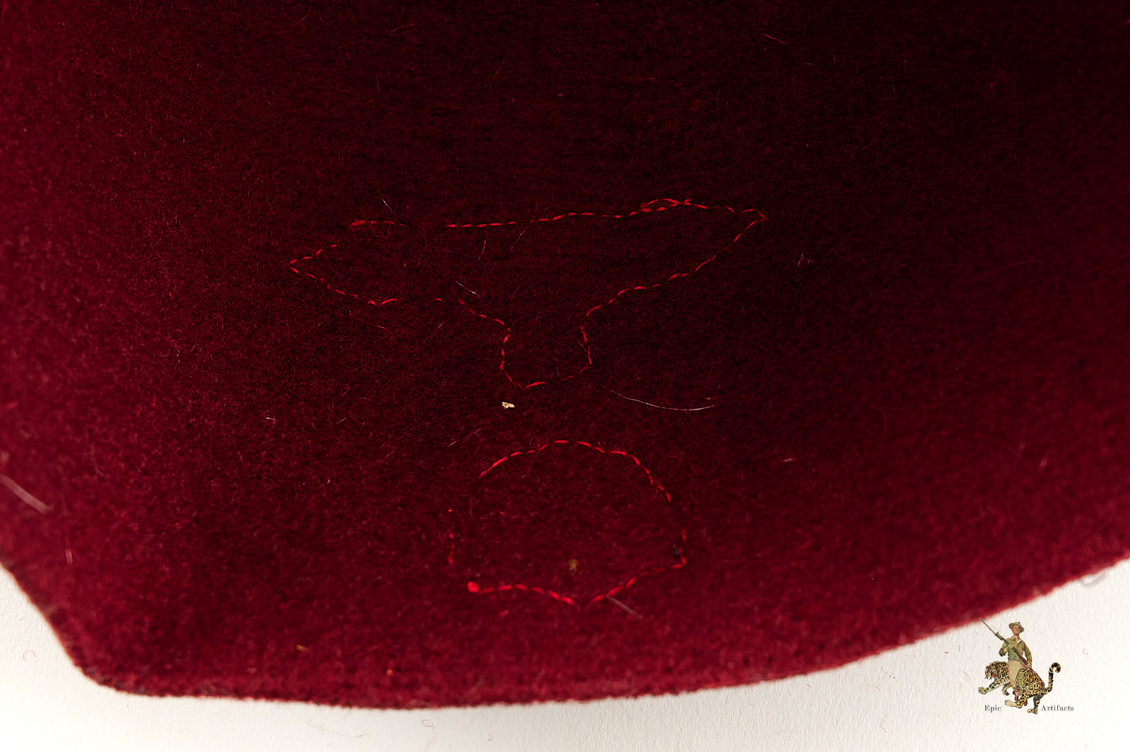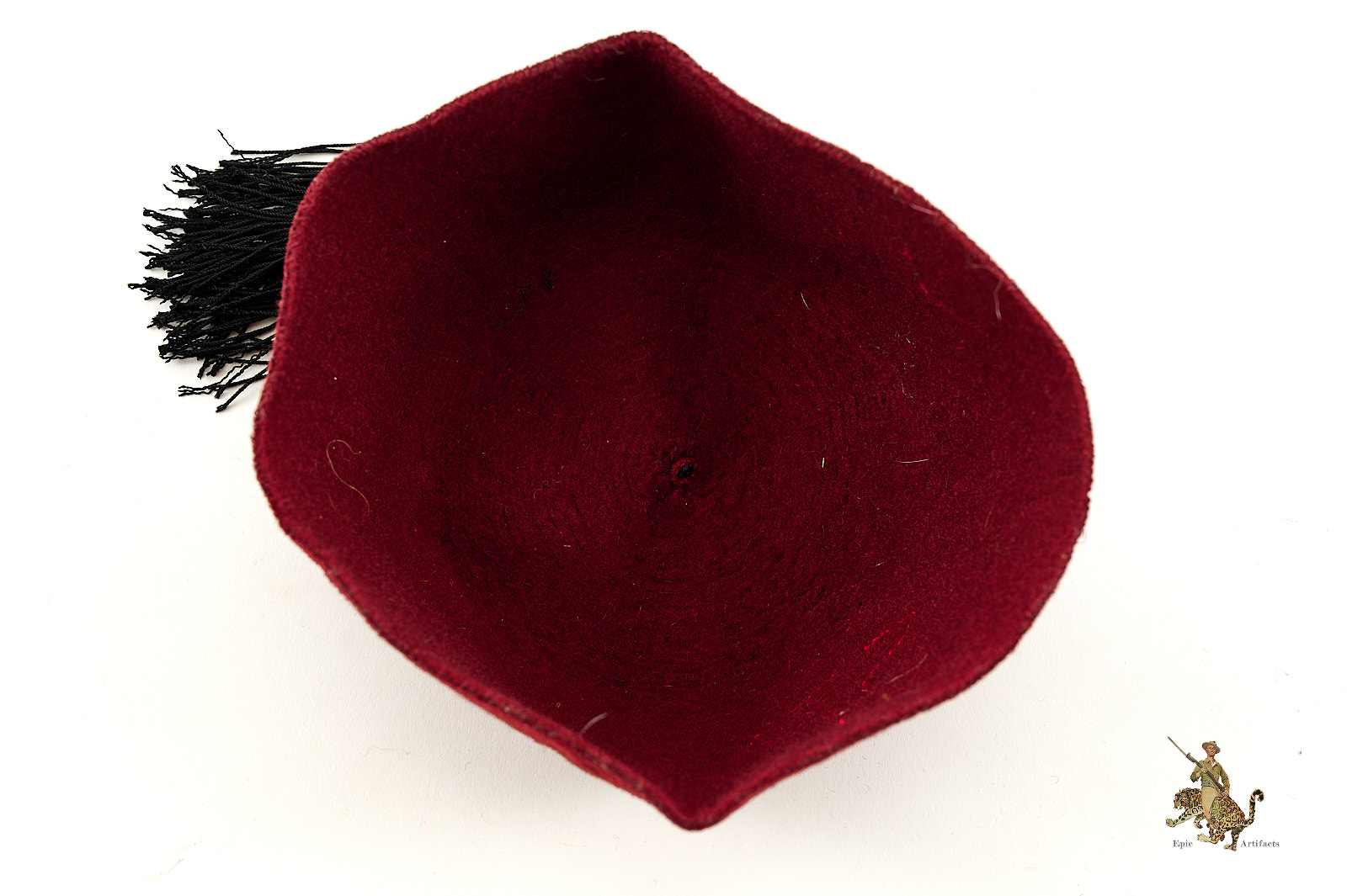Product Description: An outstanding example of a WWII German SS Fez with Tassel, as worn by foreign volunteer troops of the Waffen-SS, including the “Handschar” and “Kama” Divisions. This fine wool fez remains in excellent overall condition, exhibiting only a few small areas of light thinning or mothing consistent with age. The original black tassel is fully intact and well-preserved.