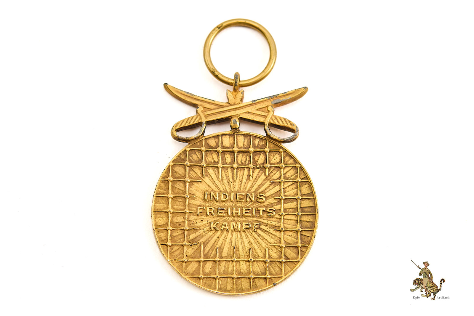 Product Description: A rare Azad Hind Gold Medal with Swords, attributed to possible manufacture by Rudolf Souval, associated with the Free Indian cause during the Second World War. Awarded for service in support of the Azad Hind movement, the medal was conferred upon both Indian and German recipients, reflecting the international dimension of the struggle against British colonial rule.