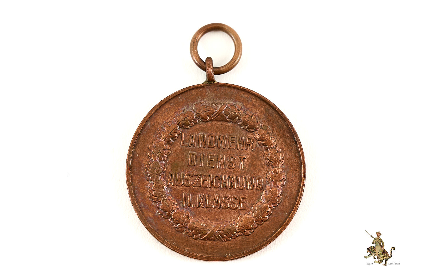 Product Description:  A fine example of the Bavarian Landwehr Service Medal – 2nd Class, awarded for World War I service within the Kingdom of Bavaria. The medal presents a pleasing copper tone with an even, well-developed patina, enhancing the clarity of its design and overall visual appeal.
