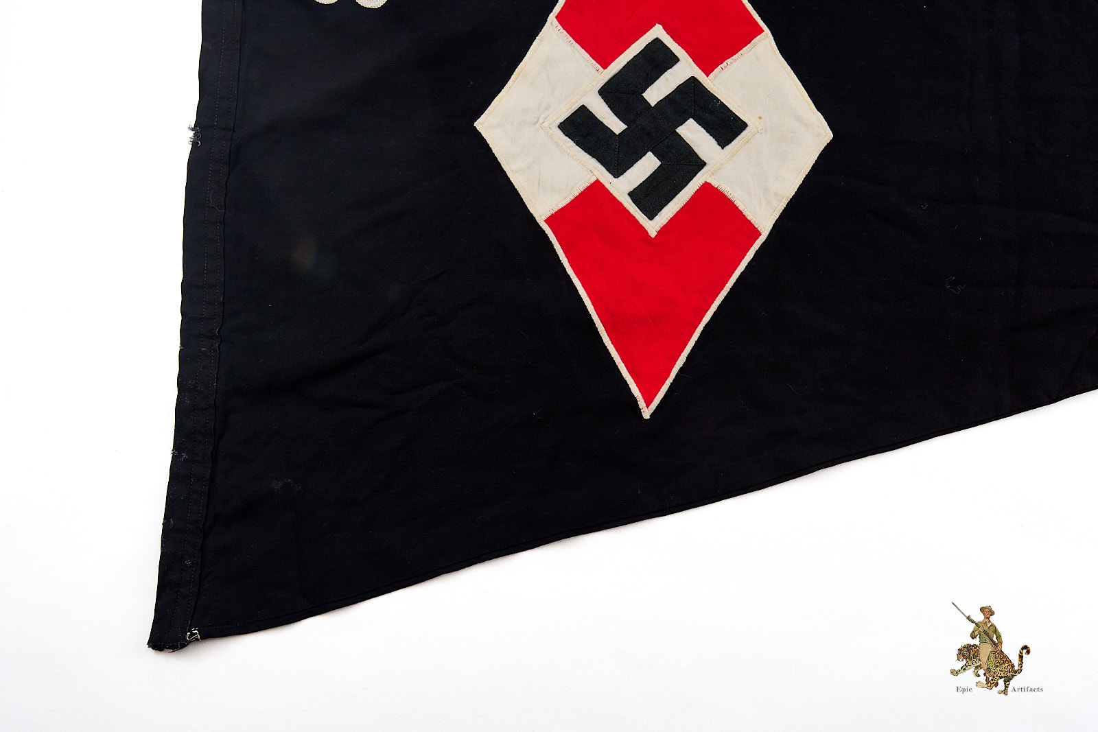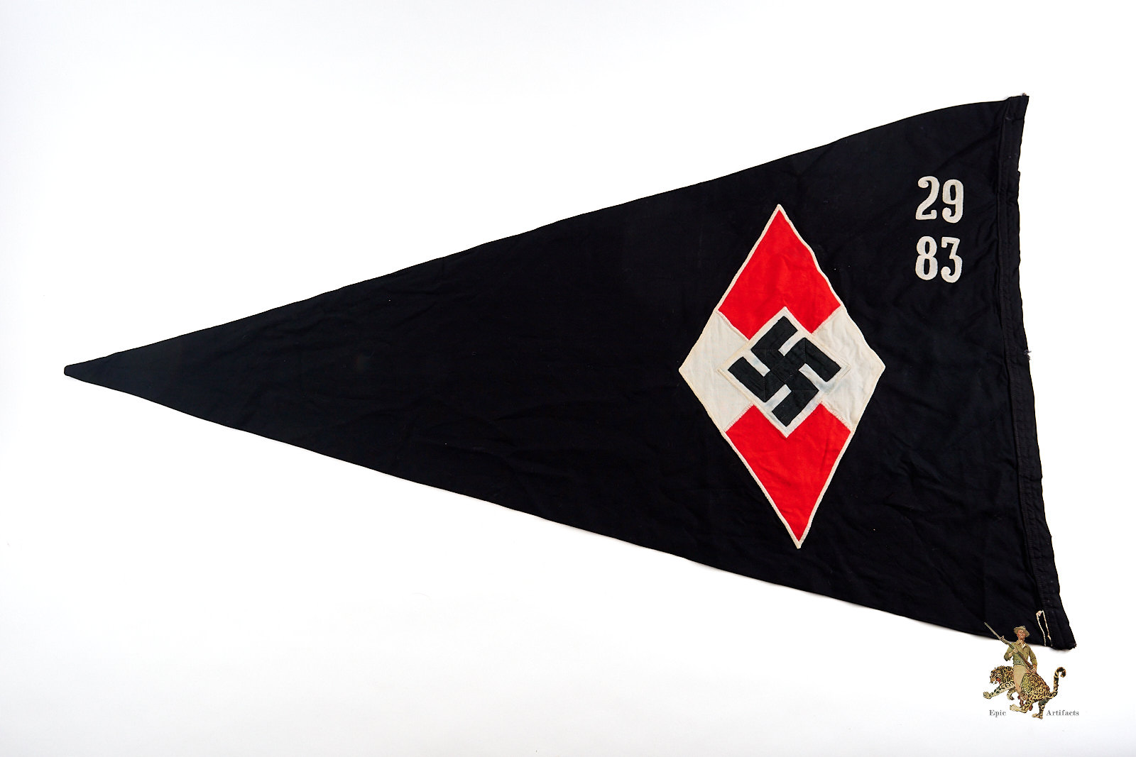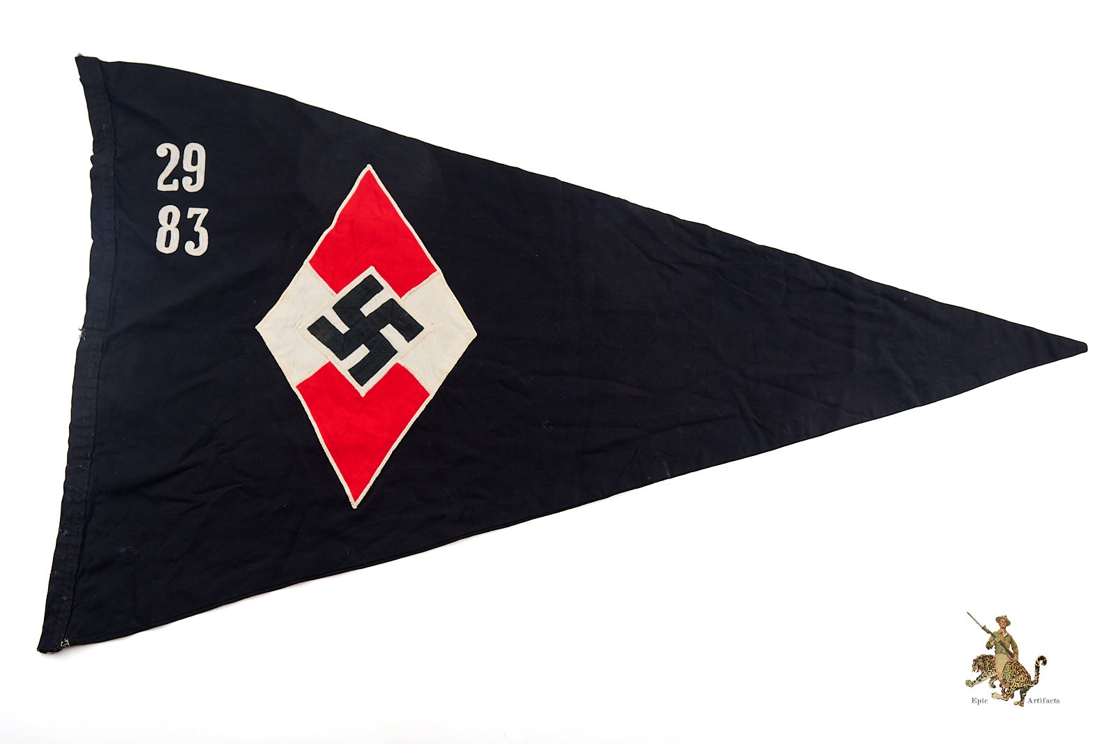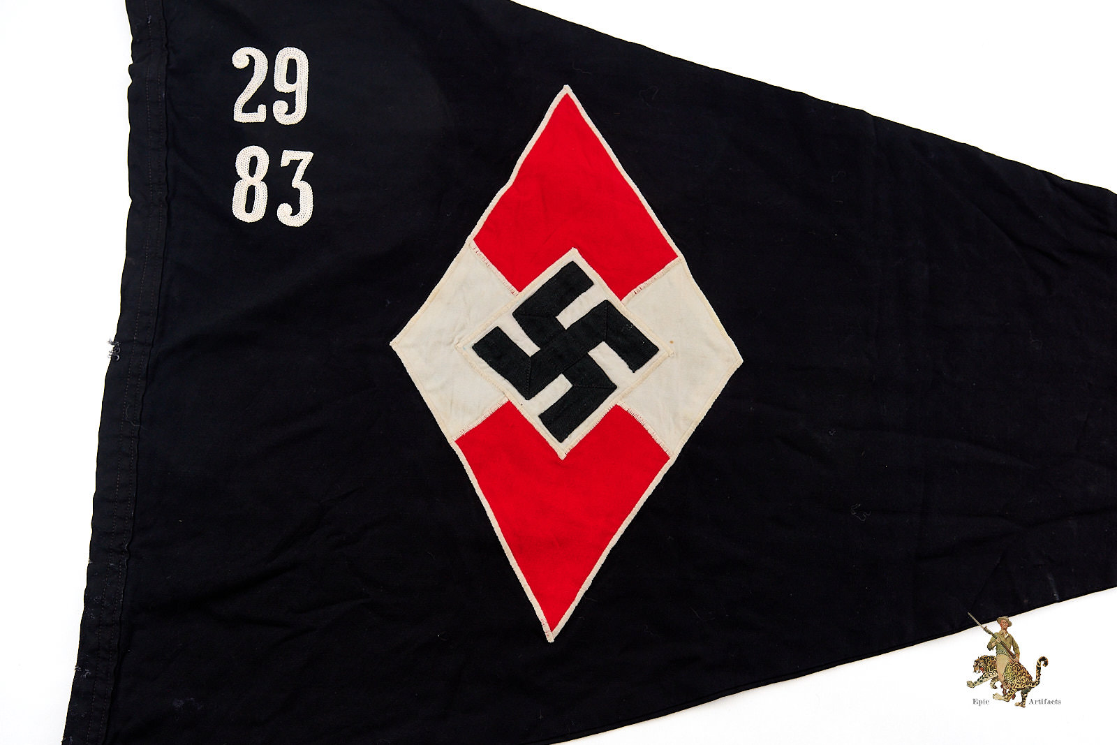Product Description: An early and well-preserved example of a BDM Young Girls Pennant, Black, marked to Jungmädelgruppe 29 of Jungmädeluntergau 83, dating from the pre-1936 period. Constructed of fine black cloth, this triangular pennant features the distinctive Hitler Youth diamond emblem with unit numerals executed in the earlier chain-stitched method, characteristic of the early organization period before standardization of machine embroidery.