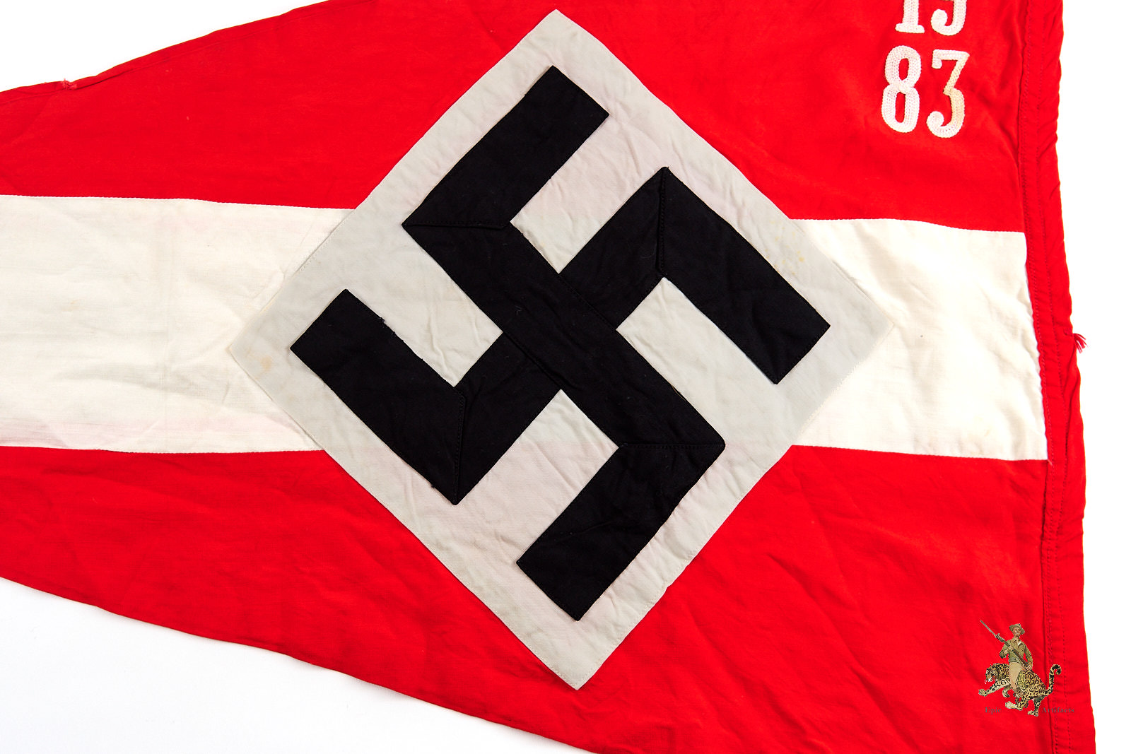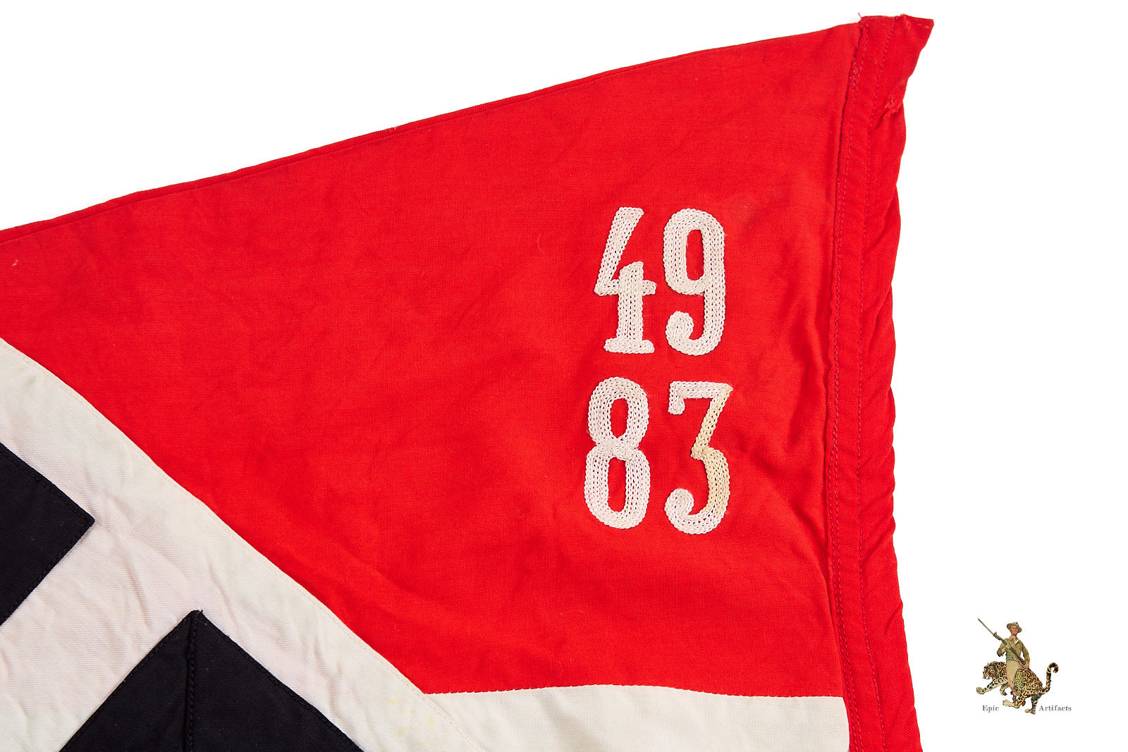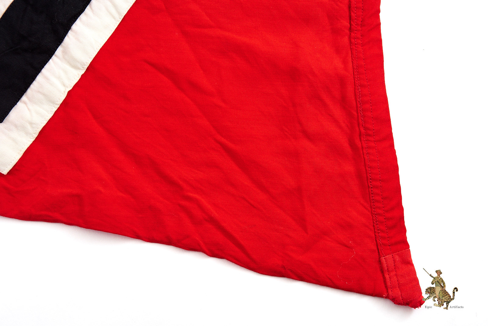 Historical Description: During the Third Reich and WWII, a wide variety of flags and pennants were used on German cars and vehicles. In the military, vehicle flags and pennants were used to indicate branch or rank, or specific command roles. The various civilian organizations also had vehicle flags and pennants for members of their organization or to denote the vehicles of officers, leaders or people in specific roles. Even political leaders had their own flags which were often rank specific. Some of the flags, especially military ones, were simply printed, and some were machine woven or stitched, while the flags for political leaders and the highest ranking military personnel were more decorative and often elaborately hand embroidered in bullion wire. Some vehicle flags were mass produced, including simple national flag type swastika emblem pennants that could have been bought by any patriotic supporter. Others were unique. These flags were attractive souvenirs for GI troops at the end of the war, and are eagerly collected today.