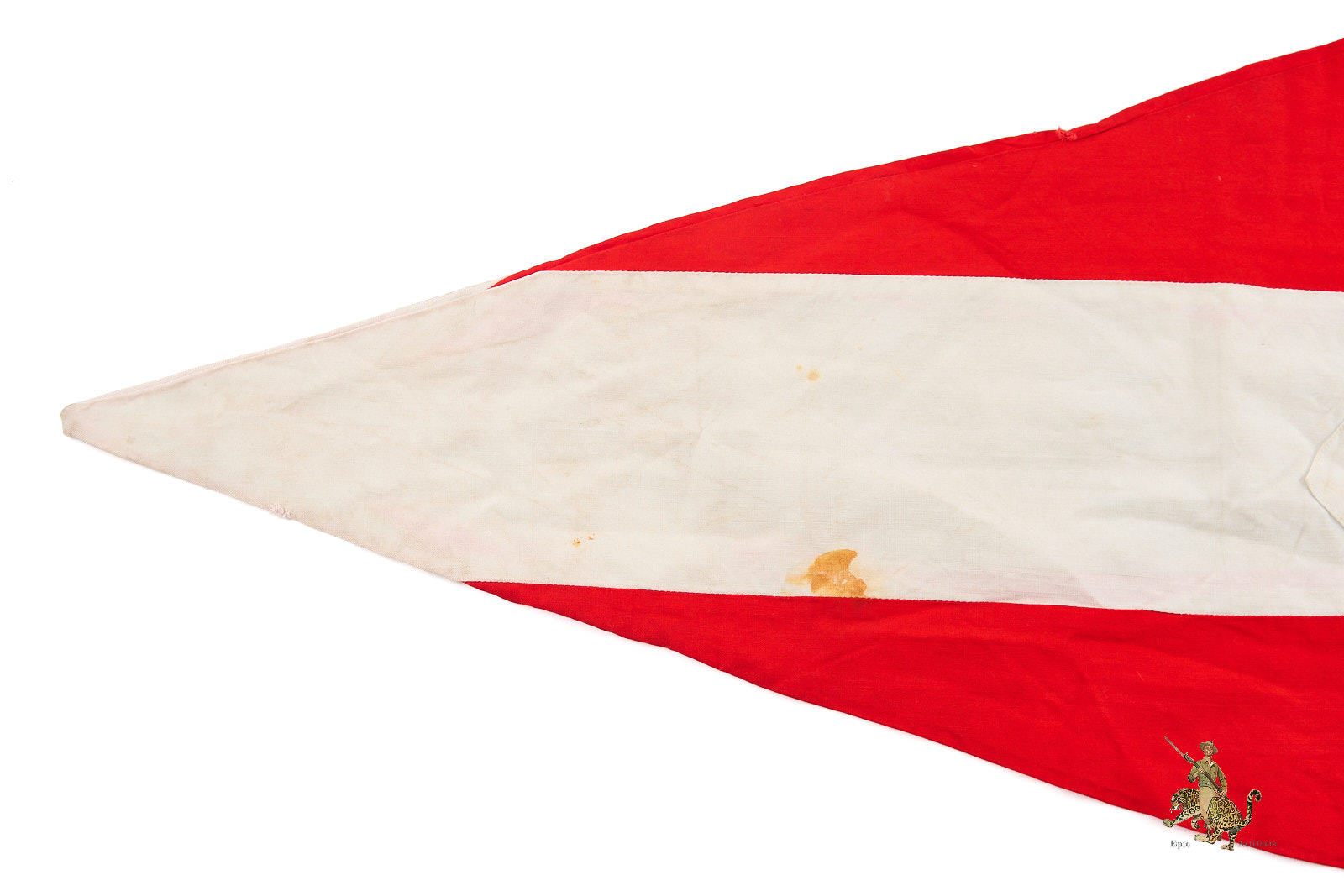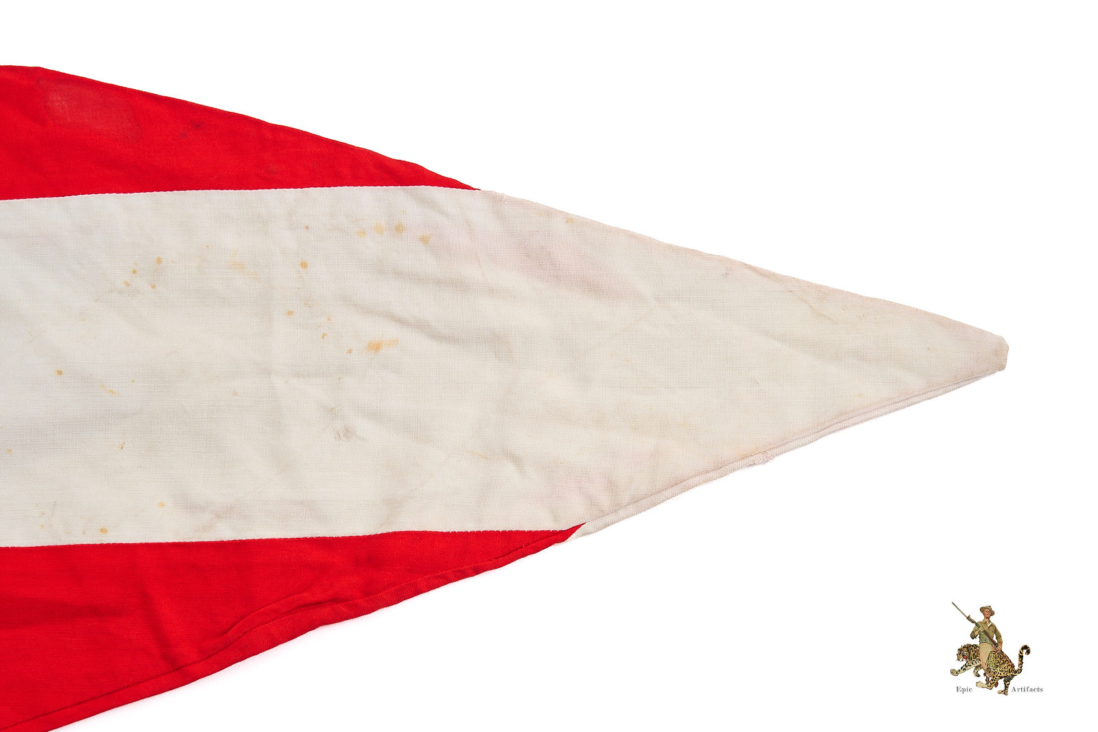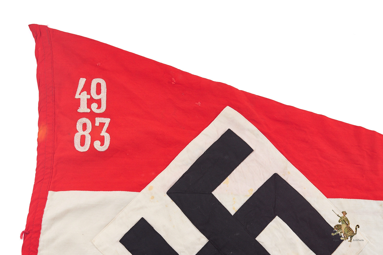 Historical Description: During the Third Reich and WWII, a wide variety of flags and pennants were used on German cars and vehicles. In the military, vehicle flags and pennants were used to indicate branch or rank, or specific command roles. The various civilian organizations also had vehicle flags and pennants for members of their organization or to denote the vehicles of officers, leaders or people in specific roles. Even political leaders had their own flags which were often rank specific. Some of the flags, especially military ones, were simply printed, and some were machine woven or stitched, while the flags for political leaders and the highest ranking military personnel were more decorative and often elaborately hand embroidered in bullion wire. Some vehicle flags were mass produced, including simple national flag type swastika emblem pennants that could have been bought by any patriotic supporter. Others were unique. These flags were attractive souvenirs for GI troops at the end of the war, and are eagerly collected today.
