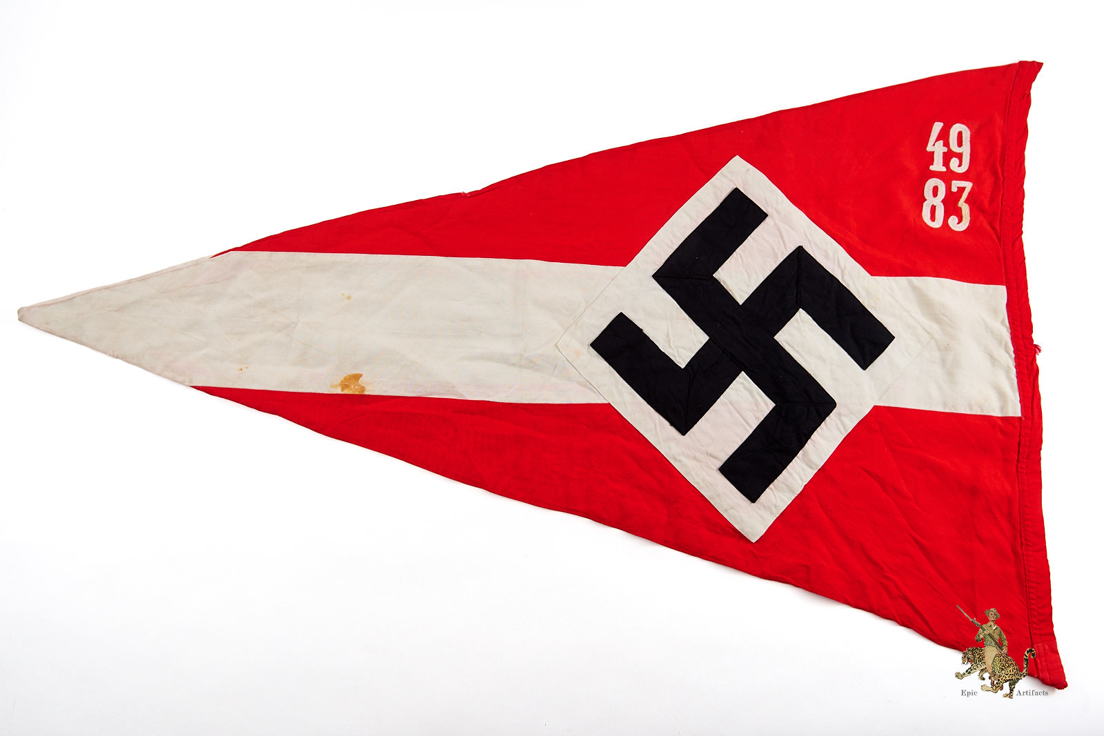 Product Description: An early and well-preserved example of a HJ Hitler Youth Pennant – Red, marked to Jungmädelgruppe 49 of Jungmädeluntergau 83, dating from the post-1936 period. Constructed of fine red cloth, this triangular pennant features the distinctive later Hitler Youth diamond emblem with unit numerals executed in the earlier chain-stitched method, characteristic of the early organization period before standardization of machine embroidery.